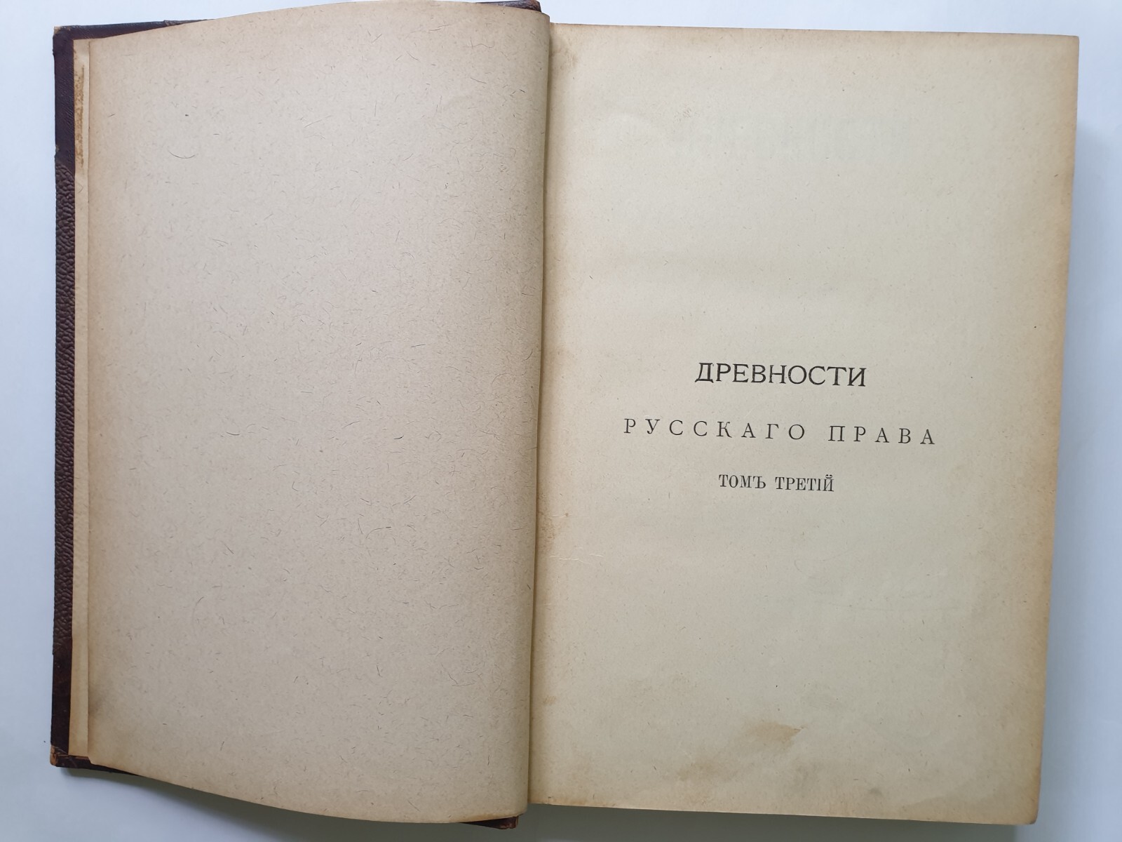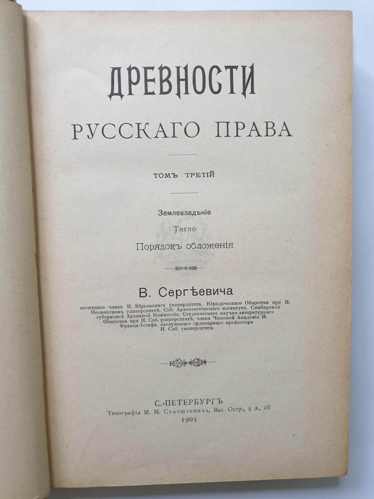 "Древности русского права" Землевладение. Тягло. Порядок обложения. Сергеевич В. Санкт-Петербург : Тип. М.М. Стасюлевича, 1903. Т. 3 496 , [2] с., 230x160mm. В переплетe выполненнoм на фабрике Н.В. Гаевского. Монументальный труд русского историка права Василия Сергеевича Сергеевича, за который в 1911 году ему была присуждена премия графа Сперанского. Трехтомное издание «Древностей русского права» создано самым крупным и ярким представителем историко-юридического направления в русской исторической науке В.И. Сергеевичем. В научном отношении книга во многом превосходит другие работы по истории России, написанные такими известными исследователями как С.М. Соловьев, В.О. Ключевский и др. и принадлежит к числу самых значительных произведений историко-правовой науки за все время ее существования. Книга В.И. Сергеевича посвящена не просто развитию русского права. В ней дана целостная история России, начиная с возникновения классового общества и государства и кончая XVII в. Но только это история не событий, а социального строя России — стержня, сердцевины российского исторического процесса. В труде В.И. Сергеевича блистательно описана картина развития и социально-экономических связей, и юридических отношений, и политической структуры русского общества, включая изменения его государственного строя. Василий Иванович Сергеевич (1832-1910) — профессор истории русского права Санкт-петербургского университета. С 1878 года читал курс юридических древностей в Археологическом институте, в 1897-1899 годах состоял ректором университета. Общее состояние на фото.