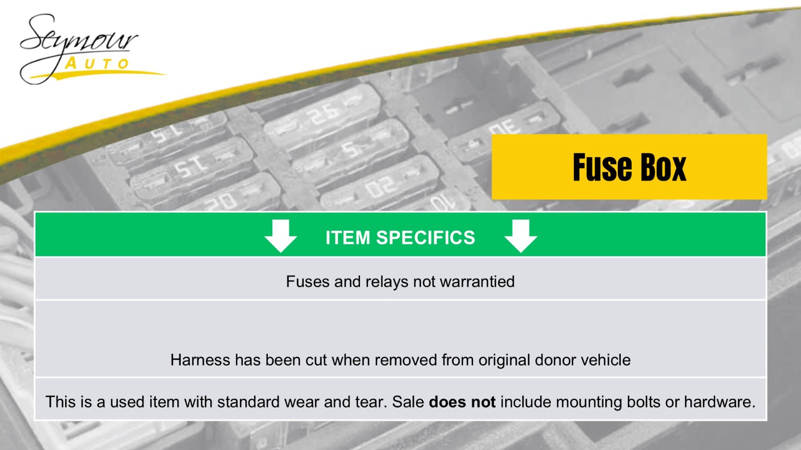 Welcome to our eBay Store! Fuse Box Engine VIN W 8th Digit Romeo Fits 03-05 CROWN VICTORIA 438041 Description ******* SAME DAY SHIPPING ******** Donor Vehicle VIN: 2MEFM74W04X628720 Model: GRAND MAR Year: 2004 Mileage: 78000 (0 = not available or unknown) Stock Number: 019267 Store Number: 1 Part Detail Part Grade: A Part Category: U Part Placement: Notes: 3W7Z14290AB 192023 This part will fit these makes and models with these options CROWN VICTORIA 03-05 VIN W (8th digit, gasoline, Romeo), w/o police package; w/o DRL GRAND MARQUIS 03-05 (VIN W, 8th digit, gasoline, Romeo), w/o DRL MARAUDER 03-04 (4.6L, VIN V, 8th digit), w/o DRL WARRANTY / GUARANTEE Most parts we sell through eBay Motors come with a 30 day money back guarantee unless otherwise stated. The 30 day period starts when you take possession of the part. No labor warranty is provided. In the event a part sold with a warranty fails to operate within the warranty period we will replace the part(s) with a functionally equivalent part or refund the part purchase price, at our option. No refund on deposits or unwanted special order parts or special "cut" items. To return an item you must contact us via eBay Message within the 30 day period to obtain a RMA number (return material authorization). Original shipping charges and return shipping charges are not refunded. Once you obtain an RMA number, ship the item back to Seymour Auto Wrecking 107 New Haven Rd Seymour, CT 06483 along with the RMA number. SHIPPING NOTES ABOUT US HELP Seymour Auto Wrecking ships to US addresses within the 48 states only via UPS ground. No Alaska, Hawaii, Puerto Rico, APO, FPO or PO Box's at this time please. No International shipping is available at this time. Pick up at our facilities is available. Please email us prior to your purchase to arrange pick up. Items will be shipped within 1-2 days of purchase. Please allow 5-10 days for delivery. Most areas in the US are within 5 days. No expedited shipping is available. If an item arrives damaged, please contact us via eBay Message within 24 hours for instructions. If you have a question about a part please contact us BEFORE purchasing. Our main contact method is by eBay Messages. We try to answer all messages within 24 hours. If we are unable to answer your questions before the listing ends the item will be re-listed again soon for you to purchase.