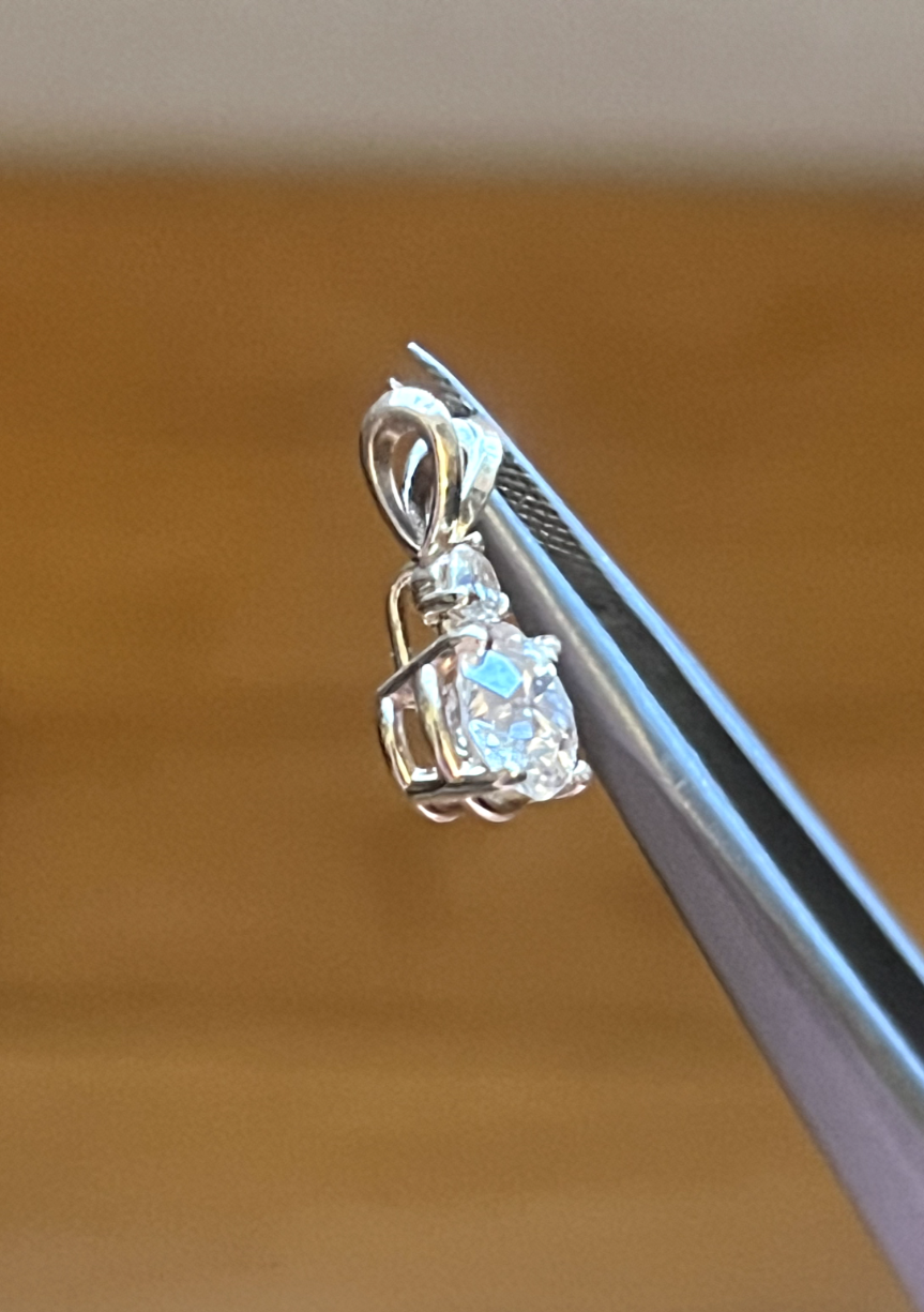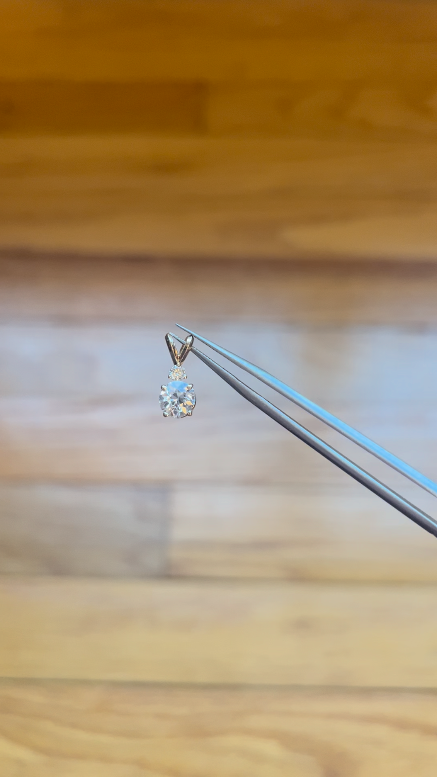 This is a charming vintage circular brilliant diamond cut roughly between 1880-1940. It features an open culet and a frosted girdle. It faces up bright and full of brilliance. Before setting in this 14k gold pendant it was tested and confirmed to be a rare type IIA diamond, meaning it is chemically pure, containing no measurable nitrogen of boron impurities. Less than 2% of natural diamonds fall into this category. The circular brilliant diamond has just been set with a complimentary 0.06 carat natural diamond in 14k yellow gold. It has just been polished and unworn.