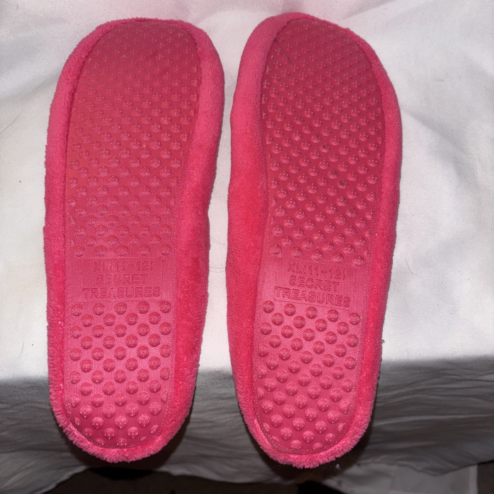 This product is a pair of cozy ballet slipper shoes in hot pink, designed specifically for women in medium size (11-12). The shoes feature a cute bow detail, making them perfect for indoor wear.