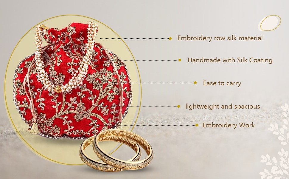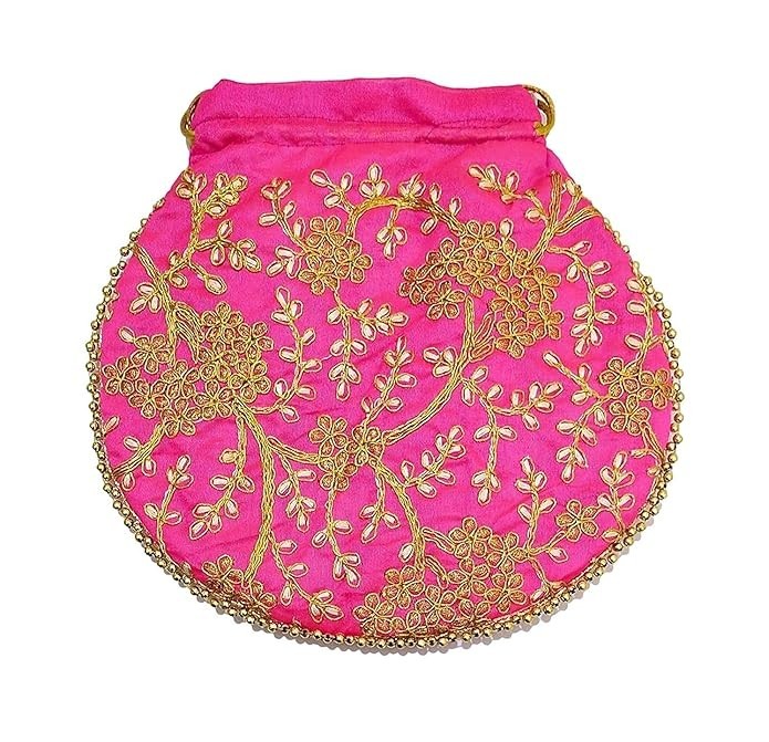 Sameer Enterprises Material : Outer Embroidered & Inner Dupin Silk. Type : Potli | Color : Baby Pink And Rani Closer : Drag String | Handle Type : Cheed Moti Handle Shape : Round | Size : 9 inch X 8.5 inch. Pack Of 1 Potli Bags ( Baby Pink and Rani) For women and girls gifting for any occasion Potli Bag is a Ethnic Stylish Clutch, kind of Indian Handbag, Potli bag looks very nice with any traditional dresses, also goes well with any Casual Indian Dresses. Spacious Compartment that can easily carry today's big smartphones,mobiles and other valuables things. This Potli bag having beautiful handle, made with high quality imitation pearls which look awesome and easy to carry. Athizay Potli bag is designed for any evening party or casual occasions at any time of the day. Marriage ceremonies to all kind of wedding parties.