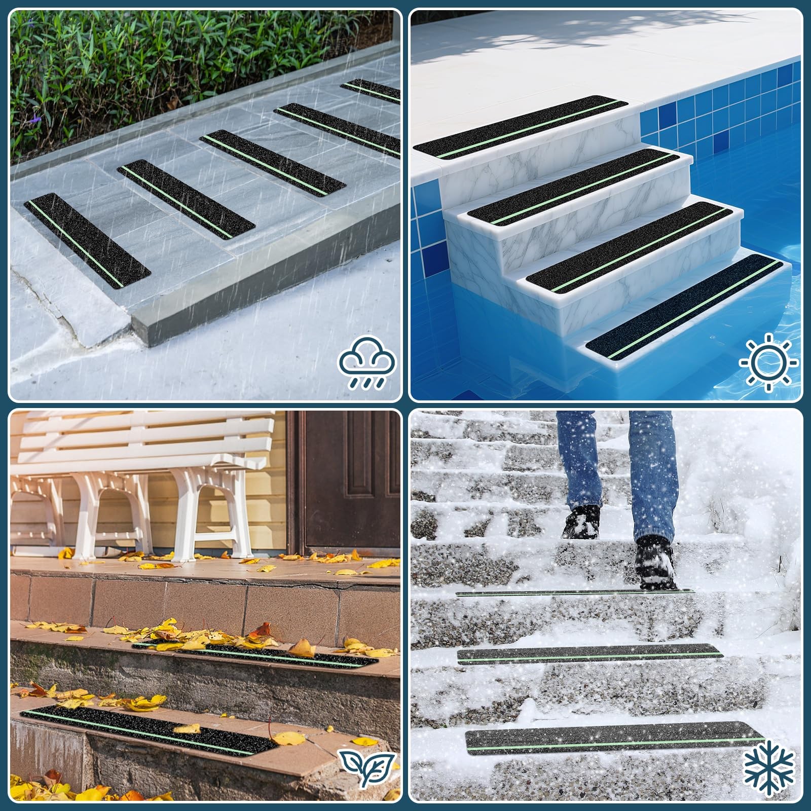 10 Pack 6” x 30” Anti Slip Traction Treads with Glow in The Dark Stripe, Outdoor Waterproof Non Skid Pre-Cut Tape with Roller, High Traction Friction Abrasive Adhesive for Stairs Step Glow in Dark Stripe Anti Slip Tape — 6 inch X 30 inch (10-Pack) Glow in the dark anti-slip tape, Each tread features a photoluminescent stripe. Photoluminescent stripe absorbs light during the day and emits a gentle glow for hours, helping prevent trips and slips at night or during power outages. Multiple Applications — Our anti-slip tape uses industrial-adhesive and is suitable for all surfaces, including wood, metal, concrete, plastic, marble, tile and more. Can be used on smooth surfaces indoors and outdoors, such as stairs, entrances, floors, porches, patios, ramps and more. Safety & Traction — Each tread features a high-traction 80-grit surface that significantly reduces the risk of slips and falls. Made with high-strength PET and a waterproof adhesive layer offers extra peace of mind for , seniors, and pets. Weatherproof & Durable — Non Slip Tape is very suitable for long-term use indoors and outdoors. Whether it is a hot summer, cold winter or rainy season, it can withstand various temperature changes. Easy to Install, Pre-Cut Design — No need to measure or trim. Each piece is pre-cut to 6” x 30” for uniform application — just peel, stick, and press firmly for instant protection and is easy to remove without damaging surfaces or leaving a sticky residue.