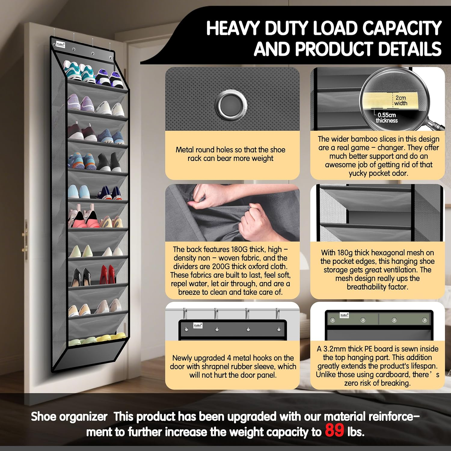 đ„ŒăEXTRA LARGE CAPACITY â Over The Door Shoe OrganizerăFeatures tall, deep pockets (10.5â deep) to easily store boots, sneakers, heels, and more. Overall dimensions: 73.6â H x 16.9â W. Offers 20% more storage than typical organizers, neatly holding 24-30 pairs of shoes. Space-saving back-of-door design makes it ideal for small homes and apartments. âăHIGH QUALITY MATERIALS TEAR-RESISTANT AND NON-SHEDDINGăUsing 200 grams thickness of breathable non-woven fabric + top load-bearing stitching A 3mmPE thickness load-bearing board. The bottom partition is made of 200D reinforced Oxford cloth, flexible and breathable, easy to clean and maintain, can be compactly folded and not easily deformed, it is lightweight storage, and the load-bearing capacity is stronger, it can easily bear 89 pounds, more durable than cardboard. Breathable 180D thickness mesh on both sides is stronger, more durable and tear-resistant than mesh bags. Sturdy inner top support of the shoe rack behind the door prevents crushing and sagging. đăEFFORTLESS ACCESS WITH 10.5" DEEP SLANTED POCKETSăOur over-the-door shoe organizer features deep slanted pockets (50% deeper than standard) for easy shoe removal, even from tight spaces. The open-top design + breathable mesh sides enhance airflow to prevent odor and make items visible at a glance. Reinforced 200D fabric ensures no sagging or stretching, even when holding 2 pairs of size 12 athletic shoes or tall boots â perfect for closets, dorms, and busy households. âăMEET YOUR MULTIPLE NEEDS & IDEAL GIFTăOur multi-functional over-the-door shoe organizer comes with 4 heavy-duty metal hooks, you can hang it on different doors to maximize the vertical space for shoe storage, besides placing your shoes you can also use it for your daily cleaning supplies, hairdressing supplies, hats, scarves, gloves, toys, toilet paper, water bottles and more. Place the right items according to your needs. Explore more ways to use it. đŹă100% SATISFACTION GUARANTEE â 24-Hour Supportă Quickly set up anywhereâdoors, walls, closetsâto organize your space instantly. Contact us within 24 hours of receipt for prompt assistance. Shop with confidence! â ăUSING TIPS ă â products using âvacuum packagingâ in order to facilitate transportation, we guarantee that the product itself has no odor, resulting in odor is due to âvacuum packagingâ air does not circulate, (This is the use of âvacuum packagingâ can not be avoided) so receive the items to open the vacuum bag âđ« please do not smell, so as not to cause you discomfort, to remove the odor method: you can place the items in a ventilated and airy place 1-2 hours after the dissipation. â ăNo hardware requiredă âNo hardware is required and you can easily assemble the product ready to use âOrganize Smarter, Breathe Easierâ Maximize Space with Kotkn Heavy-Duty Hanging Shoe Organizer â Built for Busy Homes! Tired of cluttered closets and musty shoes? Upgrade to our 10-tier over-the-door organizer, crafted with 180D hexagonal mesh sides for superior airflow and 200D Oxford fabric dividers that stand up to daily heavy loads without sagging. Perfect for families, renters, and anyone craving a tidy, breathable storage solution. Why Itâs a Bestseller â Generous Capacity, Vertical Design ï·73.6â Height & 10.5â Deep Slanted Pockets: Holds 20-30 pairs of shoesâfrom kidsâ sneakers to menâs size 13 boots. No More Floor Clutter: Vertical storage frees up closet space for clothes, luggage, or sports gear. â Premium Materials, Built to Last ï·180D Hex Mesh Sides: Breathable, dust-resistant, and 30% stronger than standard meshâkeeps shoes fresh and visible. ï·200D Oxford Fabric Dividers: Reinforced stitching prevents sagging, even when storing heavy boots or winter gear. â Smart Design for Real Life Slanted Pockets: Easy access to your go-to shoes; fits tall boots upright without bending. Family-Friendly Labels Included: Assign tiers to each family member or seasonâcustomize for hats, scarves, or bathroom essentials. â Multi-Scene Superstar Perfect for: âš Closets Apartments Dorm Rooms Garages RVs Laundry Rooms Dimensions: 73.6âH x 16.9âW (10.5â inclined depth per pocket) Material: 180D Hex Mesh + 200D Oxford Fabric + 200D Non-Woven Backing Installation: Tool-free! 4 adjustable metal hooks fit doors 1.37-1.95â thick (works on standard & narrow doors).