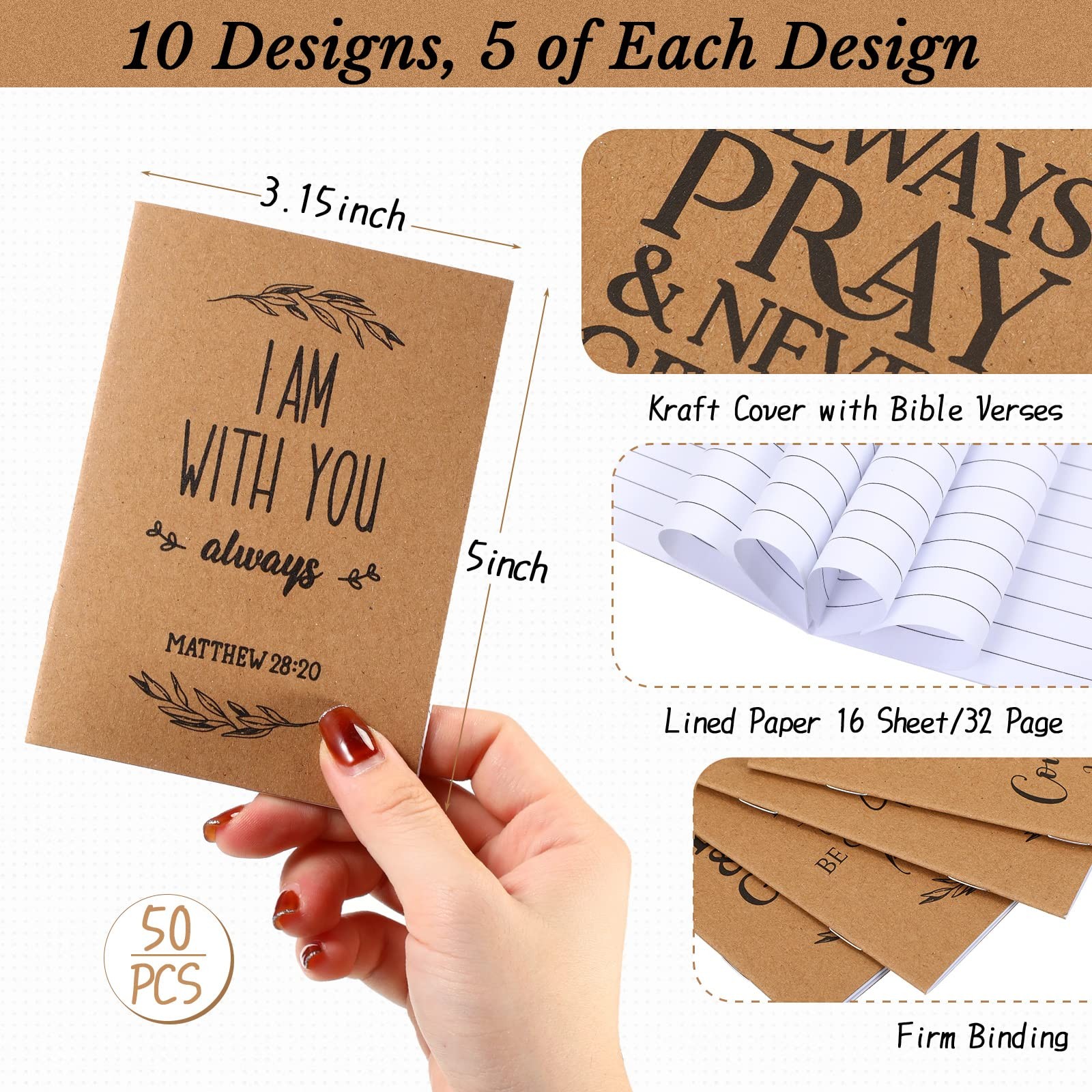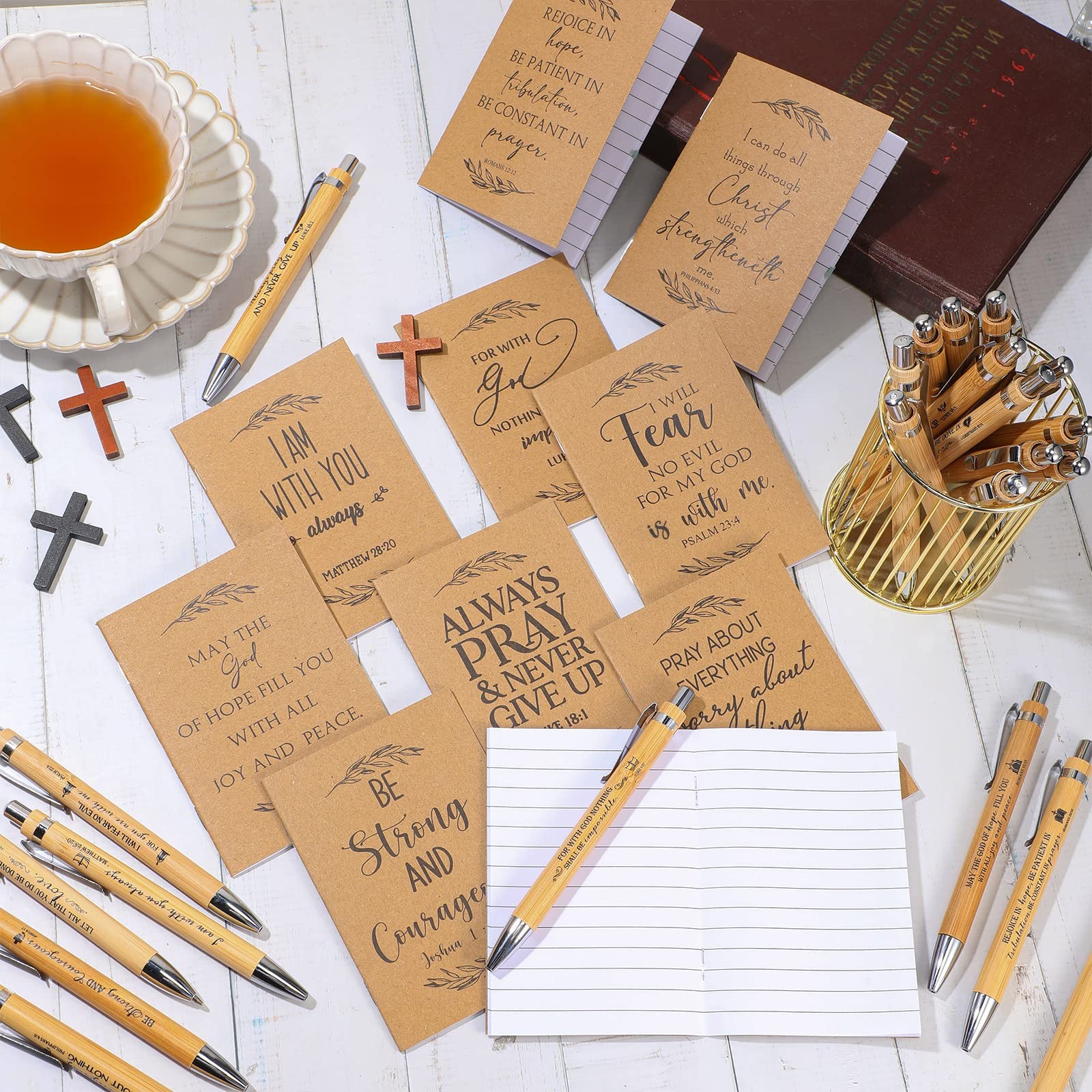 Features: Multipurpose for you: The inspirational journal for women is suitable for use in office, school and home, applied for keeping diaries, making plans, taking notes, doing homework, meeting minutes, creative writing, doodling and so on. Compact and mini: The inspirational small notebooks are small enough for you to hold with just 1 hand easily, convenient for you to carry around in your pocket, with enough writing place, you can take them as your list, memo and notebooks. Specifications: Main material: Bible journal: kraft paper Bible pens: bamboo Color: as pictures show Size: Pocket notebook: about 8 x 12.5 cm/ 3.15 x 5 inches Motivational pens: about 14 x 1.1 cm/ 5.51 x 0.43 inches Package includes: 50 x Bible journal 50 x Bamboo pens Notes: Manual measurement, please allow slight errors on size. The color may exist a slight difference due to different screen displays. Assorted Styles to Choose: the package comes with 50 pieces of small notebooks and 50 pieces of bible pens, both designed in 10 different styles; The sufficient quantity and various designs can exactly meet your using demands, and you can share them with others Encourage People to Face Difficulties: these bible journals and bible pens use some inspirational bible verses to motivate people to be positive, encourage people to get through the tough time and help to develop a positive mindset Classic and Elegant: the pocket notebook consists of a kraft paper cover and horizontal lined pages inside, adopting clear print on the surface, thick and sturdy, not easy to tear or fade; The Christian pens are made of bamboo material with black ink, comfortable to hold in hand Compact and Portable: the bamboo pens measure about 14 x 1.1 cm/ 5.51 x 0.43 inches, featuring a metal clip for convenient carrying and attaching to a folder or pocket; The bible study notebook is about 8 x 12.5 cm/ 3.15 x 5 inches, including 16 sheets lined paper of 32 pages, lightweight and easy to carry in bag, pocket, or purse Christian Gifts for Women Men: these small notepad and motivational pens are suitable for Christmas, Thanksgiving, church events, back to school day, bible study, school, office and other occasions, which can be inspirational gifts for family, friends, employees, coworkers, students, teachers and more