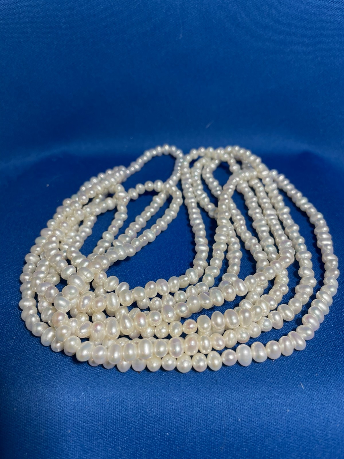 STYLE OPTIONS FOR 100 INCHES OF PEARLES. WRAP IT 2,3 0R EVEN 4 TIMES FOR A SIMPLE, ELEGANT LOOK. TIE IT, OR TWIST IT. MANY DIFFERENT WAYS TO WEAR THE PEARLES FOR FASHION LOOKS. GOOD CONDITION.