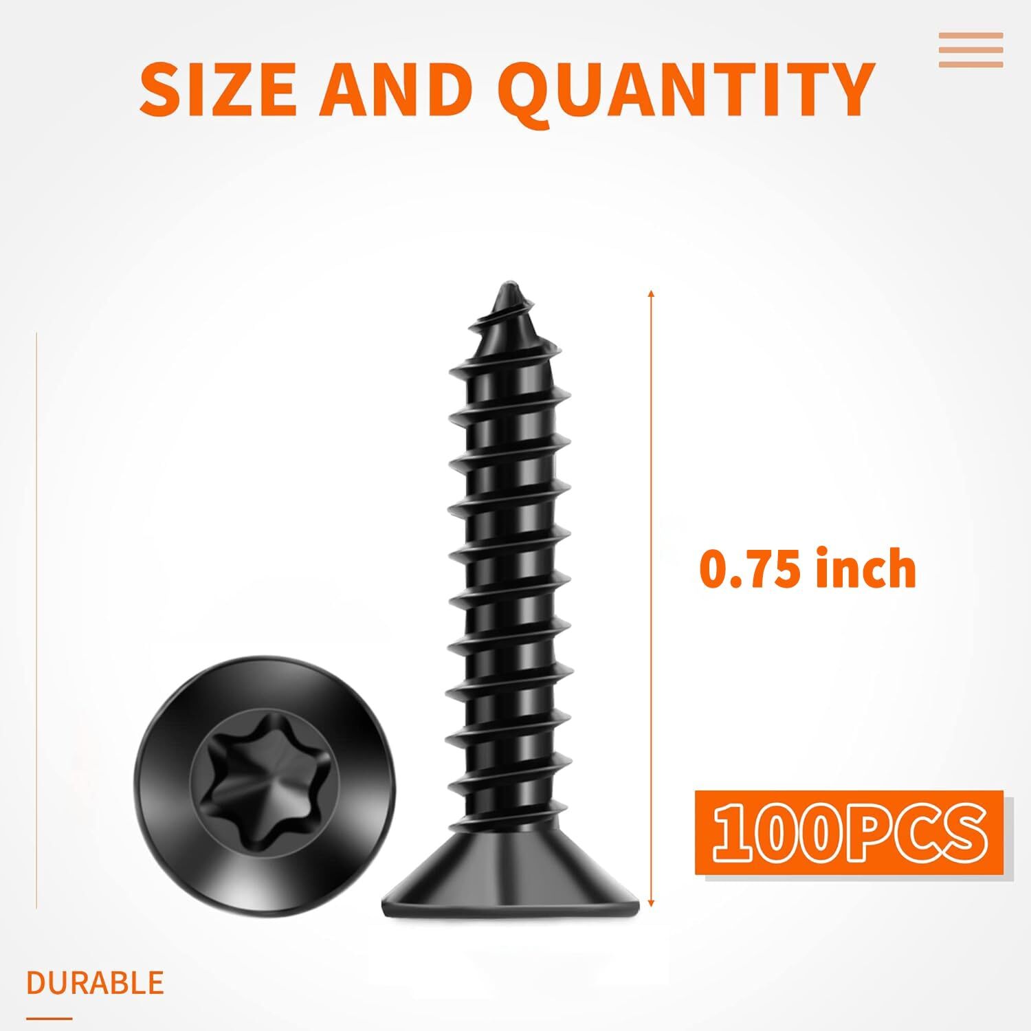 100 PCS #6 x 3/4" Flat Head Torx/Star Wood Screws, 18-8 (A2) Stainless Steel, Full Threaded & Black Coated for Durability, T15 Drive Bit Included, No.6 X 3/4" Multipurpose Screw by 【Dimensions】Diameter: #6 | Length: 0.75" | Thread Type: Coarse (standard) | Head: Flat | Drive: T15 Torx/Star bit | Quantity: 100 PCS | Material: 18-8 (A2) Stainless Steel 【Unrivaled Quality】Dive into perfection with our Wood Screws, crafted meticulously from 18-8 (A2) Stainless Steel, known for its unmatched rust-resistance and longevity. Embrace the robustness and durability that brings to the table, setting benchmarks in the hardware industry. [FREE T15 STAR BIT] - Every package comes complete with a matching T15 Torx/Star Drive bit at no extra cost, enabling a perfect match with the screws for a flawless installation. Our advanced Torx/Star Drive design eliminates the frustration of stripped screws, ensuring a smooth, precise drive every time. Its innovative design ensures a snug fit while minimizing cam-out, facilitating an efficient and seamless installation process. 【Superior Self-Tapping Design】Experience the convenience of our Self-Tapping Screws. They are perfect for a wide array of materials, be it softwood, hardwood, or even plastic. A genuine Multipurpose Screw that simplifies the task at hand. 【All-Environment Performance】Regardless of where you employ our screws, be it indoors or outdoors, they promise an unparalleled performance. The black oxide coating ensures they stand firm against corrosion, even when exposed to ACQ-treated lumber or other corrosive environments. Torx/Star Wood Screws: Excellence in Every Detail Product Features: Discover our Flat Head Torx/Star Wood Screws, the epitome of engineering precision. Crafted with an anti-corrosive black coating, they promise durability while adding a touch of elegance. Series Details: As part of the Multipurpose Screw Series, these screws are forged from high-grade 18-8 (A2) Stainless Steel, ensuring strength and longevity. The entire series prioritizes quality, ensuring our screws outshine and outlast. Specifications: Diameter: #6 Length: 3/4" Thread Diameter(T): 0.138 inch Drive: T15 Torx/Star bit Material: 18-8 (A2) Stainless Steel Coating: Black Design: Full Threaded Quantity: 100 pcs. Shipping We offer FREE shipping on all orders! We ship within Three business days of payment, usually sooner. We use a selection of shipping services such as UPS, FedEx, USPS etc. We only ship to the lower 48 states, no APO/FPO addresses or PO Boxes allowed. Local pickups and combined shipping options are not provided at this time. Return You can return a product for up to 30 days from the date you purchased it. Any product you return must be in the same condition you received it and in the original packaging. Please keep the receipt. Payment We accept payment by any of the following methods: PayPal Please pay as soon as possible after winning an auction, as that will allow us to post your item to you sooner! Feedback Customer satisfaction is very important to us. If you have any problem with your order, please contact us and we will do our best to make you satisfied. Contact Us If you have any queries, please contact us via ebay. We usually respond within 24 hours on weekdays. Please visit our eBay store to check out other items for sale! Thank you for shopping at our store.