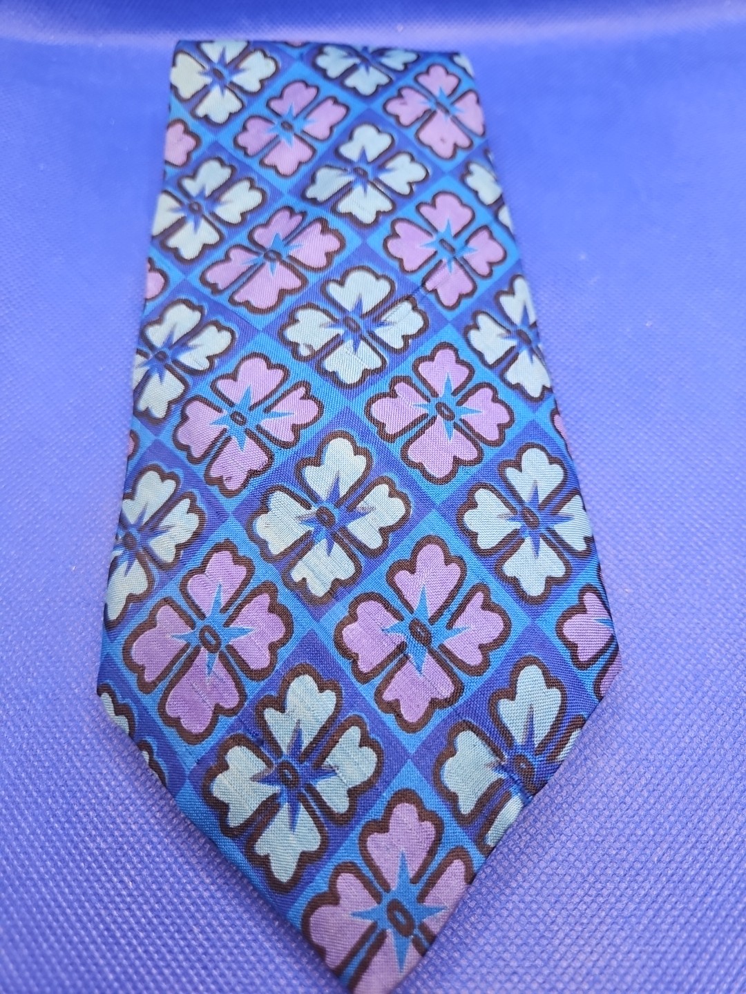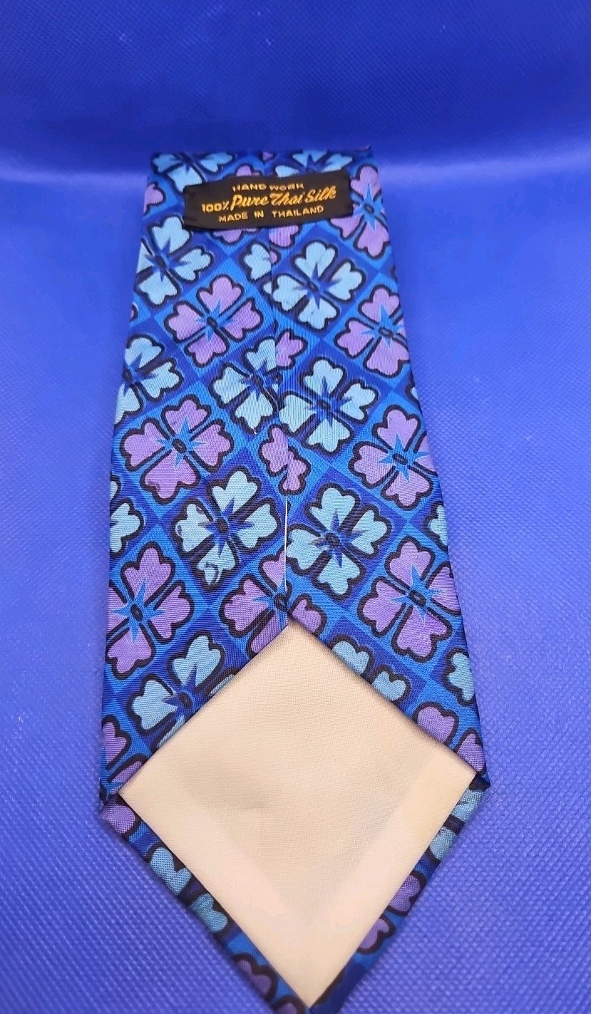 100% pure Thai Silk Tie, blue and purple geometric pattern. Hand Worked In Thailand. All of the ties listed are used, they are checked for quality checked before listing, to ensure we sell only good,clean quality ties. If you would like to combine the postage on more than one item, please message us before purchasing. If you have any questions, please don't hesitate to message tietastic.
