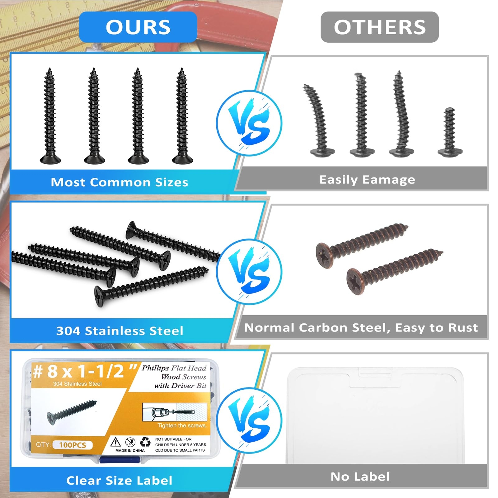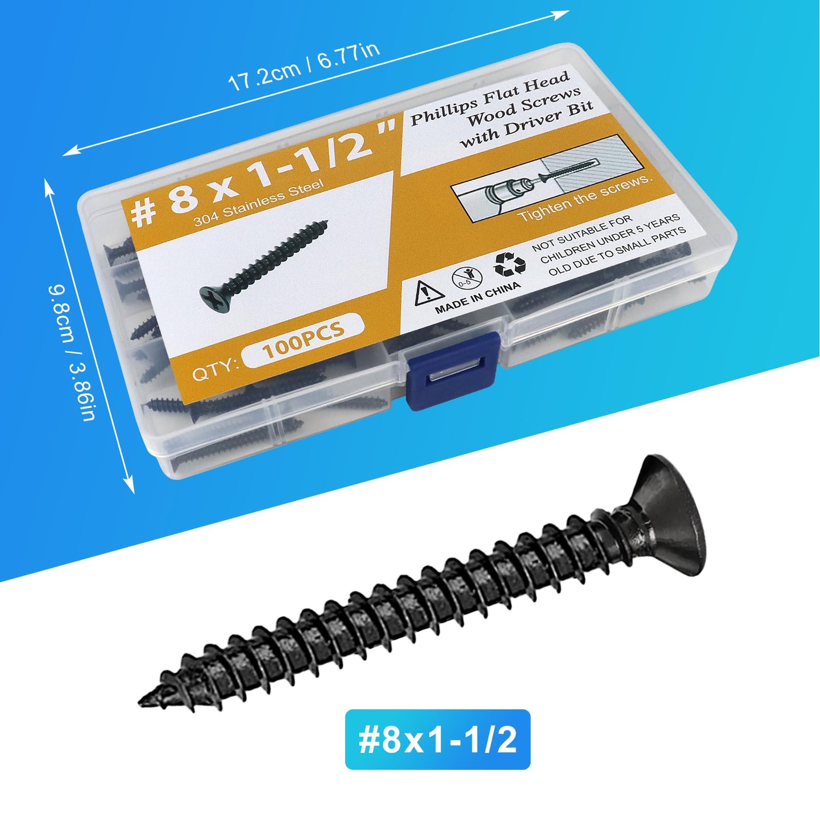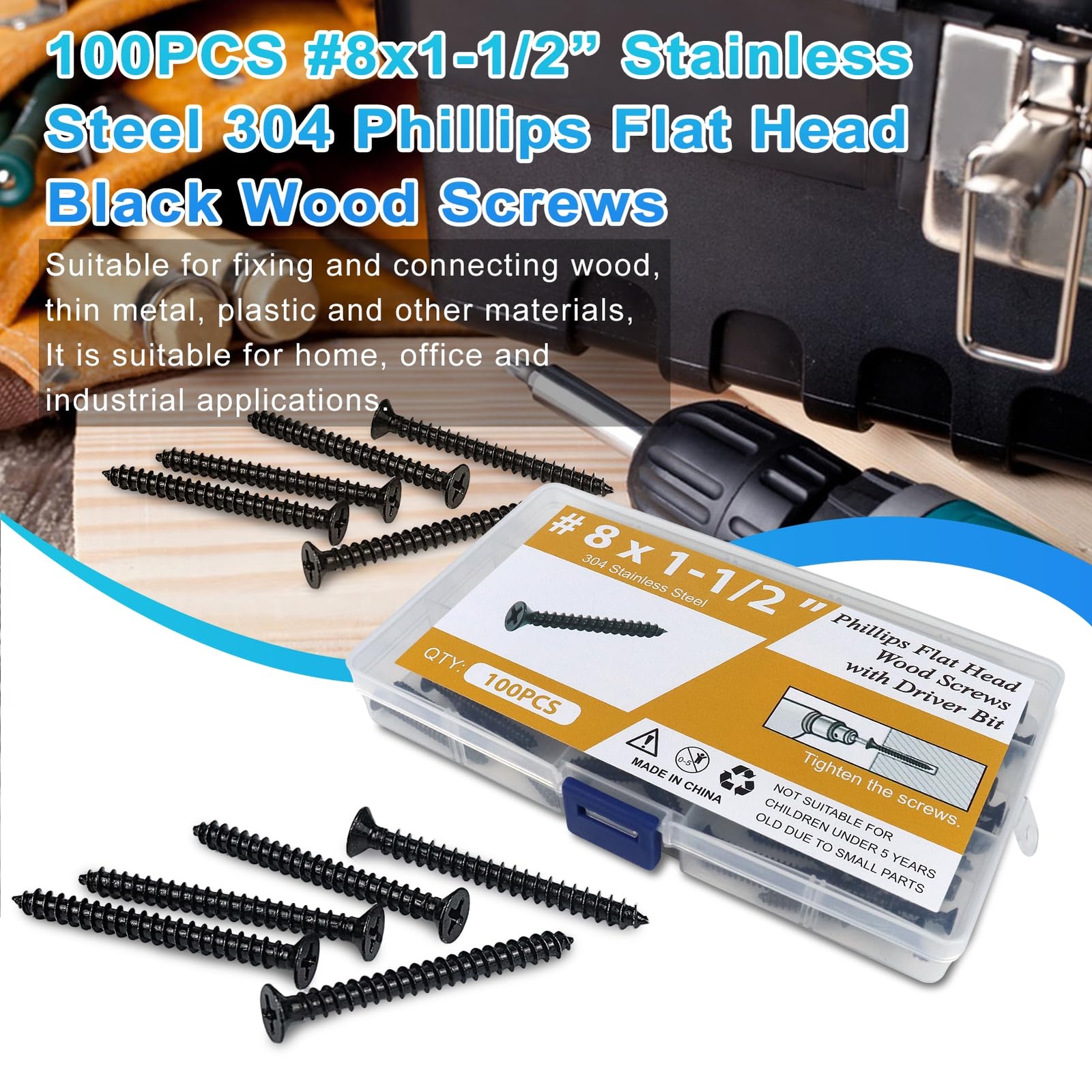 100PCS #8 x1-1/2 Black Wood Screws, Flat Head Phillips Stainless Steel Sheet Metal Screws, Fast Self Tapping Screws for Deck Drywall Concrete Screws with Screwdriver Bit Material: 304 stainless steel has good corrosion resistance in harsh environments such as high temperature, cold weather, and high humidity areas. They have superior rust resistance and excellent oxidation resistance, which can ensure long time using Standard Sizes:100pcs Flat Head #8 x 1-1/2" black wood screws, they have superior rust resistance and excellent oxidation resistance, which can ensure long time using Full Thread Style: Phillips Head style; Flat Head; Thread Type: Coarse; Self Tapping Point; The sheet metal screws have extra sharp point, accelerates screw activation during assembly for outdoor/indoor woodworking Package includes: 100pcs stainless steel wood screws in a boxes with labels; It can be applied to projects such as wood, metal, plastic, and aluminum projects in one set. You can choose the appropriate one Wide Applications: Stainless steel screws have precise threads and can easily pass through various materials such as plastic, soft metal, wood, etc. it widely used for repairing door handles, maintaining garage or household furniture and cabinet fasteners 100PCS #8 x1-1/2" Stainless Steel Black Wood Screws Wood Screws Specifications Material: 304 stainless steel Size:6.7x3.8x1Inches Package Included 100pcs #8 x1-1/2" black screws with one screwdriver Bit for wood Shipping We offer FREE shipping on all orders! We ship within Three business days of payment, usually sooner. We use a selection of shipping services such as UPS, FedEx, USPS etc. We only ship to the lower 48 states, no APO/FPO addresses or PO Boxes allowed. Local pickups and combined shipping options are not provided at this time. Return You can return a product for up to 30 days from the date you purchased it. Any product you return must be in the same condition you received it and in the original packaging. Please keep the receipt. Payment We accept payment by any of the following methods: PayPal Please pay as soon as possible after winning an auction, as that will allow us to post your item to you sooner! Feedback Customer satisfaction is very important to us. If you have any problem with your order, please contact us and we will do our best to make you satisfied. Contact Us If you have any queries, please contact us via ebay. We usually respond within 24 hours on weekdays. Please visit our eBay store to check out other items for sale! Thank you for shopping at our store.