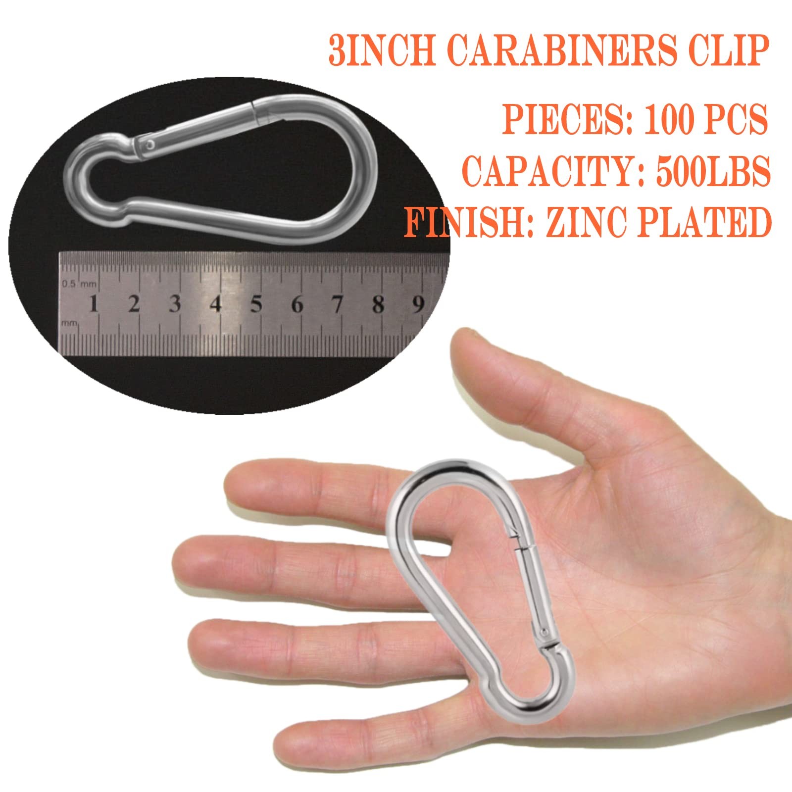 100Pack M8 Heavy Duty Carabiners 5/16” Spring Snap Hook Chain Clips Buckle Stainless Galvanized Carbon Steel Carabiner Clips Set for Camping Boating Hiking Fishing 500lbs Holding Capacity and 3Inch Sliver Snap Hooks Carabiners Clips Specifications: Color: Sliver Material: Plated Steel Size: 3Inch Capacity: 500lbs Type: M8 Large Carabiner Hooks Package Includes: 100Pack Steel Spring Snap Hook Features: Strong and Durable steel material for long life service 500lbs Holding Capacity meets heavy duty usage, such as swing, hammock, hiking and camping Spring-Load Gate for easy locking, keep your things in safety Smooth Opening and Closing allows quickly attaching items Applications: Swing, hammock, boats, tumblers, flag, backpack, water bottles, key ring, chains, ropes, camping, hiking, fishing, pet leash, Keychain carabiner, indoor outdoor equipment gear, DIY accessories 100PACK 3INCH SPRING SNAP HOOKS: Package includes 100pcs M8 heavy duty carabiner clips, allowing fastest connection/disconnection usages, widely used for fitness connector, swing set, hammock, gym, indoor outdoor equipment gear DURABLE STEEL CARABINERS HOOKS: 5/16” Snap hooks are made of durable -galvanized steel with 500lbs holding capacity, hard material, waterproof and rustproof, long service life for heavy duty usages SAFETY AND QUIKLY CHAIN LINKS: Quick carabiner clip has strong structure and the open-auto-close spring gate with interlock tooth prevent forced opening by load, high safety and stable; The smooth opening and closing allows you easily to attach key-ring, DIY accessories, pet leash and water bottles LARGE KEYCHAIN SPRING LINKS: Overall Size: M8x80mm Carabiner Clip; Length: 3Inch; Diameter: 5/16”; Big size and easy to carry, perfect carabiner accessory for outdoor activities WIDE USED IN HOME DIY PROJECT OR OUTDOOR: Heavy Duty Spring snap hooks perfect for hammock, fitness,swing set, gym, hiking, camping, indoor outdoor equipment gear; Also connecting items to a belt and any outdoor use versatile binding, rigging and anchoring hardware