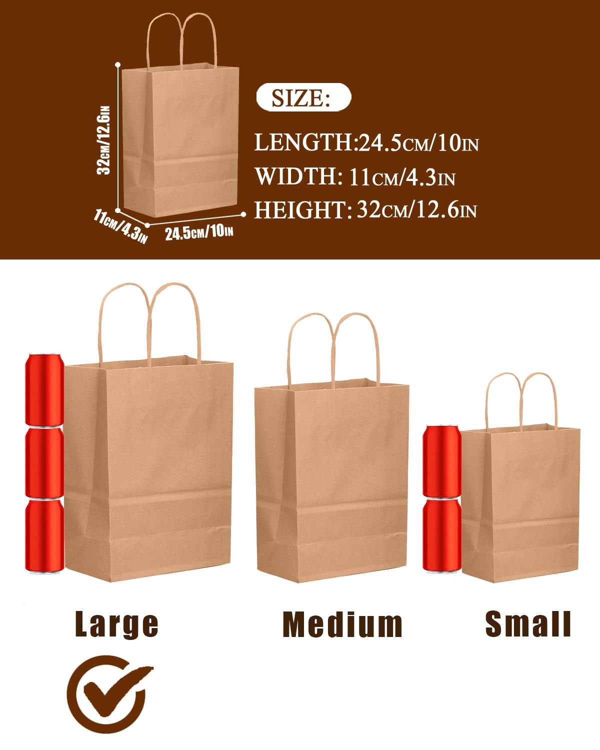 100-Pack Large Size Gift Paper Bags with Handles Bulk 13"x10.3"x4.6" Brown Party Kraft Shopping Bags Color & Size:100pcs Large paper bags /13"x10.3"x4.6" Brown Gift Paper Bag Reliable Material: Made of safe and recycled thick kraft paper, perfect for holding small gifts and ornaments. The high-quality thick paper is sturdy enough to carry heavier items Gift Bags: Fill these party favor bags with candies, goodies, and small gifts to create the perfect goodie bags for weddings and birthday parties Great Value Pack: 100pcs Large paper bags offer excellent quality and affordability. We update new designs every month to bring you more options :We don't have to Exaggerate to Attract our Customers, Because We Know Providing Best Quality Products is The Only Way to Set up Our Brand Status Among Long-Term Market.