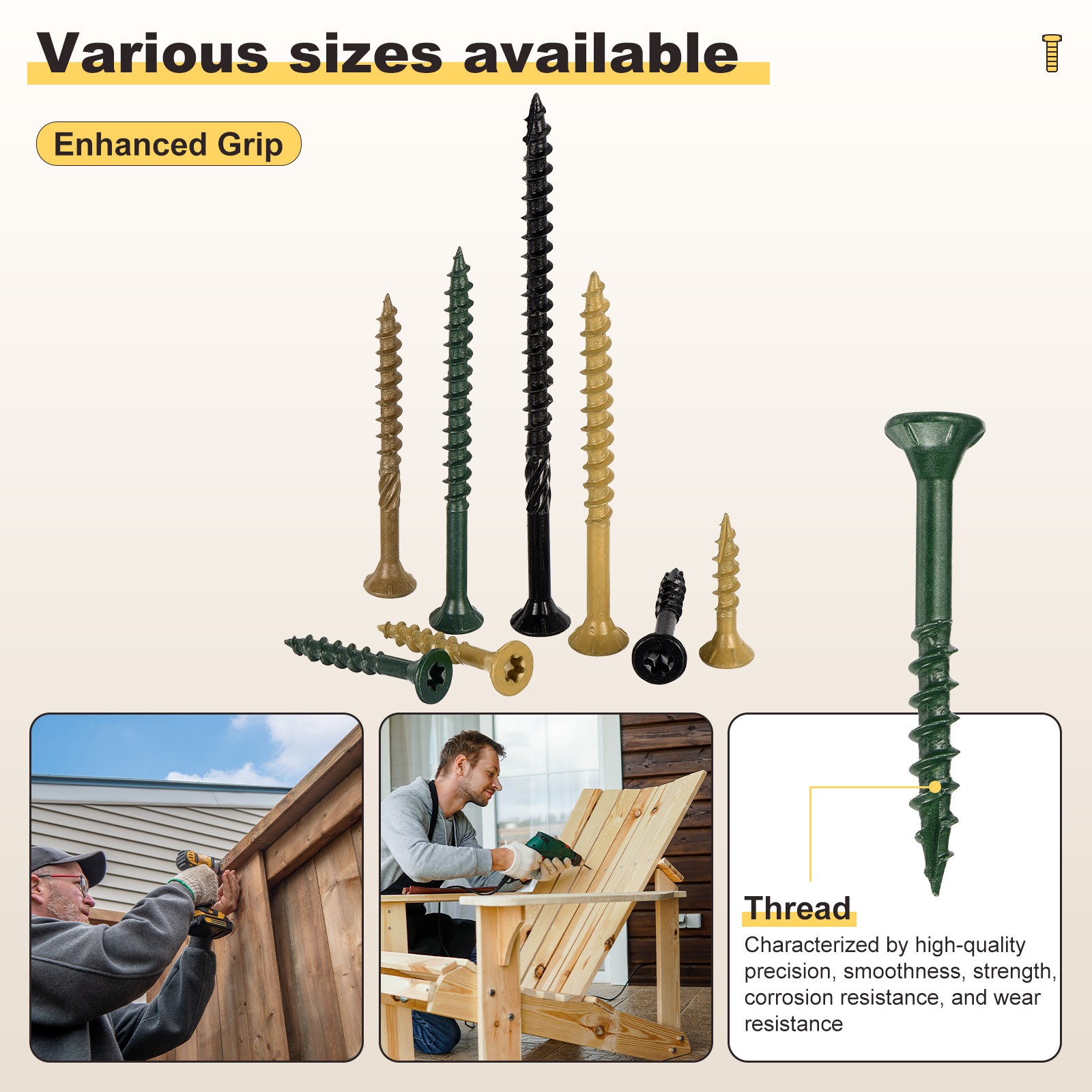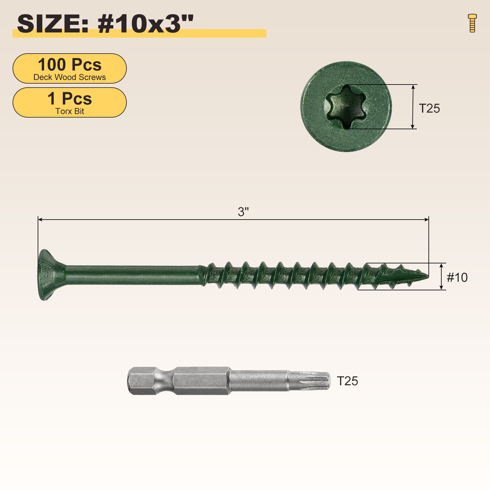 Document APPLY TO - This versatile deck screw is suitable for a wide array of wooden applications, including but not limited to patios, fences, frames, farm structures, ladders, outdoor furniture, pet houses, doors, tables, chairs, shelves, and workbenches. SPECIFICATION:Screw Size: #10x3"(Thread Dia x Length)Tail Type: Type 17Slot number: T25Color: GreenMaterial: Carbon SteelQUANTITY INCLUDED - 100Pcs x Deck Wood Screws; 1Pcs Torx BitADVANTAGE - Constructed from carbon steel with an advanced anti-corrosion treatment, these screws exhibit superior resistance to rust and corrosion. They have been tested for 1000 hours under salt spray conditions, ensuring reliable performance in both extreme heat and cold. This makes them highly durable and long-term use in various environments.DESIGN - The star drive design ensures a secure grip, minimizing the risk of slippage during installation and removal. The fine-point 17-gauge tip allows for effortless penetration into different types of wood, including hardwoods, softwoods, and pressure-treated materials. Additionally, the coarse serrated threads provide a robust hold, reducing board separation and enhancing overall structural stability.Note - Before purchasing, it's recommended to use a caliper to verify the correct size for precise measurements, as rulers or tape measures might not be accurate enough. Deck Screws(#10x3") 100Pcs,Carbon Steel Wood Screw with T25 Torx Drive,Green APPLY TO - This versatile deck screw is suitable for a wide array of wooden applications, including but not limited to patios, fences, frames, farm structures, ladders, outdoor furniture, pet houses, doors, tables, chairs, shelves, and workbenches. SPECIFICATION: Screw Size: #10x3"(Thread Dia x Length) Tail Type: Type 17 Slot number: T25 Color: Green Material: Carbon Steel QUANTITY INCLUDED - 100Pcs x Deck Wood Screws; 1Pcs Torx Bit ADVANTAGE - Constructed from carbon steel with an advanced anti-corrosion treatment, these screws exhibit superior resistance to rust and corrosion. They have been tested for 1000 hours under salt spray conditions, ensuring reliable performance in both extreme heat and cold. This makes them highly durable and long-term use in various environments. DESIGN - The star drive design ensures a secure grip, minimizing the risk of slippage during installation and removal. The fine-point 17-gauge tip allows for effortless penetration into different types of wood, including hardwoods, softwoods, and pressure-treated materials. Additionally, the coarse serrated threads provide a robust hold, reducing board separation and enhancing overall structural stability. Note - Before purchasing, it's recommended to use a caliper to verify the correct size for precise measurements, as rulers or tape measures might not be accurate enough. Hot Item Payment 1.We accept eBay payment . 2.Payment must be received within 7 business days of auction closing. Shipping 1.We ship to your eBay or Paypal address. Please make sure your eBay and Paypal address is correct before you pay. 2.Items will be shipped within 1-3 business day when we received payment. 3.Delivery time depends on destination and other factors. Description Policy Deck Screws(#10x3") 100Pcs,Carbon Steel Wood Screw with T25 Torx Drive,Green APPLY TO - This versatile deck screw is suitable for a wide array of wooden applications, including but not limited to patios, fences, frames, farm structures, ladders, outdoor furniture, pet houses, doors, tables, chairs, shelves, and workbenches. SPECIFICATION: Screw Size: #10x3"(Thread Dia x Length) Tail Type: Type 17 Slot number: T25 Color: Green Material: Carbon Steel QUANTITY INCLUDED - 100Pcs x Deck Wood Screws; 1Pcs Torx Bit ADVANTAGE - Constructed from carbon steel with an advanced anti-corrosion treatment, these screws exhibit superior resistance to rust and corrosion. They have been tested for 1000 hours under salt spray conditions, ensuring reliable performance in both extreme heat and cold. This makes them highly durable and long-term use in various environments. DESIGN - The star drive design ensures a secure grip, minimizing the risk of slippage during installation and removal. The fine-point 17-gauge tip allows for effortless penetration into different types of wood, including hardwoods, softwoods, and pressure-treated materials. Additionally, the coarse serrated threads provide a robust hold, reducing board separation and enhancing overall structural stability. Note - Before purchasing, it's recommended to use a caliper to verify the correct size for precise measurements, as rulers or tape measures might not be accurate enough. Hot Item Payment 1.We accept eBay payment . 2.Payment must be received within 7 business days of auction closing. Shipping 1.We ship to your eBay or Paypal address. Please make sure your eBay and Paypal address is correct before you pay. 2.Items will be shipped within 1-3 business day when we received payment. 3.Delivery time depends on destination and other factors.