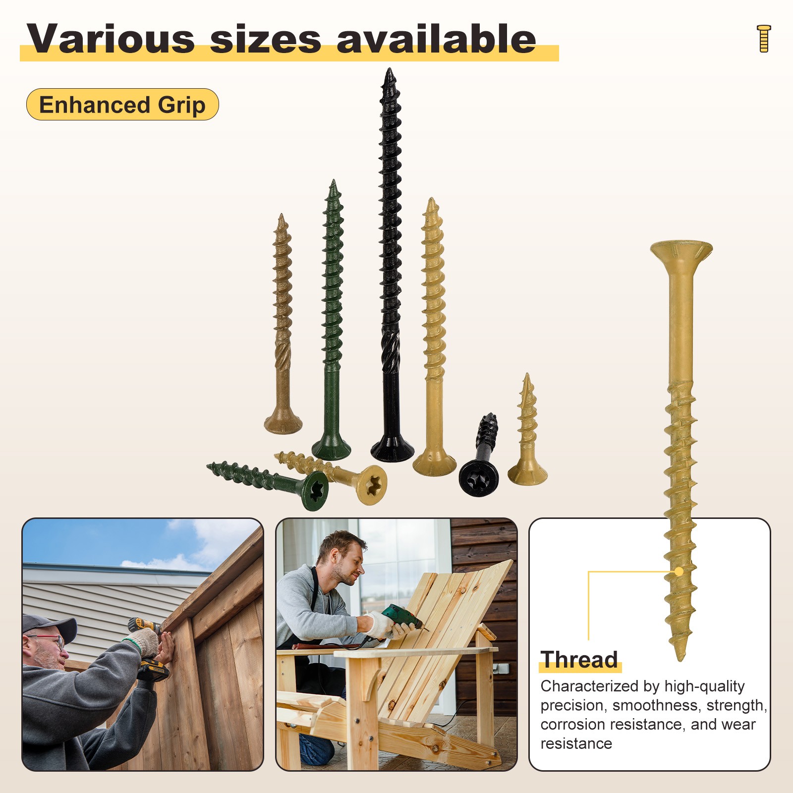 Document APPLY TO - This versatile deck screw is suitable for a wide array of wooden applications, including but not limited to patios, fences, frames, farm structures, ladders, outdoor furniture, pet houses, doors, tables, chairs, shelves, and workbenches. SPECIFICATION:Screw Size: #9x3"(Thread Dia x Length)Tail Type: Type 17Slot number: T25Color: TanMaterial: Carbon SteelQUANTITY INCLUDED - 100Pcs x Deck Wood Screws; 1Pcs Torx BitADVANTAGE - Constructed from carbon steel with an advanced anti-corrosion treatment, these screws exhibit superior resistance to rust and corrosion. They have been tested for 1000 hours under salt spray conditions, ensuring reliable performance in both extreme heat and cold. This makes them highly durable and long-term use in various environments.DESIGN - The star drive design ensures a secure grip, minimizing the risk of slippage during installation and removal. The fine-point 17-gauge tip allows for effortless penetration into different types of wood, including hardwoods, softwoods, and pressure-treated materials. Additionally, the coarse serrated threads provide a robust hold, reducing board separation and enhancing overall structural stability.Note - Before purchasing, it's recommended to use a caliper to verify the correct size for precise measurements, as rulers or tape measures might not be accurate enough. Deck Screws(#9x3") 100Pcs,Carbon Steel Wood Screw with T25 Torx Drive,Tan APPLY TO - This versatile deck screw is suitable for a wide array of wooden applications, including but not limited to patios, fences, frames, farm structures, ladders, outdoor furniture, pet houses, doors, tables, chairs, shelves, and workbenches. SPECIFICATION: Screw Size: #9x3"(Thread Dia x Length) Tail Type: Type 17 Slot number: T25 Color: Tan Material: Carbon Steel QUANTITY INCLUDED - 100Pcs x Deck Wood Screws; 1Pcs Torx Bit ADVANTAGE - Constructed from carbon steel with an advanced anti-corrosion treatment, these screws exhibit superior resistance to rust and corrosion. They have been tested for 1000 hours under salt spray conditions, ensuring reliable performance in both extreme heat and cold. This makes them highly durable and long-term use in various environments. DESIGN - The star drive design ensures a secure grip, minimizing the risk of slippage during installation and removal. The fine-point 17-gauge tip allows for effortless penetration into different types of wood, including hardwoods, softwoods, and pressure-treated materials. Additionally, the coarse serrated threads provide a robust hold, reducing board separation and enhancing overall structural stability. Note - Before purchasing, it's recommended to use a caliper to verify the correct size for precise measurements, as rulers or tape measures might not be accurate enough. Hot Item Payment 1.We accept eBay payment . 2.Payment must be received within 7 business days of auction closing. Shipping 1.We ship to your eBay or Paypal address. Please make sure your eBay and Paypal address is correct before you pay. 2.Items will be shipped within 1-3 business day when we received payment. 3.Delivery time depends on destination and other factors. Description Policy Deck Screws(#9x3") 100Pcs,Carbon Steel Wood Screw with T25 Torx Drive,Tan APPLY TO - This versatile deck screw is suitable for a wide array of wooden applications, including but not limited to patios, fences, frames, farm structures, ladders, outdoor furniture, pet houses, doors, tables, chairs, shelves, and workbenches. SPECIFICATION: Screw Size: #9x3"(Thread Dia x Length) Tail Type: Type 17 Slot number: T25 Color: Tan Material: Carbon Steel QUANTITY INCLUDED - 100Pcs x Deck Wood Screws; 1Pcs Torx Bit ADVANTAGE - Constructed from carbon steel with an advanced anti-corrosion treatment, these screws exhibit superior resistance to rust and corrosion. They have been tested for 1000 hours under salt spray conditions, ensuring reliable performance in both extreme heat and cold. This makes them highly durable and long-term use in various environments. DESIGN - The star drive design ensures a secure grip, minimizing the risk of slippage during installation and removal. The fine-point 17-gauge tip allows for effortless penetration into different types of wood, including hardwoods, softwoods, and pressure-treated materials. Additionally, the coarse serrated threads provide a robust hold, reducing board separation and enhancing overall structural stability. Note - Before purchasing, it's recommended to use a caliper to verify the correct size for precise measurements, as rulers or tape measures might not be accurate enough. Hot Item Payment 1.We accept eBay payment . 2.Payment must be received within 7 business days of auction closing. Shipping 1.We ship to your eBay or Paypal address. Please make sure your eBay and Paypal address is correct before you pay. 2.Items will be shipped within 1-3 business day when we received payment. 3.Delivery time depends on destination and other factors.