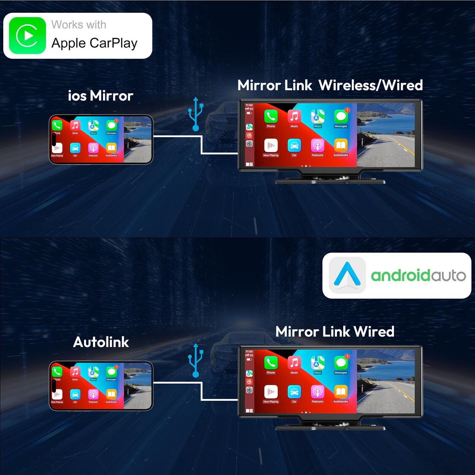 Portable Car Audio Receiver: You can enjoy wireless carplay and android auto without having to go through all the trouble of replacing your head unit. A true plug and play unit. After connecting the Bluetooth and WiFi, you can access your smartphone functions such as play music, map navigation, voicemail, calls, notification, messages and more via voice control. Dual Camera HD Recording: This touchscreen dash cam supports split screen. When you are reversing, the front view and rear view images can be displayed on the screen at the same time, which is more safe and effective. Both front and rear cameras support video recording, and the front camera supports angle adjustment. Easy Installation and Fit for Various Cars: This car HD DVR is easy to use and you don't need to disassemble the car, just install it on the dashboard and keep your car original. With 12-24V voltage, which can fit all different cars, like campers RVs, trucks, and vans. Car Stereo with HD IPS Touch Screen: The 10.26-inch high-definition touch IPS screen with 4K resolution and 170° full-viewing angle. The rectangular screen design can better reduce the obstruction of the line of sight. The shape is also more beautiful and fashionable, which conforms to the aesthetics of modern people. Stable Bluetooth and FM Transmission: When connected to your mobile phone via Bluetooth, you can answer / make hands free calls, play music and control smoothly without distraction. This car dash cam HD video recording has built-in speaker, but if you want louder sound, you can transfer it to your car's speaker: By FM radio transmitter, you can set the same FM radio channel on the unit and your car's radio. Front Camera With Driving Recorder Function: A wireless portable car audio with a high-definition front-facing camera that provides excellent image quality and a wider field of view. Helps you see every detail as clearly as possible during playback, escorting your driving. Mod el :H26 Video resolution: Front Camera2.5k (2560*1440p) 25FPS/ Rear Camera :1080p (1920*1080p) 25FPS (2.5K+1080P) Screen size (resolution): 10.26-inch IPS 2.5D Full touch screen (resolution 1600X600) Bluetooth: 5.0 FM transmission: support 87~108Mhz Loop Recording:Support 24H Parking monitor:Need hardwire kit (NOT included) Expansion card: Supports TF card (microSD card), up to 256GB expansion(not included) Language: Simplified Chinese, Traditional Chinese, English, Russian, Spanish, French, German, Japanese, Korean and other languages Voice command: Support, English, Japanese, German, Russian, four languages Rear view interface: 2.5m headphone interface, four-stage AHD rear recording camera interface AHD1080P (1920X1080) AUX interface: 3.5m headphone interface, three-stage TF card holder: supports TF card (microSD card), supports up to 256GB expansion USB interface: TypeC (power supply/download/FM antenna) PACKAGE : Machine*1+square base bracket*1+rear view camera*1+car charger*1+manual*1+audio cable*1 Model: H27 Maximum recording resolution 4K (3840*2160P) + 1080P (1920*1080P) Encoding type H.264 Video encoding format MP4/TS Effective pixels: 2 million pixels Photo format JPEG Collision sensor three-axis acceleration sensor Recording mode: Loop recording without missing a second, the last 2 seconds of video can be saved Storage TF card (Class 10 or above, maximum support 256GB) Display 10.26 inches , touch screen operation Parking Guard Support Collision sensing support Video specifications H.264 MP4 Interface MICRO USB 2.0 Video pixels 4k/2.5/1080P/720P Language types: Chinese Simplified, Chinese Traditional, English, Japanese, Korean, Russian, German, French, Thai, Czech, Portuguese, Polish, Dutch, Turkish, Thai WIFI support GPS support Model : H28 WIFI : 2.4Ghz+5Ghz dual band Bluetooth: 5.0 FM transmitter: support 87~108Mhz Expansion card: Supports TF card (microSD card), up to 256GB expansion Touch: 2.5D 10.26 INCH full screen touch Audio channels: two-channel, with stereo, left and right channels, surround sound Screen size (resolution): 10.26-inch IPS screen (resolution 1600X600) Language: Simplified Chinese, Traditional Chinese, English, Russian, Spanish, French, German, Japanese, Korean and other languages Video resolution: 2560*1440 25FPS/1920*1080 25FPS (2.5K+1080P) Parking monitoring: Supported (requires special time-lapse video step-down cable) optional Loop recording: 2 minutes, 3 minutes, 5 minutes Voice control: support Screen saver: off, 1 minute, 5 minutes Rear view interface: 2.5m headphone interface, four-stage AHD rear recording camera interface AHD1080P (1920X1080) AUX interface: 3.5m headphone interface, three-stage TF card holder: supports TF card (microSD card), supports up to 256GB expansion USB interface: TypeC (power supply/download/FM antenna) Mode l :H29 Size: 10.26 inches Color/Color: Black Display: 10.26 inches capacitive screen Expanded memory card: TF card capacity is supported up to 256GB Power supply mode: standard car charger 5V/3A Front camera: None Rear camera (with reversing image): AHD 2.5K high-definition camera Bluetooth: Support BLE 4.2 FM: Support 88-108MHz G PS track: support W IFI : compatible with 2.4G/5G System/OS:LINUX Language: Supports multiple national languages (Chinese, English, German, French, Italian, Spanish, Hebrew, Japanese, Russian, Turkish, Korean, Polish, Portuguese) Parking monitoring: support Mobile APP playback viewing: ELOOK pro Apple devices: support Carplay Overseas Android devices: support android auto Mirror projection: supported AUX audio output: support Multimedia video playback: support Multimedia audio playback: support Post-recording streaming (with reversing image): Supported Model: H30A Size/Size: 10.26 inches Color/Color: Black Display: 10.26 inches capacitive screen, touchable Expanded memory card: TF card capacity is supported up to 256GB Power supply method: car charger 5V/3A Front camera: 4K ultra-clear Rear camera: AHD 1080P high definition camera Bluetooth: Support BLE 4.2 FM: 