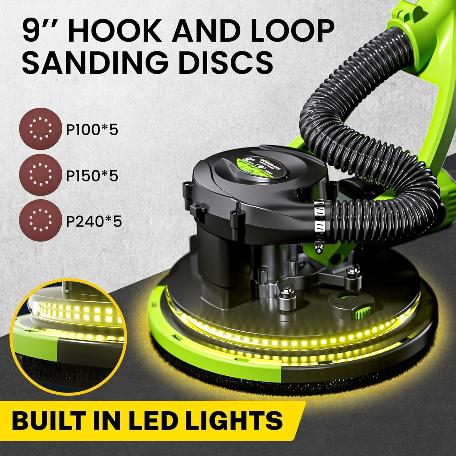 1050W Automatic Drywall Sander with Vacuum & 15 Discs, 7 Speeds About this item: 【1050W Powerful Motor & 7-Speed Variable Function】Equipped with a 1050W high-efficiency motor, this popcorn ceiling sander delivers powerful performance, suitable for sanding gypsum boards, ceilings, floors, paint coatings, and plaster. The 7-speed adjustment (1000-2100 RPM) enables precise control, suitable for removing stubborn coatings or fine sanding. Suitable for home renovations and professional contractors. 【Foldable Extendable Handle — Easily Reach High Areas】The innovative extendable handle can be extended from 1.4m to 1.65m (4.6 feet → 5.4 feet), making it perfect for high ceilings, walls, and narrow spaces. The foldable design saves 90% storage space and enhances portability. No need ladder — easily complete high-reach sanding! 【360° LED Lighting + Removable Edge — No-Dead-Angle Sanding】Built-in dual-layer LED light strips illuminate dark corners for clear visibility. The removable edge sanding module and flexible sanding pad access narrow gaps, vertical edges, and tight corners, eliminating the limitations of traditional tools. 【360° rotating head + quick-change sanding disc】Equipped with a 360° rotating sanding head and a hook-shaped tension spring for stable and uniform polishing results. The magnetic quick-release base supports 1-second sandpaper replacement (fit for 9-inch/225mm sanding discs). Precisely handles hard-to-reach areas!