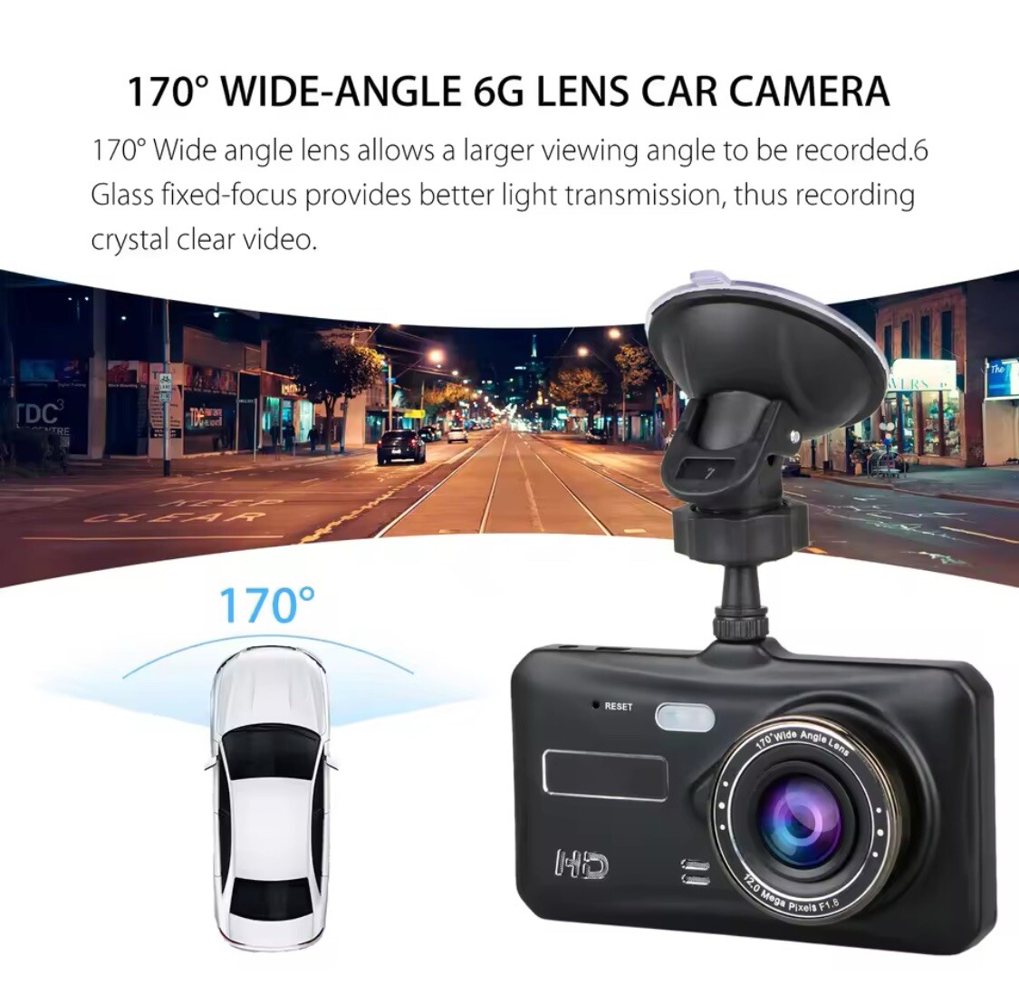 Super Night Vision and WDR Technology: Combined with super big aperture and wide dynamic range(WDR),you can get comparatively clearer footage and image at night. Car plates license can be easily seen even in darkness. The safety of driving at night will be improved a lot. 4" Large LCD Screen Car Recorder: Combined with 1080P Full HD and 12MP resolution, this dash cam can provide insurance claims to prevent disputes. Super large screen shows the real time image, helps you clearly see every details when playing back and brings better visual experience. 170 Wide-Angle 6G Lens Car Camera: 170 wide angle lens allows a larger viewing angle to be recorded. For example, you will be able to see 4 lanes of traffic. The more you see, the safer you are. 6 glass fixed-focus provides better light transmission, thus recording crystal clear video. G-Sensor and Loop Recording: G-sensor is activatedby any collision to start recording emergency videos to help you get evidence in the car recorder when the unexpected situation occurs. Automatically overwrite the unlocked oldest file when the TF card is full, to ensure the normal recording. Easy to install: Suction cup mount installed on the windshield and connected to the cigarette lighter, the car camera will record automatically. Note: Since its internal battery is a small capacity, it will automatically shut down after 10 seconds without external power. You need to always connect to external power when using the cam. Product Features: LCD screen size: 4.0" high bright IPS touch screen Lens: Front: 170 high-definition wide angle; Back: 120 wide angle Language: English/Simplified Chinese/Russian/Japanese/German/Spanish Video resolution: Front: 1080P(1920*1080),720P(1280*720); Back: 720P(640*480) Auto loop recording: Close/1min/3min/5min Picture resolution: 10M/8M/5M/3M/2MHD/1M/VGA Picture format: JPG Memory card: TF card(access speed class 6 or above, maximum supported to 64GB,it is not included) Microphone/Speaker: Built-in Frequency: 50Hz/60Hz Port: USB/AV-in/TF card slot Power: DC5V 1500mA-2000mA Battery: Polymer lithium battery built-in Package Includes: 1x Car Dash Cam. 1x Rearview Cam. 1x Rearview Cam Line(6m). 1x Car Charger. 1x Suction Cup. 2x Screws. 1x User Manual Super Night Vision and WDR Technology. 4" Large LCD Screen Car Recorder. 170 Wide-Angle 6G Lens Car Camera.
