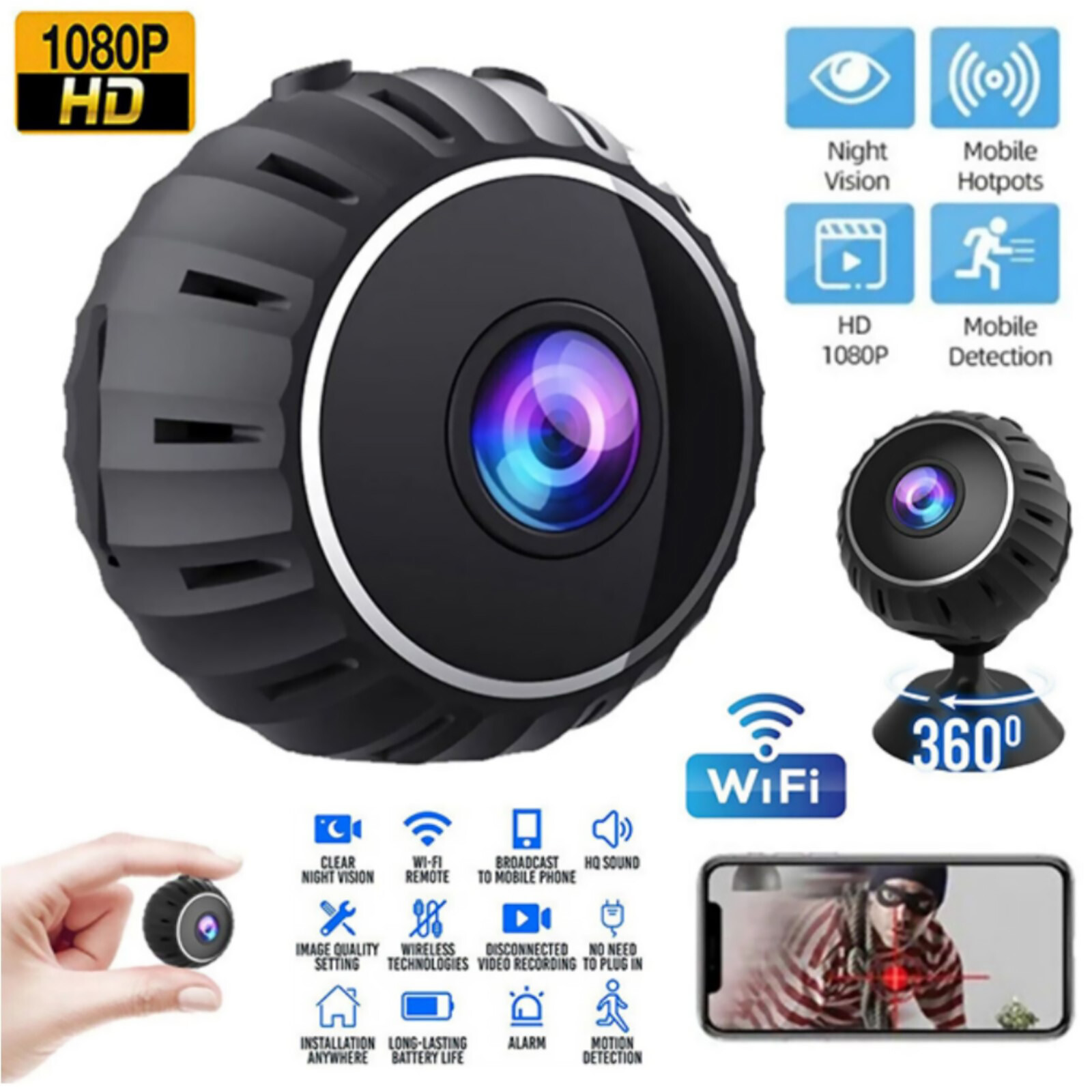 SAFE & SECURE SHOPPING 100% SATISFACTION GUARANTEED FAST SHIPPING Store Categories Store Categories You may also like 1080P Security Camera HD Night Vision Motion Detection Wireless Home Camera Product Description Features: Global Remote Monitoring: With the WiFi camera, you can remotely view live video anytime, anywhere through the mobile app (supporting for Android and for iOS). Simply connect to a 2.4GHz WiFi network to ensure the security of your home or office, no matter where you are in the world. Versatile Application Scenarios: The compact, round design of the WiFi security camera makes it suitable for various settings. Whether used as a nanny cam, pet cam, or doorbell cam, it excels in its role. Place it in corners of your home, warehouse, backyard, store, office, and more for comprehensive monitoring. HD Night Vision and Motion Detection: Equipped with 1080P HD imagery and infrared night vision, the camera captures clear details even in complete darkness, with a night vision range of up to 10 meters. The IR-CUT automatic switching technology ensures optimal picture quality day and night. Additionally, upon detecting movement, the camera immediately records and sends push notifications to your phone, keeping you informed of any unusual activity. Multi-User Sharing and Privacy Protection: The camera supports multiple users and devices viewing videos simultaneously. Through the app's sharing service, you can freely share surveillance footage with family and friends. Moreover, the camera owner can set and change passwords, delete or authorize access, ensuring the safety and reliability of your family's privacy. Convenient Storage and Upgrade Capabilities: The camera supports an external 128GB memory card (not included) for 24hrs video recording or alarm-triggered recording. Video playback is flexible, accessible via the mobile app. With a 150° wide-angle lens, it offers a broad field of view. Furthermore, remote firmware upgrades via the network ensure the camera remains in optimal condition. Specifications: Material: ABS Size: 3*3*2.3cm / 1.1*1.1*0.9in Color: Black Battery capacity: 250 mAh Platform: For 365Cam Resolution: 1080P Video encoding: H.264 Video frame rate: 1-30 frames Focus mode: Manual Video Control: Support Motion detection: Yes Supply voltage: 5V1A Working temperature: 0°C-55°C Quantity: 1pcs Package Included: 1 x Camera 1 x Support 1 x Data line 1 x Instructions Shipping Returns Contact Us Payment Shipping We ship most of our orders within 24 hours, and may up to 48 hours. If you want faster shipping way, please contact us before making a payment. Sometimes due to problems with our transportation company system, your shipping information may be delayed to update. We recommend that you try again after 3-4 days. If you still haven't checked the shipping information, you can contact us via ebay message. Returns 1. 30 days warranty from the purchased date. Please contact us via email before returning the defective item. 2.Our warranty does not extended to any product that are physically damaged or that are not under normal operating conditions as result of misuse or improper installation on the buyer/user's part. 3.Return items should include the original packaging and all accessories. buyers MUST contact us for the returning address. 4.In all cases, buyers pay shipping fees at their own cost to return products for exchange or refund. We will be responsible for the postage of replacements. Refund will be made upon receipt of the returned item. Contact Us Pls contact us if you have any problems,we will try our best to solve for you Payment We accept all verified payment from eBay. Copyright © 2022 Tongtool