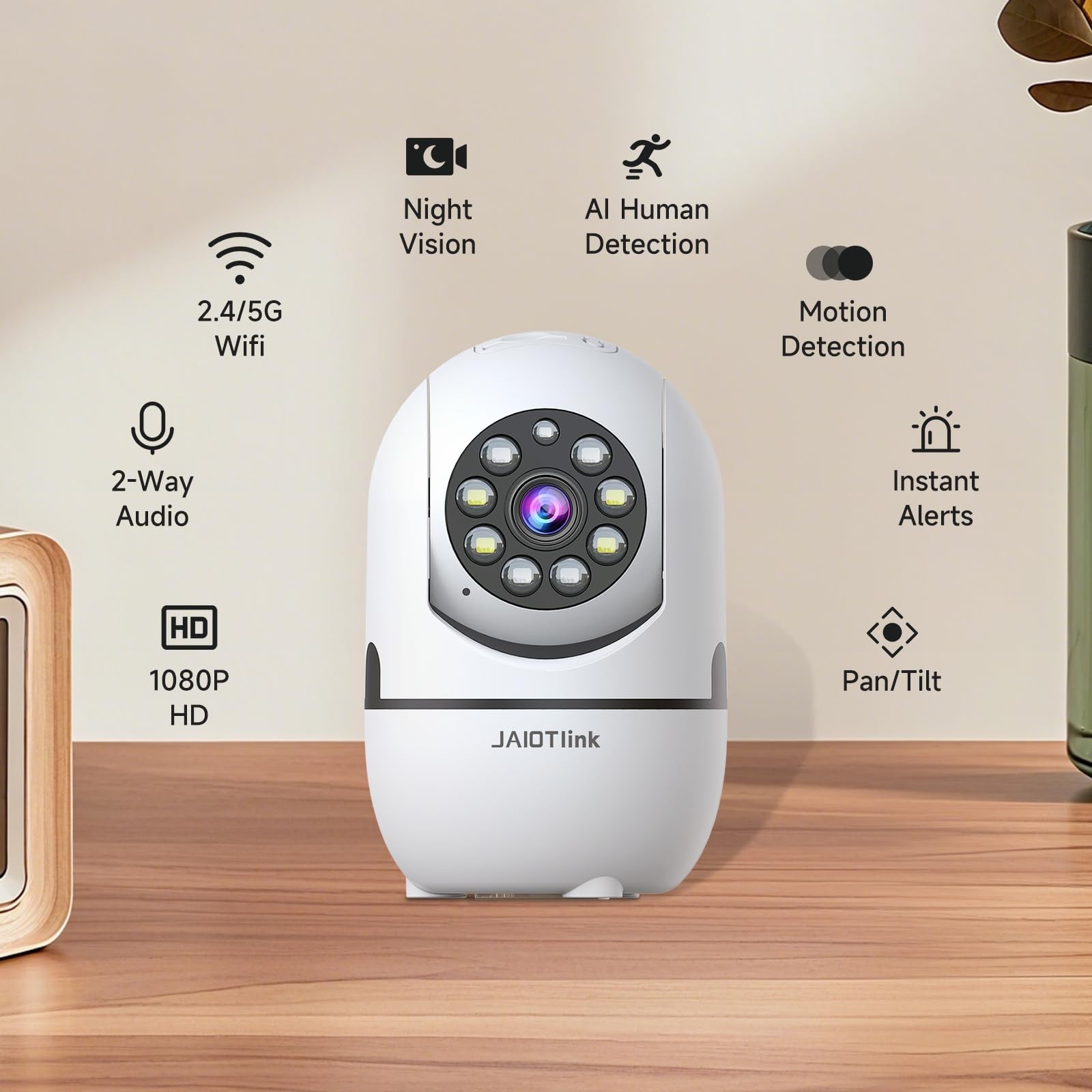 1080P Indoor Security Camera provides an all-in-one solution for keeping your home safe, secure, and connected. Whether you’re monitoring your baby, pet, or the entire home, this camera delivers crystal-clear HD video and advanced features like Color Night Vision and Motion Detection to ensure you never miss a moment. Cute Big-Eyed Design: Designed with an adorable big-eyed look, this indoor camera blends smart technology with a playful appearance. Its friendly design makes it a charming addition to baby rooms, pet areas, or modern home décor. So it is a good chocice as pet cameras or baby monitors. 1080P HD & Color Night Vision: Enjoy clear 1080P HD video day and night. With advanced full-color night vision, this camera delivers vivid images even in complete darkness—ideal for monitoring rooms, hallways, or yards. Dual-Band 2.4GHz & 5GHz WiFi: Supports both 2.4G and 5G WiFi for faster, more stable streaming. Whether you're checking in on your loved ones or pets, you’ll experience smooth real-time video without delays or buffering. 360° Coverage with Smart Motion Tracking: Offers 355° pan and 110° tilt for complete room monitoring. The camera automatically follows moving objects and supports customizable motion detection zones to focus on what matters most. Optional Cloud & Local Storage: Supports cloud storage and microSD cards up to 256GB (not included). Choose the storage method that fits your needs for easy playback and backup. Two-Way Audio & Alexa Compatibility: Built-in microphone and speaker let you communicate in real time—talk to pets, family, or visitors directly via the app. Fully compatible with Alexa for hands-free live view with simple voice commands.