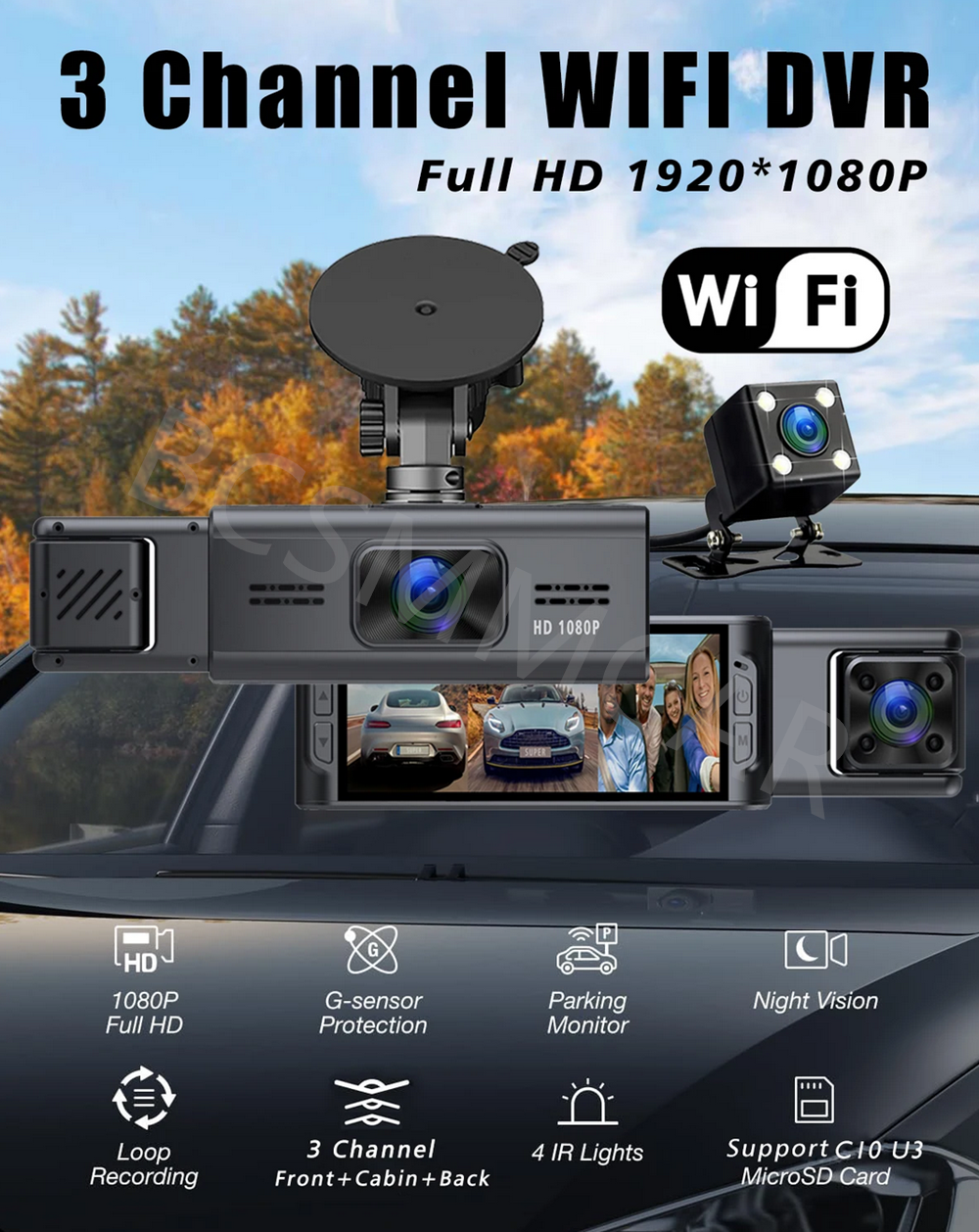 Product View Detail Wifi 3 Channel Car DVR 1080P Dash Camera Three Lens Dashcam Vehicle Video Dash Cam Drive Recorder Interior Mini DVR Warm tips: Our products are available with WIFI version The new high-definition 3-lens dash cam features built-in WiFi support for iPhone and Android phone connectivity, making it easy for your phone to view videos. Mobile App Connection Cell phone APP connection, real-time view of the data, 2.4Ghz wifi download speed, at any time to download driving video. How to Link WIFI You need to press the M menu button for 5-10 seconds and then it will show the WIFI module, the WIFI QR code is also in the menu bar, and you can eventually link your phone to view the video. Product Function 1. Support 4-32G memory card(not included memory card ) 2. Parking monitoring 3. Loop Recording 4.170° wide angle 5.3.16 inch screen 6. Support camera function 7.1080P resolution 8.4 ir LEDs 9.G-senor& LOCK 10.Motion Detection Product Parameter Screen size: 3.16 inches Power: DC 5V 2A G-sensor: support Picture in picture: support Parking monitoring: support DDR: Built-in 64M Night vision fill light: support Lens angle adjustable: support Anterior chamber angle: 170° Internal angle: 110° Rear camera angle: 110° Front camera resolution: 1080P Camera interior resolution: 480P Rear view camera resolution: 480P Front camera aperture: F2.0 Video Resolution: 1080P FDH / 720P/VGA Storage compression: H.264 Video Format: AVI Image Format: JPEG Back view camera cable length: 6m/2.5mm plug Product included 1*Dash Camera 1*Bracket 1*User Manual 1*Car Charger 1*Rearview Camera with 6M Cable About Formatting The Memory Card: When installing a memory card for the first time, be sure to format the memory card on the DVR. After formatting, the DVR can correctly match the memory card. Formatting Steps: After installing the memory card, please enter the DVR menu, find the format option, and click to format the memory card.(Important: Formatting the memory card on the computer is an incorrect operation. Please be sure to format the memory card on the DVR's menu option.) About WIFI Connection: Before connecting to the DVR on the phone, it is necessary to install the WIFI connection app "Viidure APP" in advance.You can search for "Viidure" installation in the Apple App Store or Google App Market. Steps: (1) In standby mode, long press the "M" key to enter the DVR menu and enter the WIFl setting menu; (2)In the wifi menu of the DVR, check to obtain the wifi SSID name and password; (3)Open the "Viidure" APP on your phone, enter the configuration mode, turn on the wifi function of the phone, follow the prompts to find the SSID wifi signal of the DVR and enter the password to connect; (4)After successful configuration, you can connect and operate the DVR through the "Viidure" APP. About 24-Hour Parking Monitoring: (Need to extra order Buck line ) If you need the 24 hour parking monitoring function, you can order the corresponding Buck Line accessories to replace the car charger.Through Buck Line, the DVR power can be obtained directly from the car battery or car ACC, so that the DVR can maintain normal recording work even when the car is turned off.(Since different car models have different battery interfaces or ACC interfaces, it is not recommended to install it by yourself. It is recommended to find a professional to install the Buck Line.) Shipping Policy Payment Method Returns Policy Shipping Policy Payment Method Returns Policy Copyright © 2017 DataCaciques Home Payment Shipping About us Contact us BCSMMCAR Store Categories Store Categories Other Product View Detail Wifi 3 Channel Car DVR 1080P Dash Camera Three Lens Dashcam Vehicle Video Dash Cam Drive Recorder Interior Mini DVR Warm tips: Our products are available with WIFI version The new high-definition 3-lens dash cam features built-in WiFi support for iPhone and Android phone connectivity, making it easy for your phone to view videos. Mobile App Connection Cell phone APP connection, real-time view of the data, 2.4Ghz wifi download speed, at any time to download driving video. How to Link WIFI You need to press the M menu button for 5-10 seconds and then it will show the WIFI module, the WIFI QR code is also in the menu bar, and you can eventually link your phone to view the video. Product Function 1. Support 4-32G memory card(not included memory card ) 2. Parking monitoring 3. Loop Recording 4.170° wide angle 5.3.16 inch screen 6. Support camera function 7.1080P resolution 8.4 ir LEDs 9.G-senor& LOCK 10.Motion Detection Product Parameter Screen size: 3.16 inches Power: DC 5V 2A G-sensor: support Picture in picture: support Parking monitoring: support DDR: Built-in 64M Night vision fill light: support Lens angle adjustable: support Anterior chamber angle: 170° Internal angle: 110° Rear camera angle: 110° Front camera resolution: 1080P Camera interior resolution: 480P Rear view camera resolution: 480P Front camera aperture: F2.0 Video Resolution: 1080P FDH / 720P/VGA Storage compression: H.264 Video Format: AVI Image Format: JPEG Back view camera cable length: 6m/2.5mm plug Product included 1*Dash Camera 1*Bracket 1*User Manual 1*Car Charger 1*Rearview Camera with 6M Cable About Formatting The Memory Card: When installing a memory card for the first time, be sure to format the memory card on the DVR. After formatting, the DVR can correctly match the memory card. Formatting Steps: After installing the memory card, please enter the DVR menu, find the format option, and click to format the memory card.(Important: Formatting the memory card on the computer is an incorrect operation. Please be sure to format the memory card on the DVR's menu option.) About WIFI Connection: Before connecting to the DVR on the phone, it is necessary to install the WIFI connection app "Viidure APP" in advance.You can search for "Viidure" installation in the Apple App Store or Google App Market. Steps: (1) In standby mode, long press the "M" key to enter the DVR