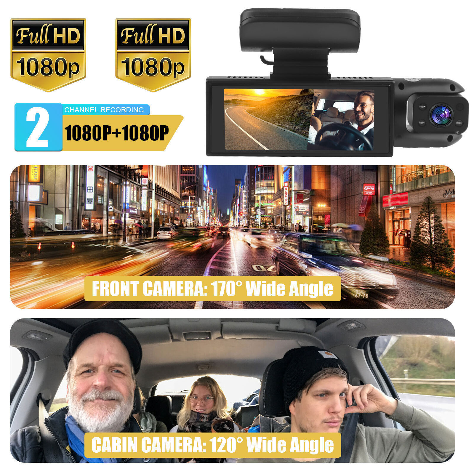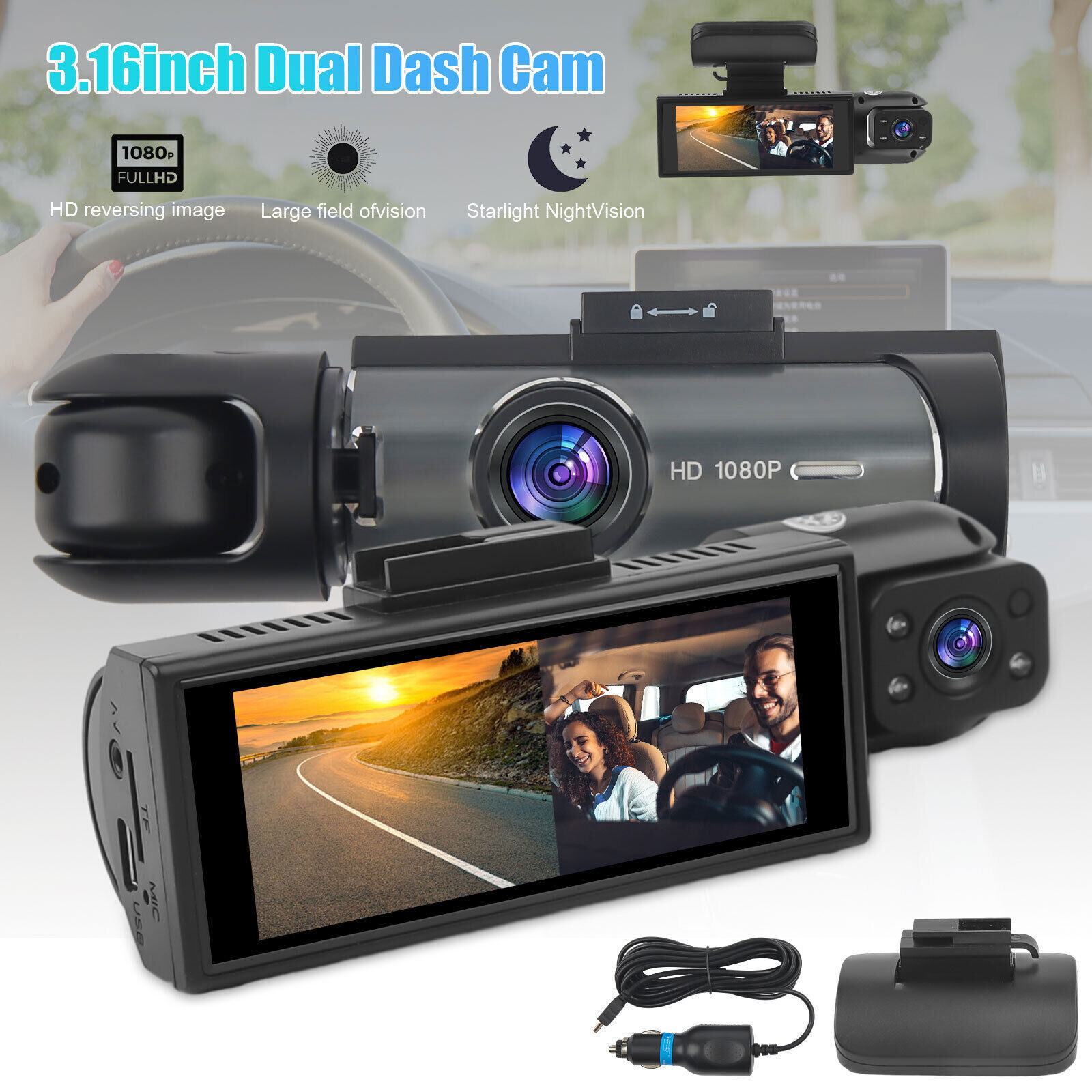 Dash Cam HD 1080p Car Dual Lens Front/Inside Video Recorder Camera G-sensor US 1.Loop Recording & Auto Emergency Recording: Seamless loop recording overwrites the old footage with new content when the card is full. When G-Sensor detects sudden collisions, the car dash will immediately start recording and lock the related footage, protecting your video evidence from being overwritten. Help you avoid endless quarrels. This dashboard camera supports up to 32GB of micro SD card(Note: Card not included). 2.Dual Lens Shooting: This dash cam is equipped with dual camera. One records the front of your car, and the other records the interior of your car. 3.1080P HD Lens & 170°Wide Angle: 1080P resolution front camera with 170 degree wide field of view provides outstanding image quality and captures more details. 4.Parking Monitor: The dash cam automatically turns on and starts recording the minute movement is detected. If your car suffers from malicious scratches, it can give you strong evidence. Provide 24-hour monitoring of your car. Some settings for daily use are suggested: G-sensor level choose" low" , or turn off; loop recording choose "3 minutes"; motion detection choose "off" ; parking monitor choose "On". Scheme:Lingtong 2247 Pixel pixel: 500W Lens lens GC1054+in the car V06 non -light night visual induction light Resolution resolution: 1440*720p/30 frames G-Sensor: support Wifi: support Display screen: 3.16 -inch IPS screen View Angle: 170 degrees Cycle Recording loop video: support TEMP-Park Motion Record Parking Guard/Parking Monitoring Motion Detection mobile detection Function: support Date Stamp Date Floating Watermark: Support Memory Card memory card: 32GB (support, not included) Power Interface Power Interface: USB2.0 Battery battery: 150mAh Output output HDMI Current Frequency frequency 50/60Hz Language language Russian, JAPANESE, French, italian, German, English,Chinese (SIMPLIFIED), Chinese (TRADITIONAL), Korean, Spanish, Portuguese. Operation TEMP operating temperature -20 ° -+70 ° Package includes: 1x 1080p Dual Dash Cam 1X user manual 1X Car Charger 1X Suction Cup Holder