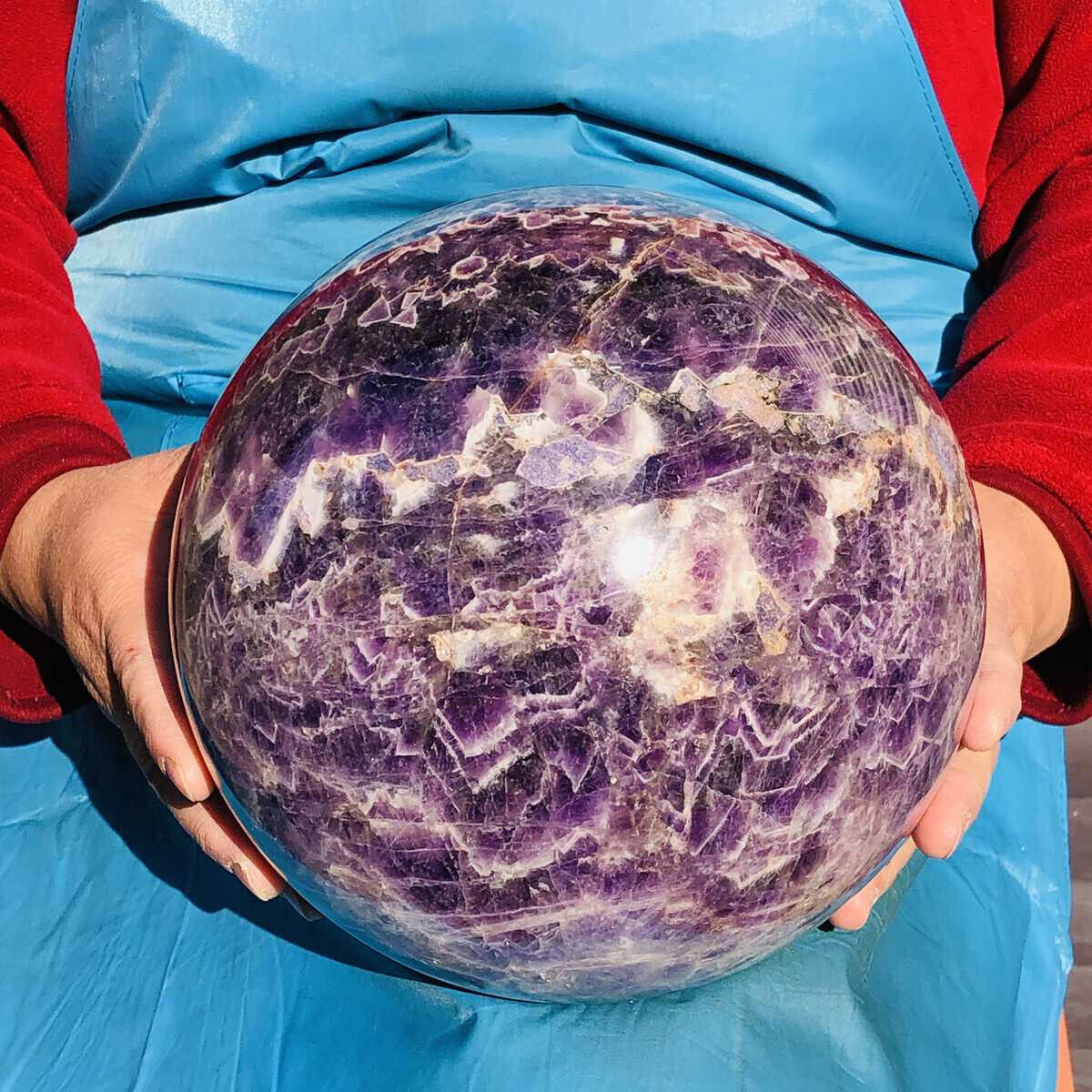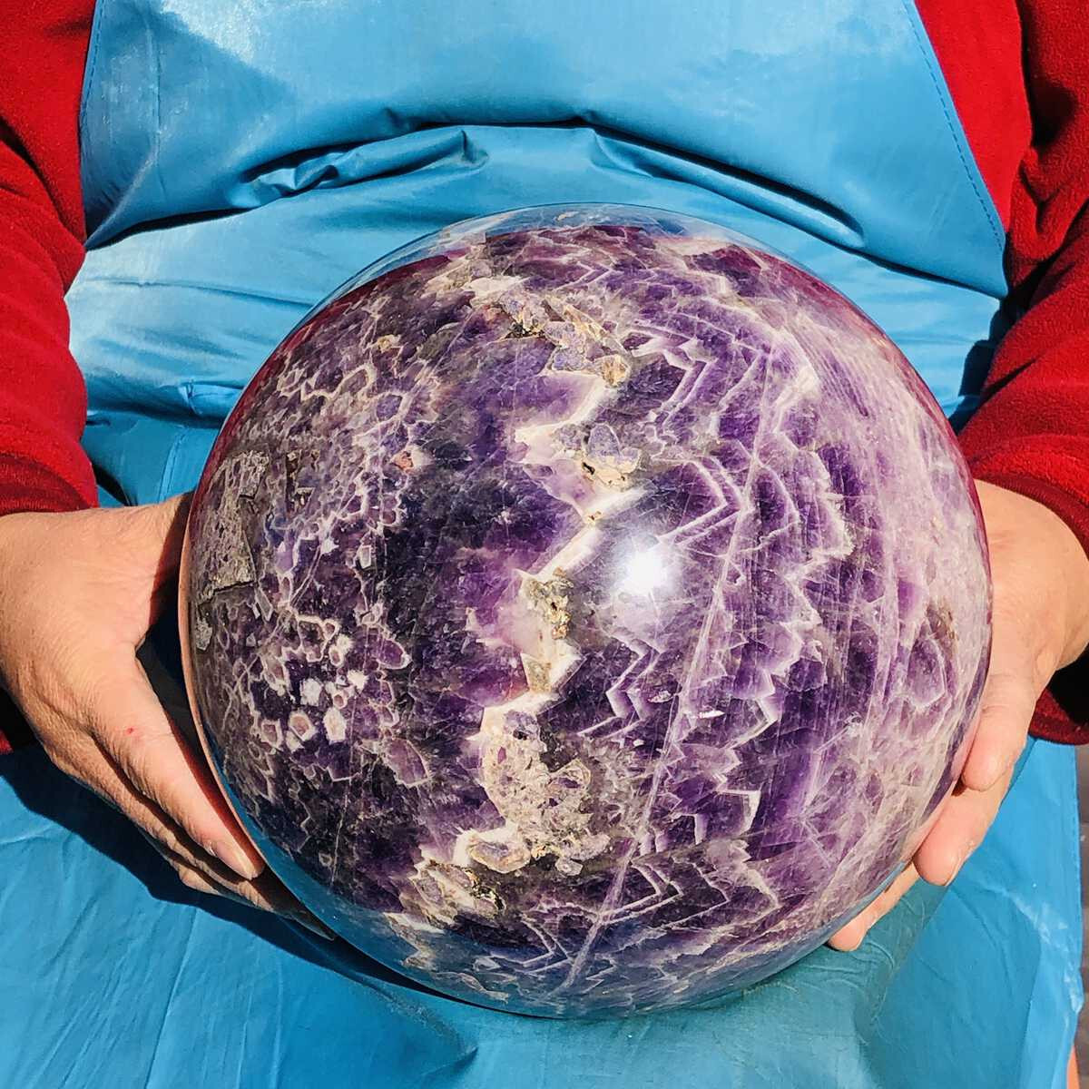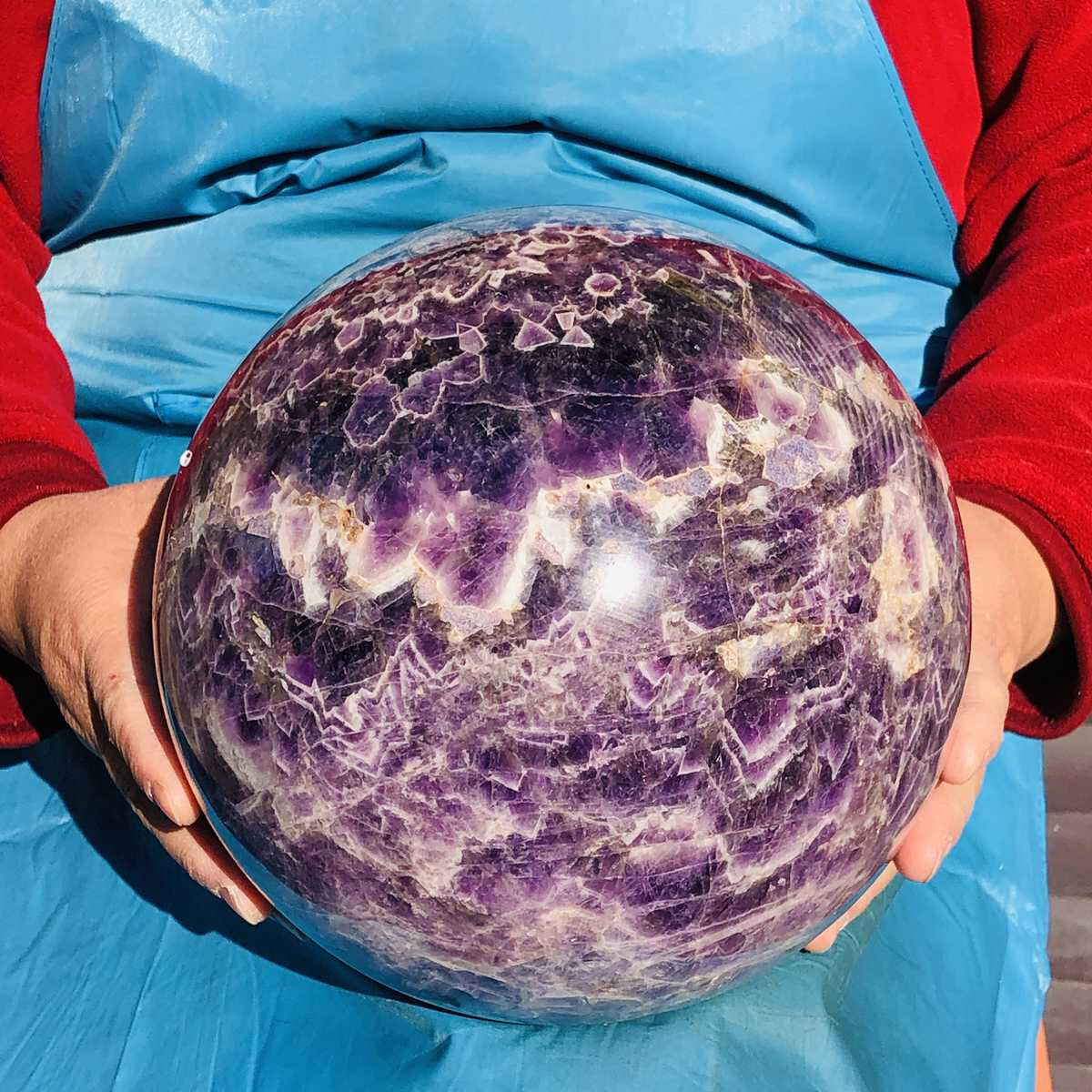 This stunning amethyst sphere is absolutely breathtaking! The deep purple hues and natural patterns make it a true centerpiece. It feels solid, well-polished, and radiates positive energy—perfect for meditation or home decor. The size is impressive, and it arrived carefully packaged. Definitely worth it for crystal lovers!