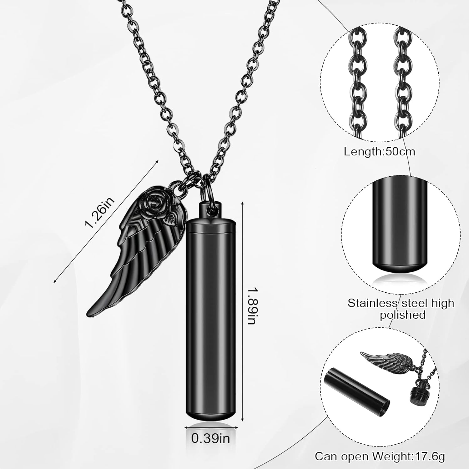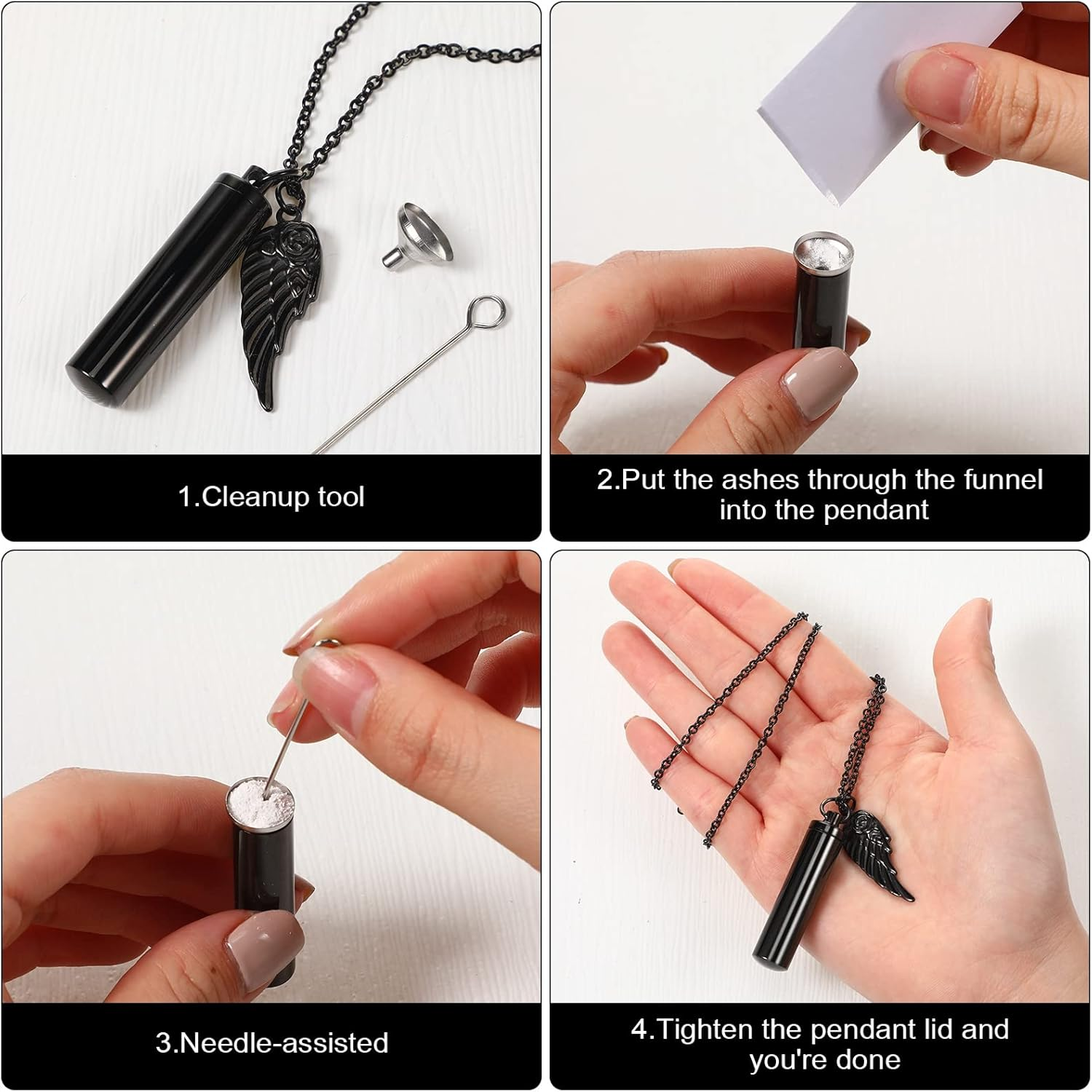 Store New Arrivals Add to Favorite View Feedback Contact Fast deliveries to the customer's home Quality customer service John Make the customers happy! 10 Pieces Urn Necklace for Ashes Cylinder Cremation Jewelry with Angel Wing Charm Memorial Pendant Keepsake for Women Men Vial Cremation Ash Pendant(0.43 X 1.89 Inch,Black and Silver) Description Abundant Quantity: you will receive 10 pieces of necklace holder for ashes, 2 pieces of stainless steel funnel and 2 pieces of needles, enough quantity to meet your daily use and replacement, you can share them with your friends Long Time to Use: the urn necklace set is made of stain steel material, strong and practical, not easy to fade and lose shape, with smooth face and reliable material, which can be applied for a long time Size Details: the size of these memorial necklaces for ashes are 8 x 39 mm/ 0.31 x 1.54 inches, the length of the chain is about 50-55 cm/ 19.68-21.65 inches, the funnel is about 12 mm/ 0.47 inch, suitable for most people Memorial Jewelry: these urns for human ashes necklaces can be applied to honor your loved one by placing their ashes or a lock of hair, skin that represents them inside a cylinder cremation urn near your heart to express how much you cherish them, or you can put dried flowers, perfume or something else as you like Gift Choice: our stainless steel urn necklace is suitable for your friends, colleagues, parents or someone who means a lot to you, which can be applied as a gift for anniversary, Valentine's Day, birthday, they will be satisfied Features: Elegant appearance: These urns for human ashes necklace are designed with elegant single wing appearance, which can make you more charming in the crowd. Memorize decorations: These urn necklaces for ashes are suitable to decorate your neck, which can match with different clothes, you will be happy. Specifications: Main material: stainless steel Color: silver Size of memorial necklaces for ashes: 11 x 48 mm/ 0.43 x 1.89 inches Length of the chain: 50-55 cm/ 19.68-21.65 inches Size of funnel: 12 mm/ 0.47 inch Package includes: 10 x Ashes necklaces Notes: Manual measurement, please allow slight errors on size. The color may exist slight difference due to different screen displays. Item Diameter 8 Millimeters Batteries required No Pattern Wing Material Stainless Steel, Metal Country of Origin China Item Weight 0.27 Kilograms Color Black and Silver Opening Mechanism Threaded Finish types Polished Finish Type Polished Product Dimensions 0.31"L x 0.31"W x 1.54"H Size 0.43 x 1.89 Inch ABOUT US We offer the best prices around on high quality products. Our E-store includes media such as books, movies, music and games while offering electronics, toys, sporting apparel, clothing, tools, general home, garden items and more. SHIPPING We are always working hard to ensure your package arrives as soon as possible. Please understand that some factors like weather, high postal traffic, and the performance of shipping companies are outside of our control. We offer free shipping to the lower 48 states and ship within 2 business days of payment, usually sooner. We do not accept P.O. Boxes. Please provide a physical address. For shipping outside of the continental USA, we only use eBay's Global Shipping Program. The item is shipped to KY and then sent to the rest of the world. International customers are responsible for all duties and taxes. Continue to 'check out' to calculate costs for shipping the item to your country. Messages regarding eBay's Global Shipping Program MUST be directed at eBay EXCLUSIVELY. RETURNS We offer a 30-Day Return Policy on items in which you are not completely satisfied with. You have the option of a full-refund or an exchange of the item. No returns are available on items shipped outside of the USA PAYMENT We accept PayPal. CONTACT US This page content is yet to come Please ad us to your favorite seller and visit again later Thank You CUSTOMER SATISFACTION We try our very best to make sure every customer is completely satisfied. If there's a problem, message us! We're happy to help. WE ACCEPT