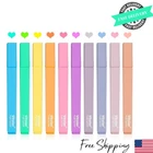 Mild and Bright Color 10 different colors of aesthetic cute highlighters,5 mild colors protect your eyes from irritation and distraction,5 bright colors won't obscure the key points. Quick Drying and No Bleeding The ink of these aesthetic pens is water based, dries quickly, so you don't need to wait for a long time, no need to worry that the ink would make your hands and sleeves dirty. Type: Highlighter Point Type: Chisel Ink: Water-based Number of Pieces: 10 Smooth Writing The aesthetic highlighters are designed with Square Shape ,easy to hold and the free-flowing ink with a soft chisel tip allow you to write something smoothly for the handwriting, notes, journal and so on. No Bleed The ink of cute highlighters is water-based so that it can dry quickly.It won't bleed through pages under proper use unless you're using very thin papers or pressing highlighters very hard while using. Not Easy to Lose There are a protruding design at the end in the pastel highlighters,which makes cap placed on it.You don't have to worry about losing the cap.