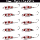 Features : Weight : 1.5g / 2.5g / 3.5g/5g (approximate) Length: 2.2cm / 2.6cm / 2.8cm/3cm(approximate) Color: Silver Gold Packing includes : 10 Piece Fishing Lures
