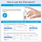 【Compatible Model】iPad pen is ONLY compatible with ipads released in 2018 or Later. Here are all compatible Model: ipad Pro 13" (M4), iPad Pro 12.9"(3rd/4th/5th/6th), iPad Pro 11"(All Generations), iPad Air M3/M2/5th/4th/3rd Gen, iPad 11/10th/9th/8th/7th/6th, iPad Mini 6th/5th Gen. Please go to Setting>General>About to confirm your iPad's model before placing order. 【13 Minutes Fast Charging & Long Use Time】 This iPad pencil charges fully in 13 minutes and allows 9 hours of continuous use. It auto shuts down after 10 minutes of inactivity to save power, flashing in the last minute of the 10-minute sleep mode and stops when picked up. 【How to Power On/Off】PLEASE NOTE: This stylus doesn’t have Bluetooth. Single press the top button of the stylus to turn on/off easily without connecting Bluetooth. If you find it doesn't work after turning on, please turn off Bluetooth: Settings > Bluetooth > Turn off Bluetooth, or follow the steps to disconnect the Bluetooth connection between your iPad and Apple Pencil: Settings > Bluetooth > Apple Pencil > tap "i" > Forget this device. 【Power Display】This pencil for iPad is equipped with a built-in indicator light that provides a clear and convenient power display, ensuring you can easily and clearly see the remaining power in any situation and alleviating concerns about battery life. Power display: three lights on: 60%-100% power, two lights on: 20%-59% power, one light on: less than 20% power. 【Palm Rejection & Magnetic Attraction】No need to wear anti-friction gloves as you can rest your hand on the screen without worrying about accidental touches. The upgraded built-in magnet in the pencil for iPad offers stronger attraction than the original Apple Pencil and firmly attaches to the side of iPad, including the iPad 10 (which is a unique feature that other styluses do not offer). This enables easy portability and prevents the stylus from slipping or getting lost. 【Tilt Sensitivity & High Responsive】The 1.5mm tip can handle finer details without delay, interruption or skipping and is more sensitive than a passive stylus. The tilt-sensing technology allows you to draw lines of different thicknesses on the screen based on the angle of the iPad pencil, making writing and drawing more free. The stylus for iPad doesn't support pressure sensitivity. For more replacement tips, please search B0CCY67B9Y on Amazon. Product Description 1 Palm Rejection 2 Magnetic Attraction 3 Tilt Sensitivity 4 Package List 1 Drawing 2 Studying 3 Playing Game 4 Working Please Note: This iPad pencil doesn't have Bluetooth. If your iPad pencil doesn't work after turning on, please follow these steps to disconnect the Bluetooth connection between your iPad and Apple Pencil : Settings > Bluetooth > Apple Pencil > tap "i" > Forget this device.