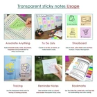 Transparent Sticky Notes, Waterproof, Adhesive,6 Bright Neon Colors, Clear Sticky Notes for Note Taking, Annotation, Highlighting, Reminders, Tracing, Journaling, Sketching 1150 Pcs Transparent sticky Notes - Waterproof Clear Sticky Notes set |sticky book tabs, Index, arrow, pastel tabs & see through sticky notes for book annotation, & cute office supplies ✳️【Premium Quality】Clearly see & highlight key points without covering text our translucent Post it sticky notes and post it tabs. Made from waterproof PET material for a smooth writing experience, long-lasting durability & no curling. The strong adhesive ensures a firm grip yet allows repositioning without residue. Perfect for studying, annotating, and organizing, this set of clear post it notes and tabs makes note-taking effortless with quality. ✳️【Enhanced Productivity and Organization】Boost efficiency with our versatile see through sticky notes and post it flags, perfect for teachers, students, professionals, designers, and researchers. These stickey notes help categorize ideas, highlight key points, and annotate books, while colorful tabs enhance collaboration and creativity. Ideal for home, , and office use, this set of posted notes makes organizing effortless. ✳️【Multi Purpose】A practical tool to write, mark, or highlight without permanent changes. Our clear post it notes transparent are ideal for annotation, schedule planning, journaling, sketching, studying, tracing, and quick notes. Use as annotation tabs to index pages, create reminders, or bookmarks. A versatile book annotation kit that keeps ideas organized and pages protected—perfect for students, teachers, professionals, and creatives. ✳️【Pack | Ideal Gift】Our Transparent sticky Note pads feature an impressive range of 1150 PCS, including arrow tabs, annotation tabs, index tabs, sticky book tabs, and see through sticky notes. By incorporating these beautiful sticky notes into your documents, you can give them a CREATIVE & ELEGANT touch. What's more, these sticky notes are BEAUTIFULLY PACKAGED in a durable sticky note holder, which not only keeps them organized but also makes them an ideal choice for a perfect gift. ✳️【VALUE PACK INCLUDE】A Complete 1150 PCS Translucent sticky notes PACKAGE INCLUDES|Transparent sticky notes - 7 pads (350 Sheets)||Index Flag Tabs for Notebooks - 16 pads (320 Sheets)|| Sticky Index Arrow tabs - 16 pads (320 Sheets)||Book Pastel tabs - 8 pads (160 Sheets). [TIPS FOR STICKY NOTES: kept in a cool, dry place for keeping stickiness. Use oil-based pens or pencils on the waterproof PET material, or allow water-based pens to dry before handling].