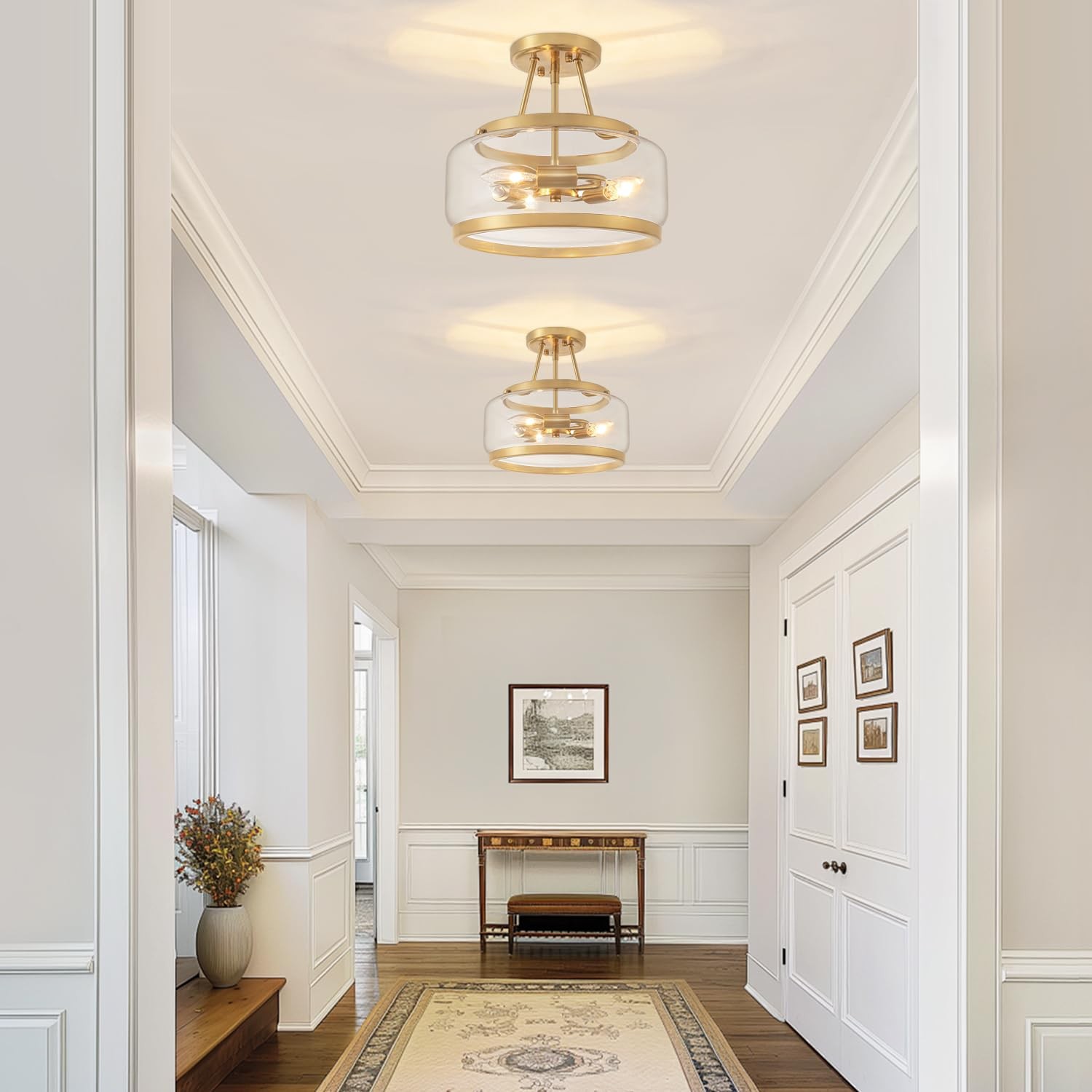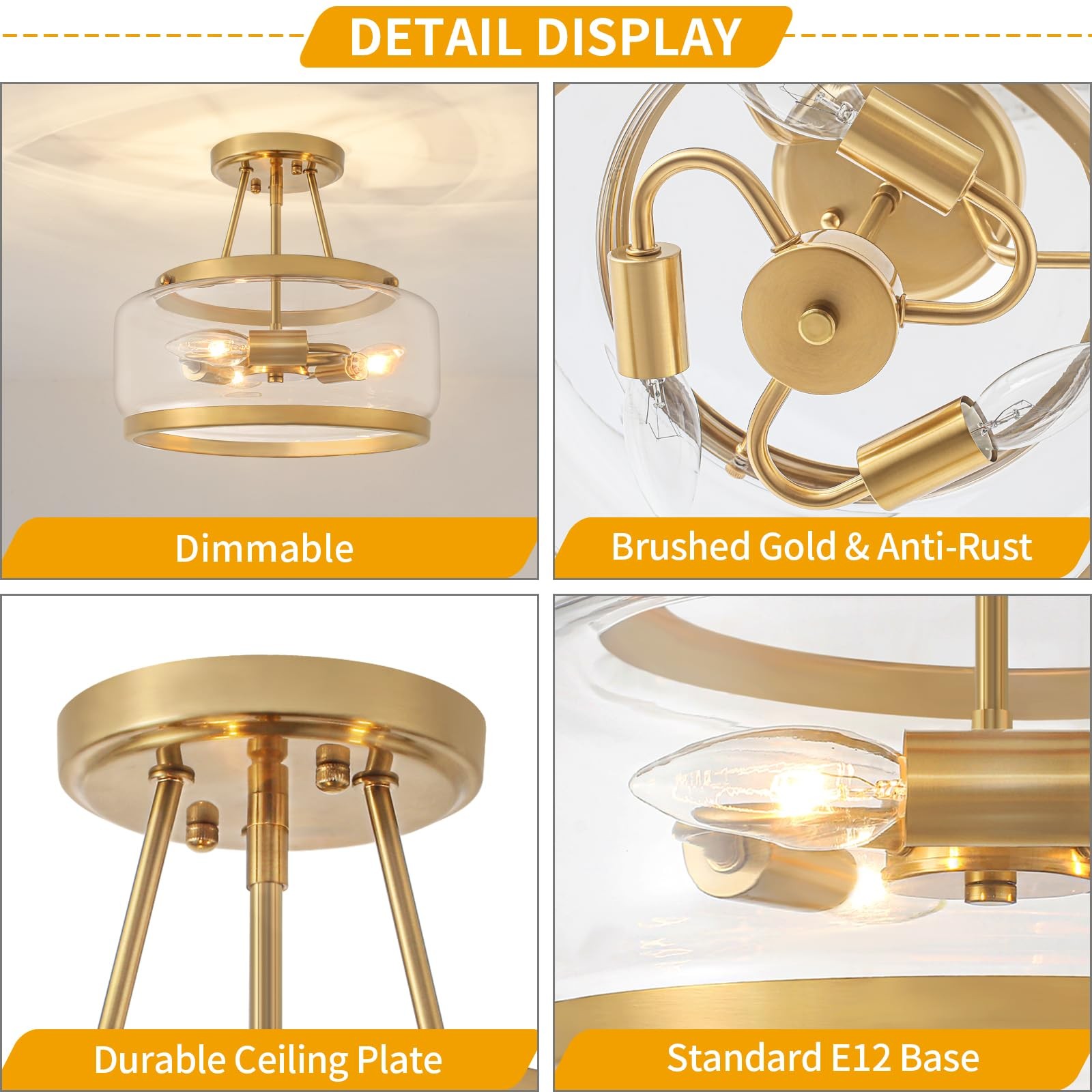 glass ceiling light, glass light fixture, brushed gold light fixture, brushed gold flush mount ceiling light, hallway light, hallway ceiling light fixtures, hallway lights, entry light, entryway light fixture, entry light fixture, entry light fixtures ceiling, semi flush mount lights, brass light fixture, semiflush mount ceiling lights, brass semi flush mount ceiling light, gold semi flush mount ceiling light, gold ceiling light fixture, gold kitchen light fixtures, semi flush mount ceiling light gold, semi flush mount light, gold light fixture, ceiling lamp, semi flush mount light fixture, gold ceiling light, gold semi flush mount ceiling light, light fixtures ceiling mount, foyer lighting fixtures, laundry room light fixture, Ceiling Lamp, dining room light fixture, kitchen lighting fixtures ceiling, kitchen light, ceiling light fixtures, kitchen ceiling light, room light, bedroom ceiling light, kitchen lights ceiling, bedroom light, dining room light, close to ceiling light fixtures, modern ceiling light, bedroom lights for ceiling, light for bedroom, light for room, modern light fixtures ceiling, living room light, living room ceiling light, living room light fixture, dining light fixture, bathroom light fixtures, bathroom ceiling light, bathroom light fixture, bathroom ceiling light fixtures, pantry light, closet light, closet light fixtures, hallway ceiling light ✨ BRUSHED GOLD CEILING LIGHT — Crafted from premium metal and thick glass, this brushed gold light fixture features a solid, rust-resistant frame that’s easy to clean and built to last. The cylindrical clear glass shade is beautifully accented by slim golden metal rings at the top and bottom, creating a perfect blend of modern light fixture charm and industrial light fixture structure. This semi flush mount ceiling light fixture sits close to ceiling and fits effortlessly in spaces like hallway light fixtures, entryway light fixture, or kitchen light fixtures ✨ 3 LIGHTS SEMI FLUSH MOUNT CEILING LIGHT — Inside the glass shade, three standard E12 bases support a variety of E12 bulbs (up to 40W), offering dimmable functionality with compatible bulbs and switches (not included). Combined with the brushed gold rod and socket, this modern light fixture casts a warm, inviting glow. The golden tones enhance the brushed texture, while the sleek golden lines add a soft industrial edge—striking a balance between cozy and contemporary ✨ MULTI-SPACE LIGHTING — Versatile and stylish, this ceiling light fixture suits a range of design aesthetics—from modern minimalist to transitional and vintage industrial. It works beautifully as a dining room light fixture, bathroom light fixture, bedroom ceiling light, laundry room light fixture, or living room light fixture. Whether you're refreshing your kitchen ceiling light fixtures or upgrading hallway light fixtures ceiling, this adaptable design complements any indoor setting ✨ SIMPLE INSTALLATION — This light fixture dimensions: top plate diameter – 5.11", Height – 9.84", Width – 10.7". Comes with all mounting hardware for quick assembly and installation. Simply attach the base and glass, mount to your home wiring, and insert bulbs—your stylish light fixture ceiling will be ready to shine as a modern light fixtures ceiling addition to your home ✨ UL LISTED ROOM LIGHT — For safety and peace of mind, this modern ceiling light fixture is UL Listed—ensuring reliable performance. The open-bottom glass design allows for easy bulb replacement and enhanced heat dissipation, maximizing brightness and lifespan. 💡 If you have any questions, we’re always happy to assist