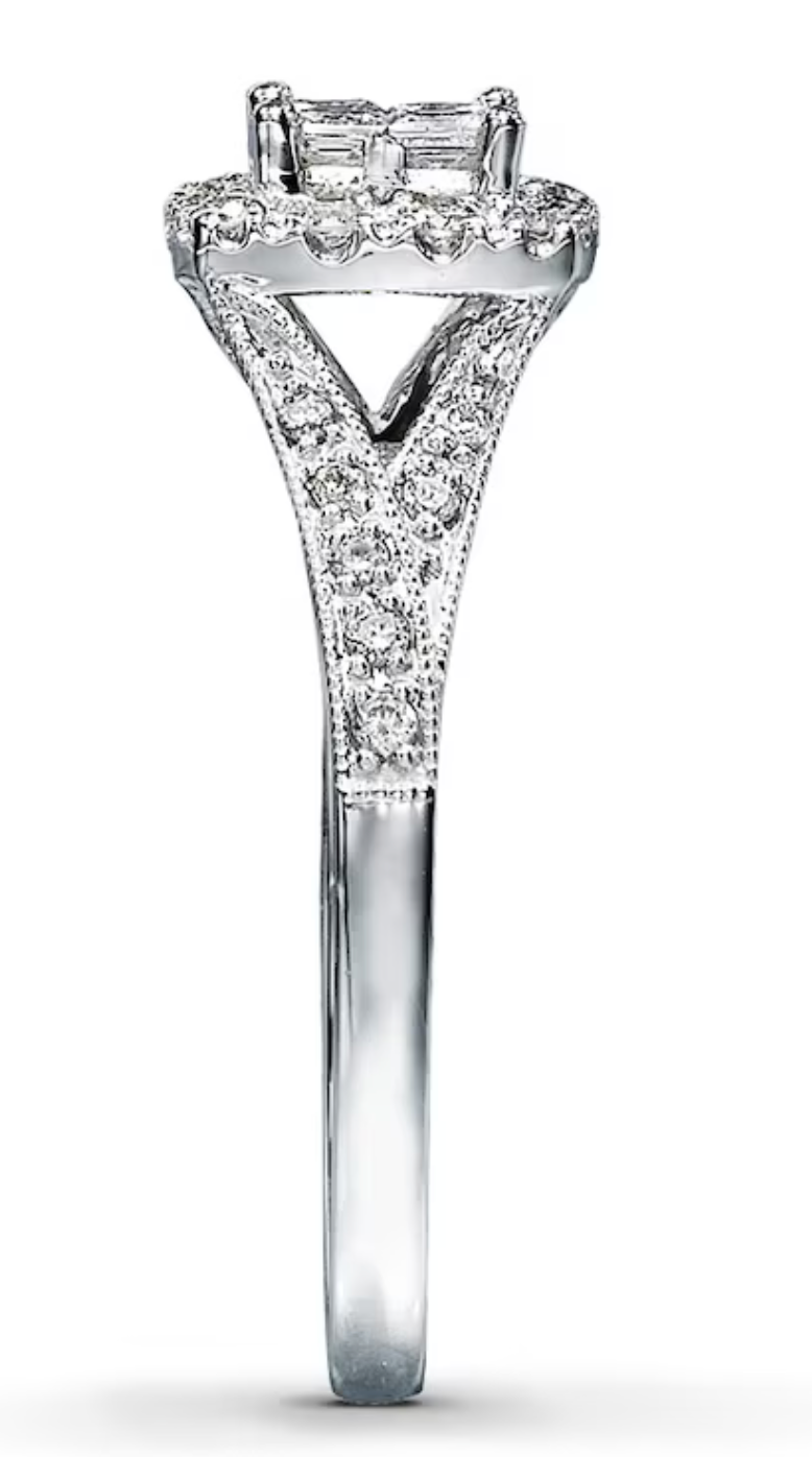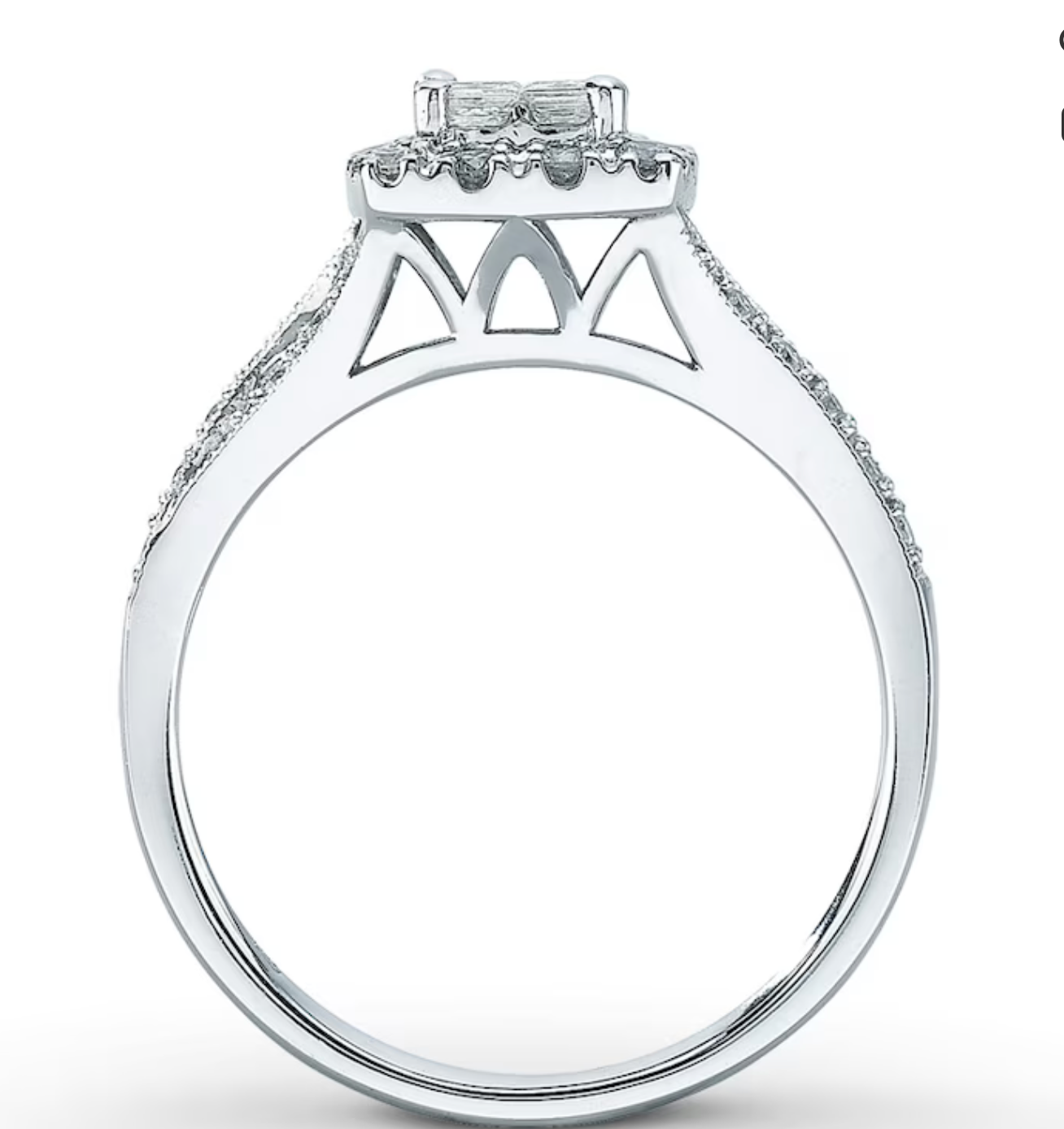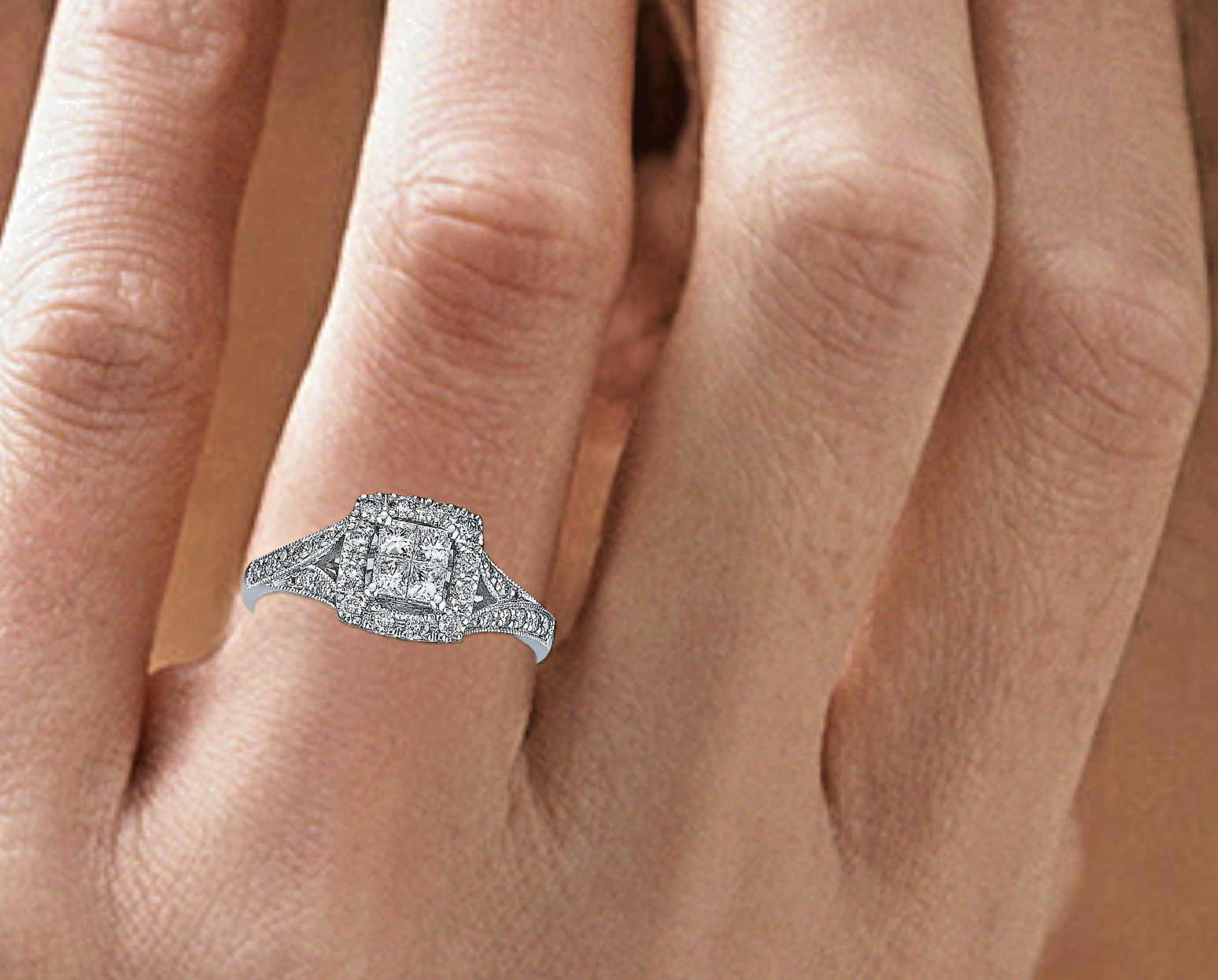 A quartet of princess-cut diamonds creates an amazing look in this engagement ring. Round diamonds frame the centerpiece and flow along the romantic 14K white gold band. This fine jewelry ring has a total diamond weight of 1/2 carat. Total Weight (CT. T.W.): 1/2 Color: I Clarity: I2 Stone Type: Diamond Stone Color: White Stone Shape: Princess-Cut Stone Class: Natural Stone 2 Type: Diamond Stone 2 Color: White Stone 2 Shape: Round Stone 2 Class: Natural Stone Setting: Invisible Stone 2 Diamond Clarity: I2 Stone 2 Diamond Color: I Metal Type: Gold Metal Color: White Gold Karat: 14K Ring Style: Engagement Ring Ring Size: 6 Height: 8.5 mm