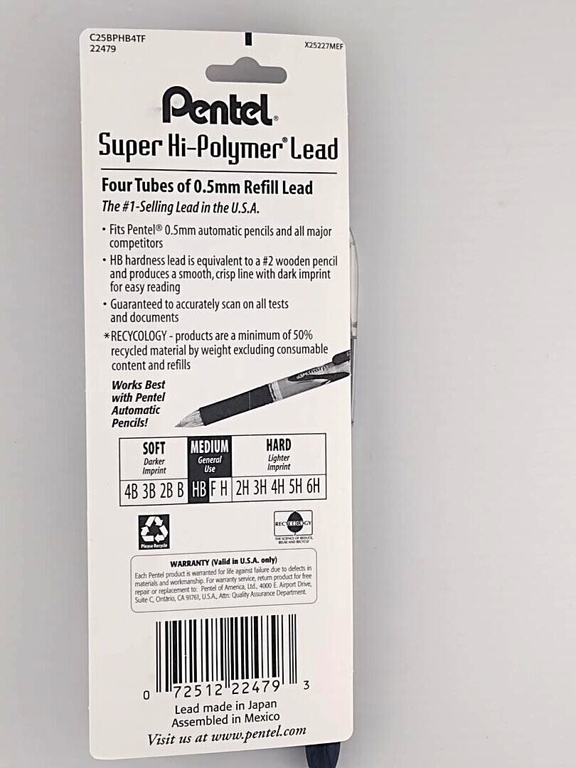 Powered by Frooition About us Shipping Returns Contact us Payment FAQs All Items See our eBay store for more great items >> Shop Categories Mobile Tech Other Fashion & Beauty Video Games Home Tech Laptop Parts Deals of the Week No Promotion Garbage Pail Kids Helpful Links Add to Favorite Sellers Sign up to Newsletter View Feedback Contact Seller Visit seller's eBay Shop About Seller Page 120-PCS NEW Pentel Super Hi-Polymer .5mm HB Lead Pencil Refills Black + Red Tube Item Description You will receive the following (if it's not listed directly below, it's not included): 4 x 30-pc Refill Tubes (C25-HB, 120 pcs total) 1 x Bonus 12-pc Red Refill Tube (PPR-5) Retail Packaging Overview : Pentel Super Hi-Polymer HB lead is equivalent to a #2 pencil, guaranteed to scan on tests, resists breaking and never needs sharpening Each tube of Pentel Super Hi-Polymer HB lead is made of 100% recycled plastic and part of the Pentel Recycology line of products 0.5mm lead produces crisp, fine lines of consistent density Ideal for all general writing applications such as notes, letters, etc Fits all 0.5mm mechanical pencils Warranty Warranty Payment Shipping Returns About Us & Contact Warranty We offer a 30-day warranty on nearly all of our items, money back or exchange (if stock allows). Payment Payment All transactions should be paid for through eBay using PayPal as it is our preferred method of receiving payment. You may checkout with any major credit card through PayPal if you do not have a PayPal account. For local pick-ups, we accept cash or card. MN sales tax does apply. Shipping Shipping We offer FREE SHIPPING on most items. In the event shipping is not listed as free, you may calculate your shipping by clicking the "Shipping and Payments" tab above the item description on the product listing page. Then, select your country from the drop-down box, enter in your zip code (if applicable) and click "Get Rates". Shipping is done from Minneapolis, MN, USA. All items are warehoused in MN and ship within one business day after your order. If you order late on a Friday or any time on Saturday or Sunday, your item(s) will not ship until the next business day, which is Monday. During the holiday season, we do ship most weekends. All items are shipped with tracking. Tracking is uploaded automatically within 1 business day to your order details on eBay for you to view. Please allow 24 hours for your tracking information to update and show movement/scans. Returns Returns If you have an issue, please contact us through eBay first before leaving feedback. Your satisfaction is our #1 goal! If there is a problem with the product, you must contact us within 30 days of arrival so that we may resolve the issue within your warranty period. Our support team is solely email-based and they respond to each email within 1 business day. We do carry multiple items in stock for most of our products and will first attempt to replace the item before providing a refund. There is a 15% restocking fee for any non-defective returns. Return shipment cost is the responsibility of the buyer. We do have the ability to cover return shipping in some instances (at the discretion of our support team) if you're able to print a label. We do not have means to reimburse already-purchased postage or cover return shipping in any other manner. About Us & Contact About Us & Contact Loot Hive is a small business in Minnesota that employs 30 awesome people. They work very hard to get quality products to you quickly. They take pride in their ability to add new items daily to our store and provide extremely fast shipping. To contact us, please click on "ask a question" at the bottom of any of our product listings or simply click "contact us" on our store banner (you may be asked to sign in again). Powered by Frooition Frooition | No-js Template | eBay design, eBay store design, eBay shop design, eBay template design, eBay listing design (ver:froo_no_js) This listing is currently undergoing maintenance, we apologise for any inconvenience caused.