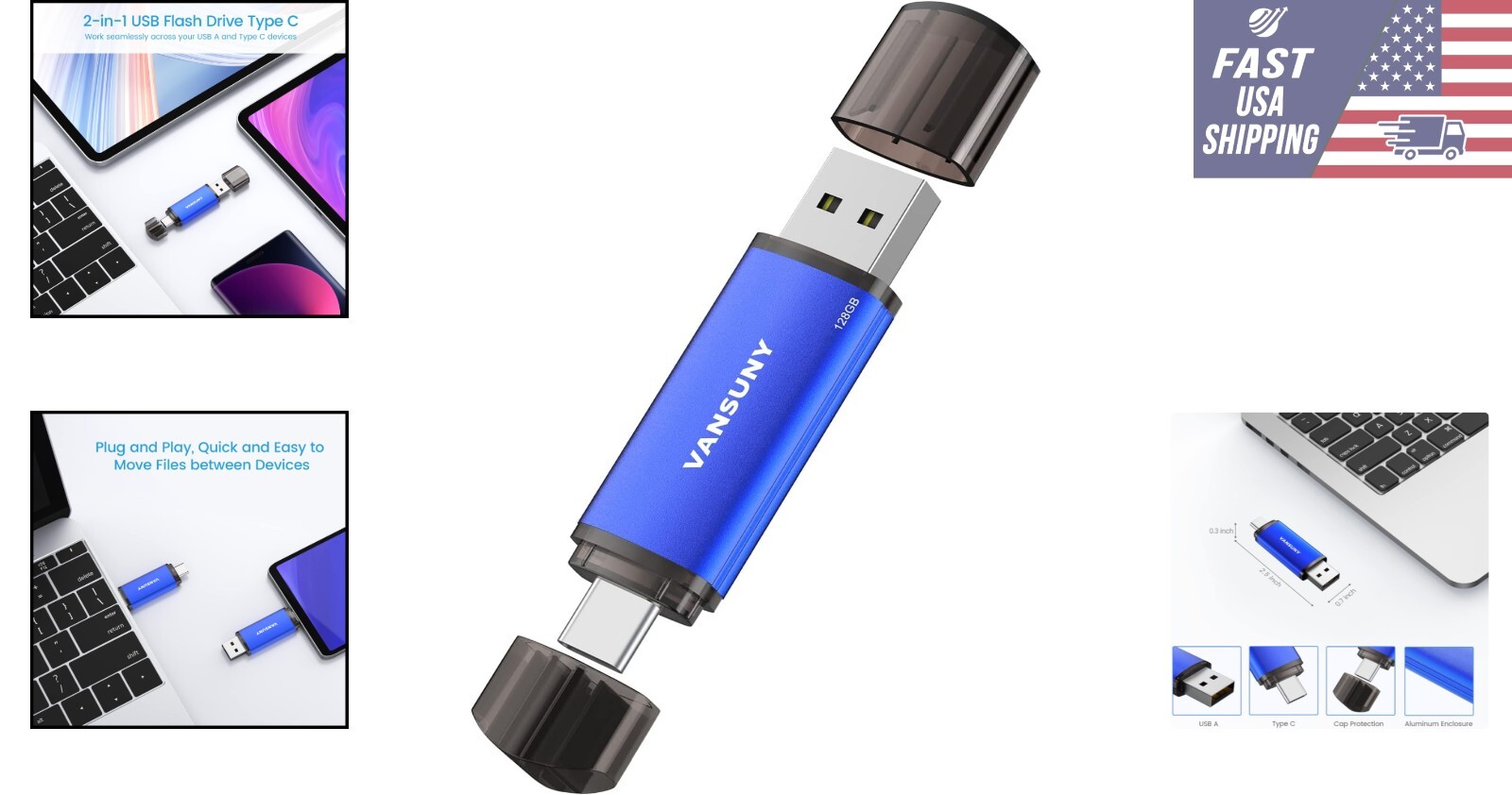128GB Dual USB Flash Drive - Lightning Fast, Sleek Design for Easy Use ‹ › ‹ › ‹ › ‹ › ‹ › ‹ › ‹ › ‹ › ‹ › 128GB Dual USB Flash Drive Lightning Fast, Sleek Design for Easy Use Exceptional Features: 2 in 1 Dual Drive: This dual USB C flash drive features a USB A plug at one end and a USB C plug at the other, allowing seamless movement of files between your USB A device and Type-C Android smartphone, tablet, laptop, MacBook, and more! Plug and Play: Simply insert this Type-C flash drive into your device and experience instant extra space to store more pictures, movies, music, files, and games. Capture all your adventures without the worry of running out of space. Wide Compatibility: This thumb drive works effortlessly with Windows, Android, Linux, and Mac OS, making it the perfect solution for enhancing storage across a variety of devices, including computers, laptops, MacBook, iPad Pro, and OTG-enabled Android gadgets. Reliable & Durable: The sleek metal pen drive is designed to withstand the rigors of daily life — shock and drop resistant, as well as resistant to dust and splashes. With excellent heat dissipation, your crucial data is always protected. The cap design shields connectors from potential damage when not in use. What You Receive: 1 x 128GB Dual USB Flash Drive Why Choose Our Dual USB Flash Drive? When it comes to safeguarding and expanding your digital storage, nothing compares to our 128GB Dual USB Flash Drive. With its dual USB A and USB C functionality, instant plug-and-play capability, and sturdy, sleek design, possessing the perfect blend of performance and style has never been easier. Don’t let storage limitations hinder your creativity and productivity! Embrace the freedom of enhanced storage and effortless data transfers. Order your 128GB Dual USB Flash Drive today and unlock endless possibilities! Shipping Free & Fast Shipping - We offer free shipping to most of the USA with a normal delivery time of 3-7 days. However, due to the current situation, additional delivery time (up to 3 weeks) may be required for some items. Alternative Carriers - We may use alternative carriers (e.g. USPS, FedEx, UPS, etc.) to ensure your package arrives safely and on time. Due to the use of multiple carriers, we are unable to provide a tracking number automatically. Handling Time - Orders are processed and shipped within 1-2 business days of receiving cleared payment. Shipping Restrictions - Shipping to Alaska, Hawaii, Puerto Rico, Guam, and other US territories may incur shipping charges or delivery restrictions. Please contact us before ordering, or your order can be refunded/cancelled. State Restrictions - There may be restrictions based on your state of purchase. For example, certain items may not be shipped to California due to state regulations. Contact for Tracking Updates - If you require tracking updates or have any concerns about the delivery of your order, please feel free to contact us, and we will be happy to assist you. Return 30-Day Hassle-Free Returns - We want you to be completely satisfied with your purchase. If you are not, you can return the item within 30 days of receiving it for a full refund or exchange. Easy Return Process - To start a return, simply contact us and we will provide you with a prepaid return shipping label and detailed instructions. Restocking Fee - There are no restocking fees for returns. However, the buyer is responsible for return shipping costs if the return is not due to a seller's error. Refund Processing Time - Refunds will be processed within 5 business days of receiving the returned item in its condition. Payment We accept all major credit cards, PayPal, and Apple Pay for your convenience. Your payment information is secure and encrypted to ensure a safe and seamless transaction. Please complete your payment within 3 days of purchase to avoid any delays in shipping. Feedback Your feedback is extremely important to us. We strive to provide the best products and customer service possible. If you are satisfied with your purchase, please take a moment to leave us a positive review. If you have any concerns or issues with your order, please contact us before leaving negative feedback. We are committed to resolving any problems and ensuring your satisfaction. Contact Us If you have any questions or concerns, please feel free to out to our customer support team. You can contact us through the eBay messaging system. We are available Monday to Friday, 9:00 am to 5:00 pm EST, and we will do our best to respond to your inquiry within 24 hours. Buy it now and enjoy a pleasant shopping experience! Model: USB Flash Drive 128GB Unit Quantity: 128 GB Item Height: USB Flash Drive 128GB Item Length: USB Flash Drive 128GB Interface: USB-C,USB A Compatible With: Android,Laptop,Mac,PC,Tablet Features: Shock Resistant,Water Resistant,Plug and Play,Dual USB,Heat Dissipation Writable Format: USB Type: USB Flash Drive Color: Blue Write Speed: 5 MB/s Unit Type: oz Storage Capacity: 128 GB USB Specification: USB 2.0 Read Speed: 5 MB/s Transfer Rate: None Storage Format: HDD & SSD