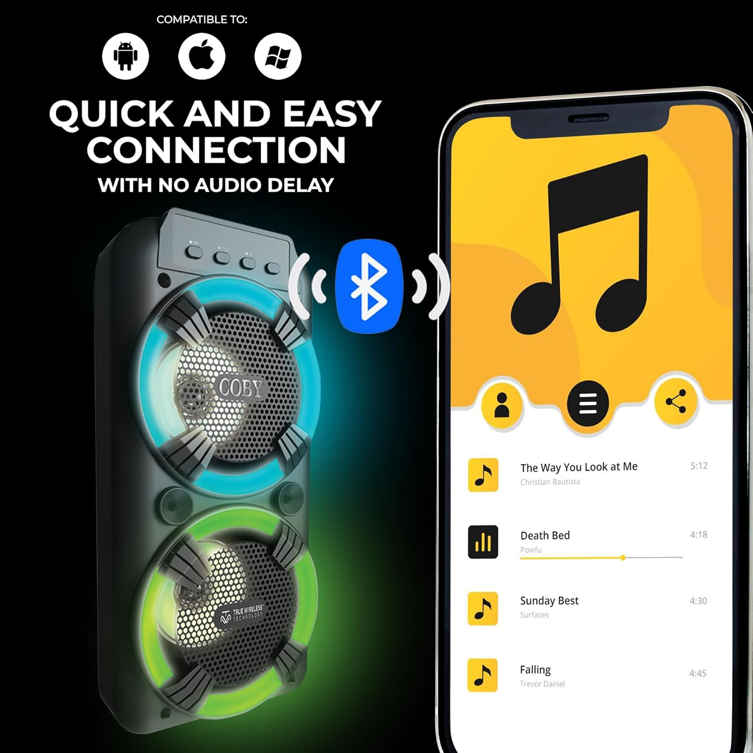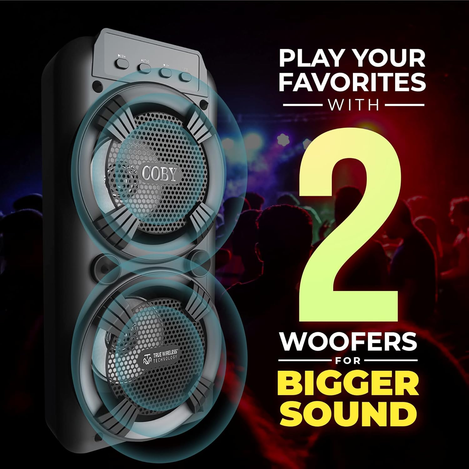 Wireless Bluetooth & Karaoke Speaker: Energize your parties and events with the Coby Karaoke & Bluetooth Speaker. Our high-def audio speaker features quick and easy Bluetooth connection to your devices, an FM Radio, TF Card input, 3.5mm aux input, and a dedicated karaoke mic input. Karaoke Microphone Included: Our speaker comes with a Coby karaoke mic, great for turning your parties into interactive and fun sing-along events. USB Rechargeable Battery, 12-Hour Playback: The speaker boasts a rechargeable battery and comes with a charging cable, perfect for taking with you to events and parties. The speaker also features 12 hours of battery life, great for long events and everyday use. Carrying Handle & LED Lights: Take the Coby Karaoke Wireless Party Speaker on the go. The speaker features a convenient handle at the top of the unit, making transporting easy and hassle-free. The two woofers feature LED lighting trim, showcasing a mesmerizing array of colors that’s dynamic with the music being played. High-Def Audio, Loud Sound: Enjoy an array of frequencies with our high-def audio drivers, delivering great bass and clear sound on the mid and high range. Coby Karaoke True Wireless Party Speaker, Karaoke Mic | Rechargeable Portable Speaker, Multicolor LED Lights, USB, FM Radio, TF Card, 3.5mm AUX | Carry Handle, Microphone, 12-HR Play