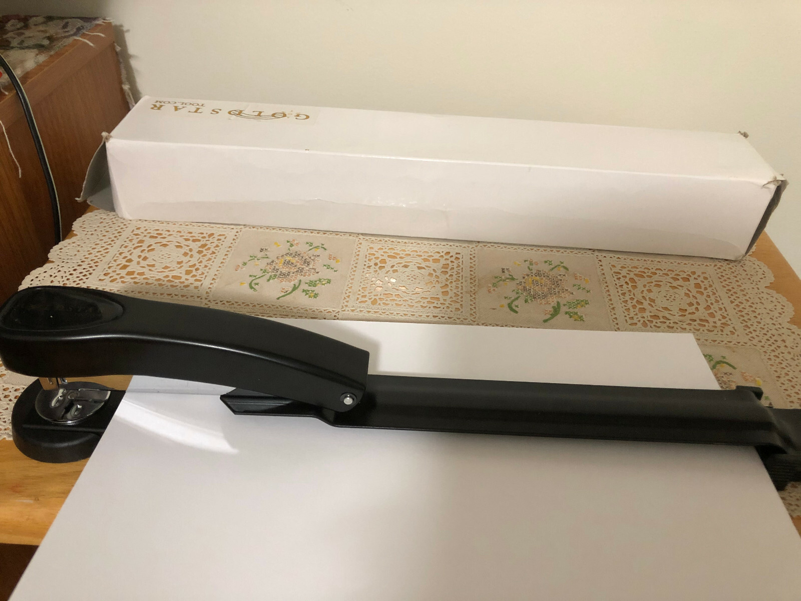 Long Reach Stapler 12" Throat, 16" long. It can be used to bend inward or outward. This long reach stapler exceeds the reach of common desktop staplers; adjustable paper stop with English/metric rulers It was used only one time to staple the religious praying books for the Temple, and then it was kept in the office cabinet until now. It is still like new. It was used only one time to staple some religious praying books for the Temple, then it was kept in the cabinet. Contact me if having any questions, I do not accept the returns for any reasons NO RETURN.