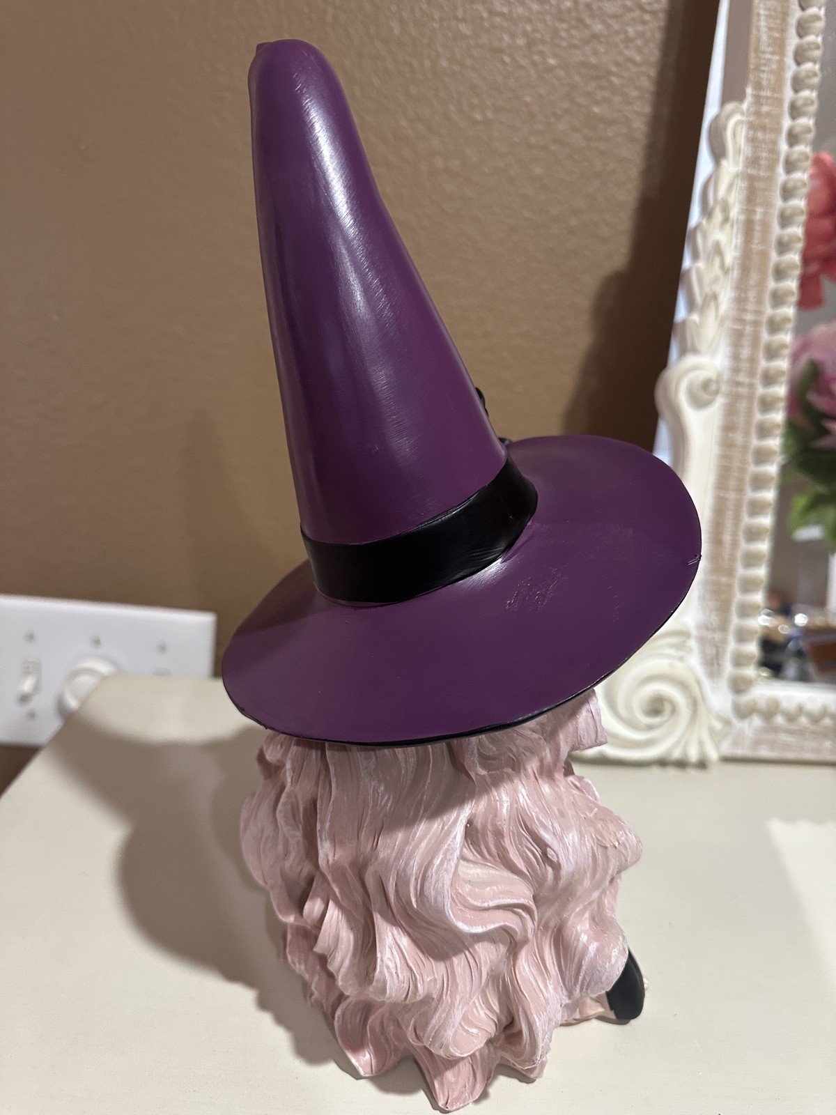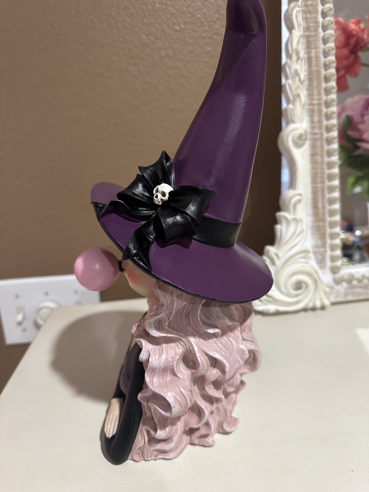 The whimsical 12” witch figurine is a unique and fun addition to Halloween decor. Complete with a skull and bow, this witch is blowing bubble gum, adding a playful touch to the spooky season. The detailed sculpture is perfect for bringing a touch of whimsy and charm to your Halloween decorations, making it a standout piece in your festive display.