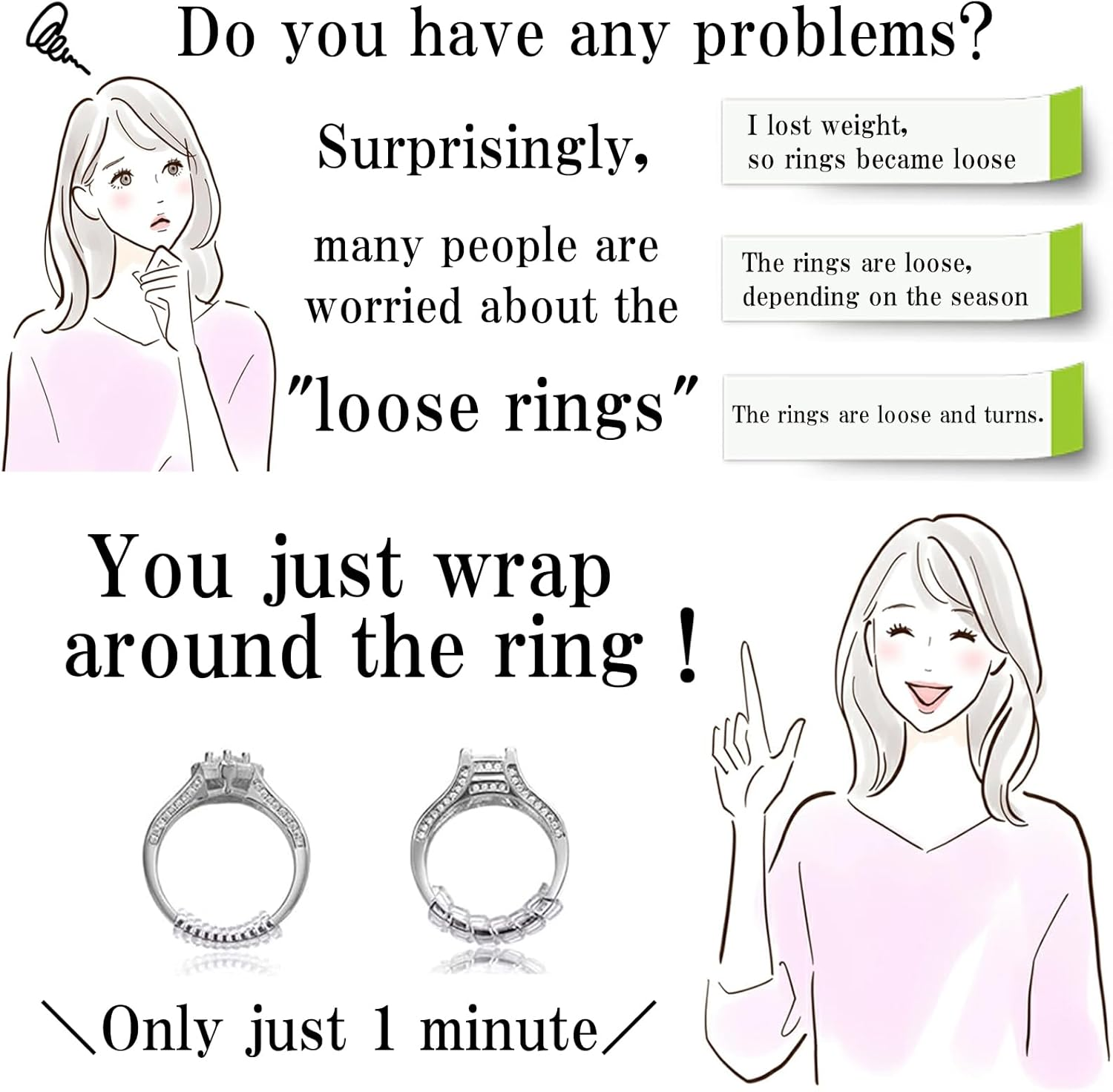 Store New Arrivals Add to Favorite View Feedback Contact Ring Size Adjuster 12 Pack 4 Sizes Invisible Silicone Ring Guard Resizer Description Item model number RSA-01 Color Transparent Brand Moivi Material PVC Country of Origin Japan Item Weight 5 Grams Number of Pieces 12 Finish Type Unfinished Product Dimensions 0.37 x 0.2 x 0.2 inches Manufacturer Moivi 〇The Best Way to Your Ring Fit:It takes a lot of time, effort and money to resize your ring, because the craftsmen manually adjust the size. But this ring adjuster is low cost, spiral design provides a long-lasting and comfortably fit for most rings, great item make your ring fit without having to re-size. And it’s not only does it make your ring fit, but it also will protect your rings from scratched while working or doing housework. 〇Comfortable and Soft Material:This ring adjuster is made of high quality elasticity silicone material, for soft to touch and friendly to your skin, and comfortable to wear, for durability good, The unique design of ring sizer makes it virtually invisible, because wearing it to the ring on the palm side, it becomes inconspicuous. The transparent silicone spiral stays well on rings and feel nothing on your finger. 〇Convenient To Use: Very easy to use! Just wrap it around the ring and cut it! This ring adjuster makes it convenient to solve many ring problems, you can firmly fix the ring on your finger without worrying about losing your precious ring caused by weight loss and other reasons. And this ring sizer can be easily wiped off to remove dirt, oil, and dust for daily maintenance and care. 〇Totaly 4 Size For Your Choice: This ring size adjuster tightener fitter is suitable for most ring size, meet your different needs. It's 2mm round, 5mm round, 3mm flat, 5mm flat, 2 styles (round and flat), different thickness, each piece is 10cm length, each size comes in 3 pcs with total 12 Pack together. 〇Notice:*If the cut cross section becomes sharp and hurts, or if it gets caught on clothes, prepare a separate nail file, etc., and sharpen the cross section slightly before attaching it. *Keep out of reach of small children. Also, the cut ring adjuster may be accidentally swallowed by small children, so please handle it with care. *Do not leave or store for a long time in direct sunlight or in a hot and humid place, as it may cause deformation or discoloration. Product Description Moivi Ring Size Adjuster Easy to Use ABOUT US We offer the best prices around on high quality products. Our E-store includes media such as books, movies, music and games while offering electronics, toys, sporting apparel, clothing, tools, general home, garden items and more. SHIPPING We are always working hard to ensure your package arrives as soon as possible. Please understand that some factors like weather, high postal traffic, and the performance of shipping companies are outside of our control. We offer free shipping to the lower 48 states and ship within 2 business days of payment, usually sooner. We do not accept P.O. Boxes. Please provide a physical address. RETURNS We offer a 30-Day Return Policy on items which you are not completely satisfied with. You have the option for a full-refund or an exchange of the item. No returns are available on items shipped outside of the USA. PAYMENT We accept PayPal. CONTACT US This page content is yet to come Please ad us to your favorite seller and visit again later Thank You CUSTOMER SATISFACTION We try our very best to make sure every customer is completely satisfied. If there's a problem, message us! We're happy to help.