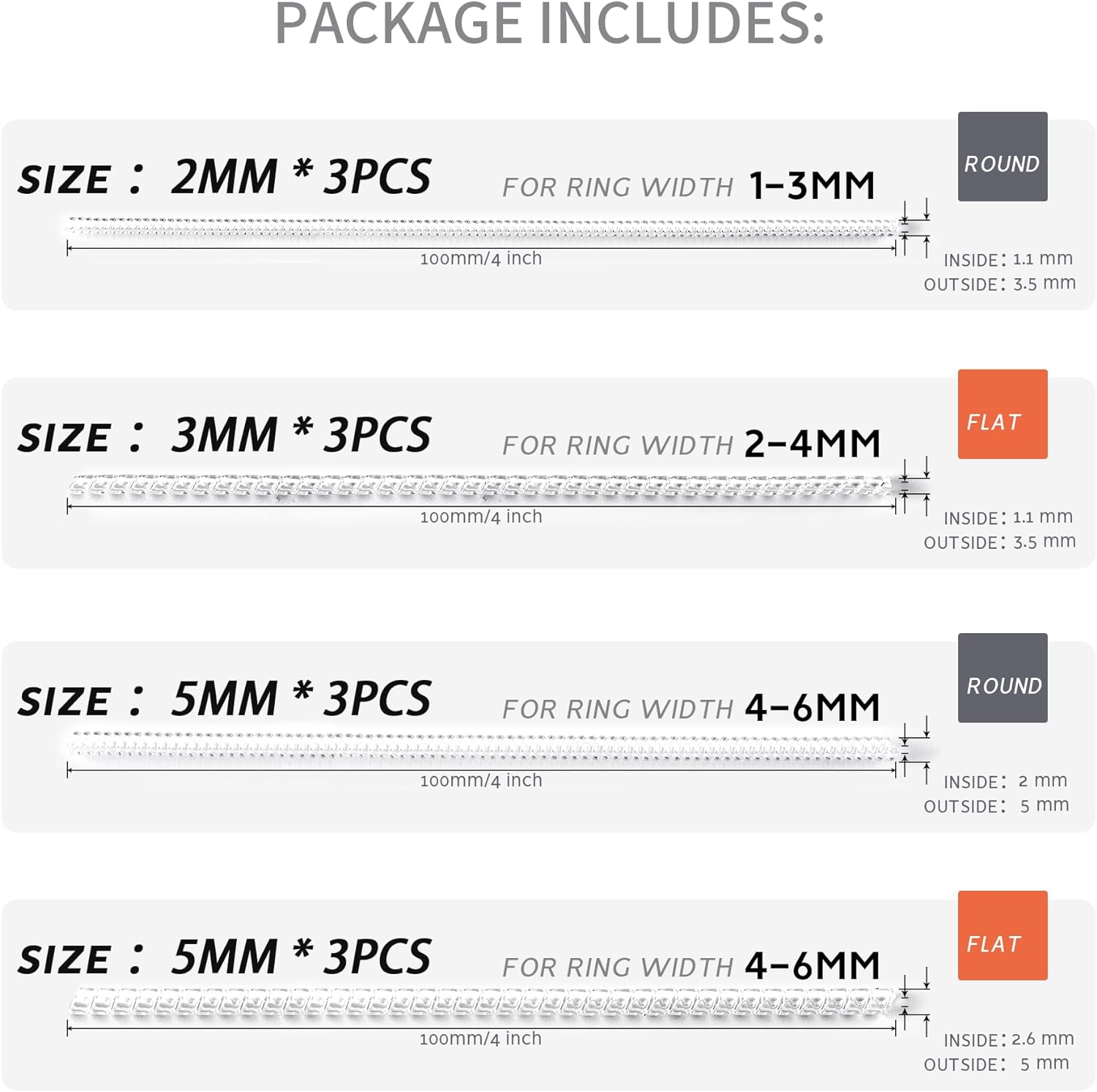Store New Arrivals Add to Favorite View Feedback Ring Size Adjuster for Loose Rings,12 Pack-4 Sizes Invisible Transparent Silicone Guards Clip Jewelry Fitter Resizer,Fit Almost Any Ring for Women and Men Description Item model number RSA-PL-S12 Number of Pieces 12 Color Clear Material Silicone Item Weight 0.03 Kilograms Finish Type Unfinished Product Dimensions 4.33 x 1.97 x 0.51 inches Size 12 Pack-4 Sizes ⭐Soft and Comfortable Material:The ring adjuster is made of high quality elasticity silicone material for durability,soft to touch and friendly to your skin, comfortable to wear, and invisible on your finger. ⭐4 Size For Your Choice: 2mm round, 5mm round, 3mm flat, 5mm flat, 2 styles (round and flat),different thickness,each piece is 10cm length,each size comes in 3 pcs with total 12 Pack together,This ring size adjuster tightener fitter is suitable for most ring size.Meet your different needs. ⭐Convenient To Use: The ring adjuster makes it convenient to solve many ring problems,you can firmly fix the ring on your finger without worrying about losing your precious ring caused by weight loss and other reasons,and the ring sizer can be easily wiped off to remove dirt, oil, and dust for daily maintenance and care. ⭐Virtually Invisible:The unique design of ring sizer makes it virtually invisible when on rings,the transparent silicone spiral stays well on rings and feel nothing on your finger. ⭐Quick Solution For Loose Ring:The spiral design provides a long-lasting and comfortably fit for most rings,great way make your ring fit without having to re-size.It’s not only a simple ring tightener,but also will protect your rings from getting scratched while working or doing housework. Product Description PACKAGE INCLUDED 3 Pcs*2mm round ring size adjuster 3 Pcs*5mm round ring size adjuster 3 Pcs*3mm flat ring size adjuster 3 Pcs *5mm flat ring size adjuster(12 Pack in Total) 1 Pcs x Ring Adjuster Storage Case INVISIBLE RING SIZE ADJUSTER SET 4 Sizes Fit Almost Any Ring 12 Pack Ring Size Adjuster Set with soft silicone material that will not create any discomfort on your skin,virtually invisible and it's not obvious on your ring unless you really look for it. Material: silicone, soft & Comfortable Color:Transparent 2mm thin round for ring width 1-3mm 5mm thick round for ring width 2-4mm 3mm thin flat for ring width 4-6mm 5mm thick flat for ring width 4-6mm Length: 10cm/4 inch SOFT AND COMFORTABLE The ring adjuster is made of high quality elasticity silicone material for durability,soft to touch and friendly to your skin, comfortable to wear,and invisible on your finger. 4 SIZE FOR YOUR CHOICE 2mm round, 5mm round, 3mm flat, 5mm flat, 2 styles (round and flat),different thickness,each piece is 10cm length,each size comes in 3 pcs with total 12 Pack together OUICK SOLUTION FOR LOOSE RING 1.Lose weight and the finger turns thin,the ring turns oversize. 2.The fingers are thinner than the knuckles. 3.There is no suitable ring fits the finger. HOW TO USE IT STEP 1 Choose the suitable ring sizer and a pair of scissors. STEP 2 Wrap one end of the ring size adjuster on the ring band,gently twist the adjuster around the ring. STEP 3 Put on the ring and make sure ring fits comfortably and then cut off the excess adjuster. STEP 4 Perfectly reduce ring size and cannot be seen! ABOUT US We offer the best prices around on high quality products. Our E-store includes media such as books, movies, music and games while offering electronics, toys, sporting apparel, clothing, tools, general home, garden items and more. SHIPPING We are always working hard to ensure your package arrives as soon as possible. Please understand that some factors like weather, high postal traffic, and the performance of shipping companies are outside of our control. We offer free shipping to the lower 48 states and ship within 2 business days of payment, usually sooner. We do not accept P.O. Boxes. Please provide a physical address. RETURNS We offer a 30-Day Return Policy on items which you are not completely satisfied with. You have the option for a full-refund or an exchange of the item. No returns are available on items shipped outside of the USA. PAYMENT We accept PayPal. CONTACT US This page content is yet to come Please ad us to your favorite seller and visit again later Thank You