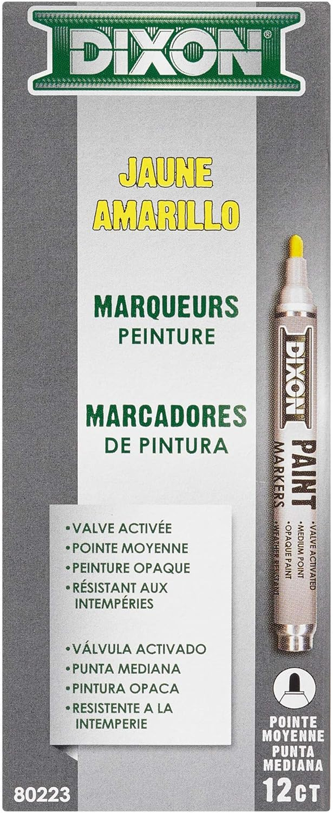 Menu Other Items Feedbacks About Us Contact Us Add To Favorites Paint Markers, Medium Tip, Box of 12, Yellow (80223) Permanent, opaque color Work on most surfaces Oil based formula maintains color regardless of application surface Waterproof Light and weather resistant With a rich heritage, and origins dating back to 1795, the Dixon Ticonderoga Company throughout history has made its mark through quality, integrity, respect and perseverance. Today Dixon Ticonderoga continues to make its mark manufacturing and marketing writing instruments, art supplies and tools for self expression. Dixon Paint Markers produce permanent, opaque colors on most surfaces including metal, wood, glass, stone, plastic, leather, vinyl, textiles, ceramics, cement, paper and rubber. These oil-based markers maintain color intensity regardless of the surface to which they are applied. The durable color is lightfast, waterproof and weatherproof. The special valve-action tip prevents dry-out. Dixon Paint Markers feature a sturdy metal barrel and are made in U.S.A. More than a writing and art products company, Dixon Ticonderoga empowers people to take conscious and subliminal thoughts, facts, ideas and dreams, and preserve them using tools that are simply extensions of themselves. Item Specification Item model number - X80223 Ink Color Yellow Number of Items 1 Color Yellow Line Size 0.7mm Manufacturer Part Number - X80223 Item Weight 8 ounces Pattern Name Solid Recommended Uses For Product Glass,Light,Stone,Wood Size 12 Count (Pack of 1) Point Type Medium Product Dimensions 6 x 1.5 x 4.25 inches Dimensions Shipping Returns Additional Info Product Dimensions: 1.5 inches x 6.0 inches x 4.25 inches. Weight: 8.0 oz Fast shipping is very important for us. Our standard shipping service is FREE. Your order will be shipped within 1-3 business days upon full payment received. Most items are delivered within 3-5 business days, however, please allow 3-10 business days. We are shipping only to USA. We only ship to the confirmed Paypal address. We reserve the right to cancel any order for any reason at any time. We are not responsible for undeliverable addresses. We offer a 30 day return policy from checkout winning date. Your satisfaction is guaranteed! If for any reason you are unhappy with your item, just return it within 30 days for a full refund, minus shipping cost. Please contact us prior to initiating a return so that we can issue you a refund authorization. Items defective upon receipt must be packaged in their retail packaging as if new and returned with a detailed description of the problem. Return shipping fees are not refundable. We reserve the right to decline any returns if the above guidelines are not followed. All of our items, unless otherwise stated, will only run on 120 volts. Please check to make sure your country complies with these specifications. If you have a problem or question regarding your transaction please contact us before leaving any type of feedback. We will work with you to resolve any problem you may have.