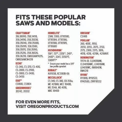 The Oregon S62 is designed to fit all chainsaw brands, with models that require a 3/8 Inch pitch, .050 Inch (1.3 mm) gauge, with 62 drive links. Fits chainsaw models from several brands including Husqvarna, Echo, Poulan, Craftsman and more Product Details Durable, low-kickback, low-vibration chain helps reduce user fatigue for increased periods of work- For all chainsaws brands that run 3/8 Inch Pitch, .050 Inch (1.3 mm) gauge, 68 drive links Fits these chainsaw models: Husqvarna 136, 137, 235E, 240, Echo CS-370, CS-400, CS-2800, CS-2900, Poulan 2150, 3816, Homelite 23AV, 3300, UT10586, UT10588 and other similar models Precision, heat-treated semi-chisel chain cuts smoothly with a higher tolerance for debris Built-in Lubri-Tec automatic oiling system extends the life of your chain by delivering oil to key parts of the chain so you can work smarter with less downtime and maintenance Tough, long-lasting chrome outer layer and hardened rivets help reduce wear and allow for fewer chain adjustments For saw sizes up to 42 cc This saw chain met the kickback performance requirement of ANSI B175.1-2012 when tested according to the provisions of ANSI B175.1-2012. Low-kickback