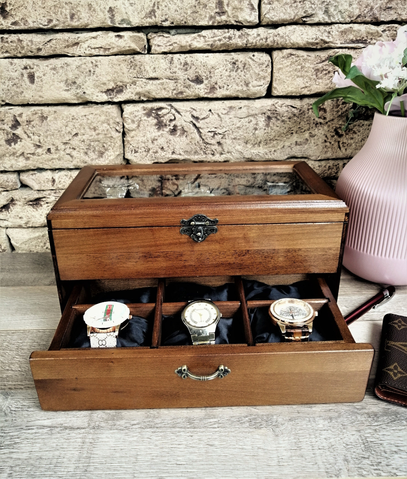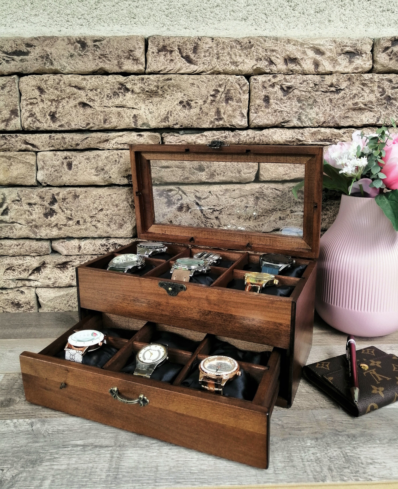 All watches deserve to be stored in the best possible way. You can store them in their original boxes and packaging or in leather rolls, but it is not practical. Instead, try one of my boxes to organize your precious watches. They are 100% handmade from solid wood and with an elegant design. The watch box has a glass window to keep dust-free. Holds 12 watches and is on two levels. The upper part holds 6 large clocks up to 54 mm, and the drawer 6 smaller ones up to 38 mm. Now you will not worry about your expensive pieces, because they will be in a safe place. This box is not only necessary for watch lovers, but it will also be beautiful furniture in your home. The perfect gift for a loved one, husband, friend, dad's gift, or a stylish business gift. For 7 years VOLDOR 69 has been producing some of the most beautiful watch boxes on the market. Please allow me to make a beautiful box for you. To make the right choice, visit my store and see boxes with 3, 4, 6, 8, 12 slots and unique design Lichtenberg fractal burned. Box dimensions: *Width: 12 inches (30cm) *Depth 7 inches (18cm) *Height 8 inches (20cm) *Material : linden wood * Capacity: 12 pcs watch This item ships 3 to 5 business days after purchase. Orders are shipped by USPS, shipping included with tracking number. It takes 12 to 15 working days after the day of dispatch for shipments to arrive in European Union countries.