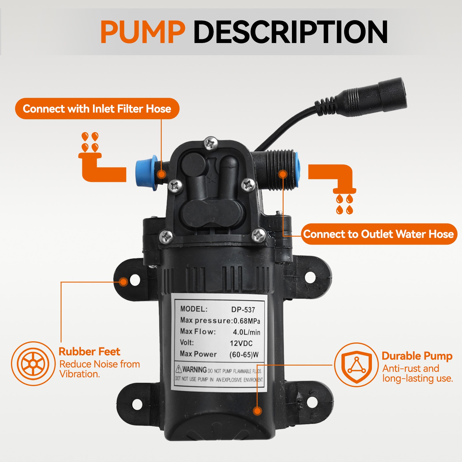 Description 12V 130PSI Washdown Wash Pump Kit Electric DIY Car Washer Cleaner Sprayer Tool Feature: 【High Pressure Washer】Car high pressure washer 12V water pump car washer, using high-quality micro self-priming pump and high-efficiency DC motor, the pump is a low-power and energy-saving product. 80W 130PSI, High Pressure Wash Kit for Car, Garden, Home, Cleaning, Pet Shower. 【Portable and Compact】The water pipe can be easily connected with the water gun and water pump, and the water gun is comfortable and convenient to hold. Lightweight and compact small design makes it easier to use and clean quickly indoors or outdoors or anywhere. 【Adjustable Spray Modes】A total of 3 spray modes of straight line, dispersion and water spray are available for you to choose. Just rotate the spray gun nozzle to meet your different applications. There is always a way that works for you. 【Safety 12V Water Pump】The car washer Kit with DV 12V safety voltage is safe for adults, children and pets. Comes with over-current protection function car cigarette lighter adapter, built-in fuse protection, which can prolong the life. 【Daily Multipurpose】Are you looking for a multifunctional cleaning Power Washer suitable for household projects? This pressure washer is best for you! In addition to washing the car, the portable pressure washer is also suitable for watering flowers, washing the bathroom, cleaning windows, cleaning floors, cleaning air conditioners, and cleaning windows. Specification: Voltage: DC 12V Power: 80W Power Source:Car Cigarette Lighter Max Pressure:130PSI (1.1MPA) Flow: 5.5L/min PVC Pipe (Water in)length: 1.0 m(39.37inch) Pressure pipe(Water Out) length: 6.0 m(236.22inch) Car cigarette charger line length: 3.0 m(118.11nch) Instruction: 1. The first gun or brush is connected with a water pipe, the water inlet pipe into the bucket, the cigarette lighter plug into the car cigarette lighter socket, wire pull out close the door, if there is a switch on the power supply check Water Leakage place, everything is ready, according to the center on both sides from the top to the bottom of the law, start cleaning from the roof 2. Wash the dirty dirt on the car and the surface of car body with water gun. Wash it with brush after washing 3. After washing, the washing liquid sprayed on the surface of the paint, while the spraying with semi wet towel to wipe the body suede washed part. 4. Such as drying the body, and then polished with cotton towel, you can be bright as new. Matters needing attention In winter, in order to prevent and storage water ice, take out the water pipe and then spray for a period of time, emptying the water until. Attention: 1.It is forbidden to wash the machine into the water (to avoid damaging the electrical components) 2.The pump is not waterproof, please put it away from water. 3.The car washer should be placed in the dry place. Packaged included: PVC Pipe with Connector (Water Out) x 1 High Presure Water Gun x 1 Pipe with Water In Filter x 1 Water Pump x 1 Car Cigarette Charger line x 1