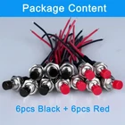 Product Name : Mini Push Button Switch; Operation Type : Momentary; Contact Type : 1 NO (Normally Open) Poles: SPST; Rating : 3A 125V / 1A 250V; Terminals : 2 Pins Button Diameter: 6.9mm / 0.27"; Cap Dia. : 6mm / 0.24"; Hole Diameter: 7mm/0.28" Pre-wired design:Easy to install, and saves unnecessary cost; Wire length: 10cm/4" Package Content: 6*Black + 6* Red Button Switch with Cable