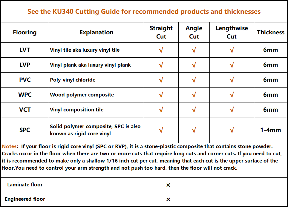 ใ๐๐๐๐๐ถ๐ป๐ด ๐ ๐๐น๐๐ถ๐ฝ๐น๐ฒ ๐ ๐ฎ๐๐ฒ๐ฟ๐ถ๐ฎ๐น๐ใ This Guillotine-style Vinyl Floor Cutter can cut Vinyl Plank and LVT, LVP, SPC, PVC, VCT, WPC. Floor cutting up to 13โwide and 6mm thick . This must-have, highly efficient construction tool eliminates the need for a noisy power saw and works great on vinyl plank flooring ใ๐ฆ๐๐๐ฟ๐ฑ๐ ๐๐ผ๐ป๐๐๐ฟ๐๐ฐ๐๐ถ๐ผ๐ป ๐ฎ๐ป๐ฑ ๐ฆ๐ต๐ฎ๐ฟ๐ฝ ๐๐น๐ฎ๐ฑ๐ฒใ High-Quality Steel And Aluminum Construction make the vinyl floor cutter strong and durable. And It comes with a razor-sharp blade, which can be re-sharpened as well as replaced to prolong the life of this durable tool. And provides an easy and clean-edge cutting on floor planks ใ๐ ๐ฒ๐ฒ๐ ๐ฎ ๐ฉ๐ฎ๐ฟ๐ถ๐ฒ๐๐ ๐ผ๐ณ ๐๐๐๐๐ถ๐ป๐ด ๐ก๐ฒ๐ฒ๐ฑ๐ใ This is a professional 13โVinyl Flooring Cutter designed to make Straight, Lengthwise and 0-45ยฐAngle cuts on all vinyl-based flooring. When Lengthwise Cutting, the unique aluminum ruler design makes the vinyl floor stable and precise when cutting ใ๐๐ฑ๐ท๐๐๐๐ฎ๐ฏ๐น๐ฒ ๐๐๐๐๐ถ๐ป๐ด ๐๐น๐ฎ๐ฑ๐ฒ ๐๐ฒ๐ถ๐ด๐ต๐ใ KU340 has two knobs on the machine head to adjust the blade height. When Lengthwise cutting, you need to adjust the knob, if you cut from the right, so that the right knob goes down, then the right blade will go down. The blades are not on the same level, making cutting easier. When straight cutting and Angle cutting, it is necessary to adjust the two knobs and then bring the blade down to the bottom, the blade is on the same level, and then cut. You adjust the knob according to your needs, trying several times to make the cutting easy ใ๐๐ฎ๐ฏ๐ผ๐ฟ-๐๐ฎ๐๐ถ๐ป๐ด ๐๐ฎ๐ป๐ฑ๐น๐ฒ ๐ฎ๐ป๐ฑ ๐ฆ๐ฎ๐ณ๐ฒ ๐๐ผ ๐จ๐๐ฒใ Thickened handle, not easy to bend. There is also a safety lock to prevent the blade from moving when not in use. Floor cutter with wheels you can move it easily. These outstanding features make it the perfect vinyl floor cutter for DIY home improvement and repair projects as well as professional floor installation jobs. ใTechnical Detailsใ Material๏ผโAluminum, Steel, ABS Max Cut Width: 13โ (340 mm) Max Cut Thickness: 6 mm Max 45ยฐ Angle Cut Width: 8.2โ (210 mm) Item Weight: 18.8lbs Cutting Angle: Lengthwise, Straight, Angle Laminate Flooring๏ผNO Vinyl Flooring๏ผYes Yes Solid Wood Flooring๏ผNO CONDITION: USED Slight signs of use, but will not prevent you from using it again.