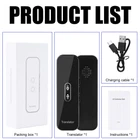 Product Description Function: 1、 Support more than 100 languages to translate each other, multi-country accent translation to understand, in order to translate accurate easy to travel to more than 200 countries and regions around the world. 2、 KUDA Xunfei + Nuance speech recognition engine, combined with Microsoft + Google proprietary neural network matrix translation technology and multinational servers, translation response speed is faster, translation semantic accuracy is higher. 3、 Real-time display, audio and text synchronization, clear at a glance. The interaction is more humanized and the user experience is stronger. 4、 350 mAh high-performance lithium battery, more capacity, less trouble, precision protection of the motherboard is safe and reliable. 5、 Aluminum alloy + tempered glass technology and fine processing technology, sturdy and durable, more high-end atmosphere. 6、 Ergonomic design, mini compact and portable, business design; 7、 Targeted in-depth optimization for multiple language application scenarios such as traffic and travel, tourism and shopping, and learning and communication; timely updating and translation of current new words, which is more suitable for the usage scenarios. 8、 Support APP upgrading and updating, product functions, interactive interface continuous iteration, convenient, fast and efficient. Parameters: Detailed: need to use with APP, scan code to download APP Connection: Bluetooth Body material: aluminum alloy + tempered glass Body color: black Package size: 132*62*30mm Product size: 115*35*9mm Net weight: 130g Battery type: lithium polymer Battery capacity: 350mAh Battery standby: more than 15 days Working hours: about 4-6 hours Processor: Jelly MIC : Microphone Speaker : Specialized Speaker Interface: Type-C Charging adapter: 5V/1A about 2-3 hours Voice Translation: 137 Translation playback: Yes Input Translation: Yes APP Upgrade : Yes Packing List: Charging cable*1 Instruction manual *1 Translation host *1 Terms Shipping Returns Chontact US Feebback For any issues with Defects , Return , Item Exchange request , please contact us first and send us a message first before opening any type of case or request. We devote ourselves making EVERY CUSTOMER in 100% Satisfactory and resolve any problem. We highly value and appreciate your business. Thank you. No returns will be accepted without an RMA number. Please contact us for the RMA number. Return is acceptable within 30 days of delivery. Return for replacement or money back is optional. Returned items must be in the brand new, unaltered and resalable condition. Seller is not responsible for any labor cost, expense in a dealer store, or damage due to wrong installation. Handling time: 1 business day (Orders are not processed on weekends & holidays) Tracking information will be sent once item is shipped. Local pick-up is unavailable at the moment. For international shipping and shipping to Guam , Hawaii and Alaska , Please contact us before placing the order. Item is shipped to ebay address. Leaving correct address can minimize delay. Return is accepted within 14 days after the buyer's receiving the item. (Excluding contrived damagement or misusage). 100% money-back Guaranteed! All product will be tested in 100% before delivery.If the item is defected by the processing of postage,Buyer has up to 14 days from date of receipt for exchange of a new one.All shipping charges for returned products are to be paid by the buyer,Please contact us for the return address All messages will be answered within 24 office hours . Please contact us either by clicking " contact seller " in the " purchase history " section or simply click " ask a question " at the bottom of this page. If you are unsatisfied with our item or service, please contact us before leaving any feedback. We are committed to resolve all issues in a friendly and satisfactory manner. We always reply to messages within 2 business days (off-duty at weekend). If you do not get a response from us, then please check your junk or spam mailbox. If you are satisfied with the purchase and our total service, your comment is very important in our business success. Please take a minute to leave us a positive feedback with an overall Detailed Selling Rating (DSR) of 5 . Our eBay account setup auto feedback, so eBay system gives you automatically Positive feedback back after your positive feedback left. If you plan to give us a neutral/negative feedback Or open ebay/paypal case, please write to us immediately so that we can do our best to resolve your problem. Terms For any issues with Defects , Return , Item Exchange request , please contact us first and send us a message first before opening any type of case or request. We devote ourselves making EVERY CUSTOMER in 100% Satisfactory and resolve any problem. We highly value and appreciate your business. Thank you. No returns will be accepted without an RMA number. Please contact us for the RMA number. Return is acceptable within 30 days of delivery. Return for replacement or money back is optional. Returned items must be in the brand new, unaltered and resalable condition. Seller is not responsible for any labor cost, expense in a dealer store, or damage due to wrong installation. Shipping Handling time: 1 business day (Orders are not processed on weekends & holidays) Tracking information will be sent once item is shipped. Local pick-up is unavailable at the moment. For international shipping and shipping to Guam , Hawaii and Alaska , Please contact us before placing the order. Item is shipped to ebay address. Leaving correct address can minimize delay. Returns Return is accepted within 14 days after the buyer's receiving the item. (Excluding contrived damagement or misusage). 100% money-back Guaranteed! All product will be tested in 100% before delivery.If the item is defected by the processing of postage,Buyer has up to 14 days from date of receipt for exchange of a new one.All shipping charges 