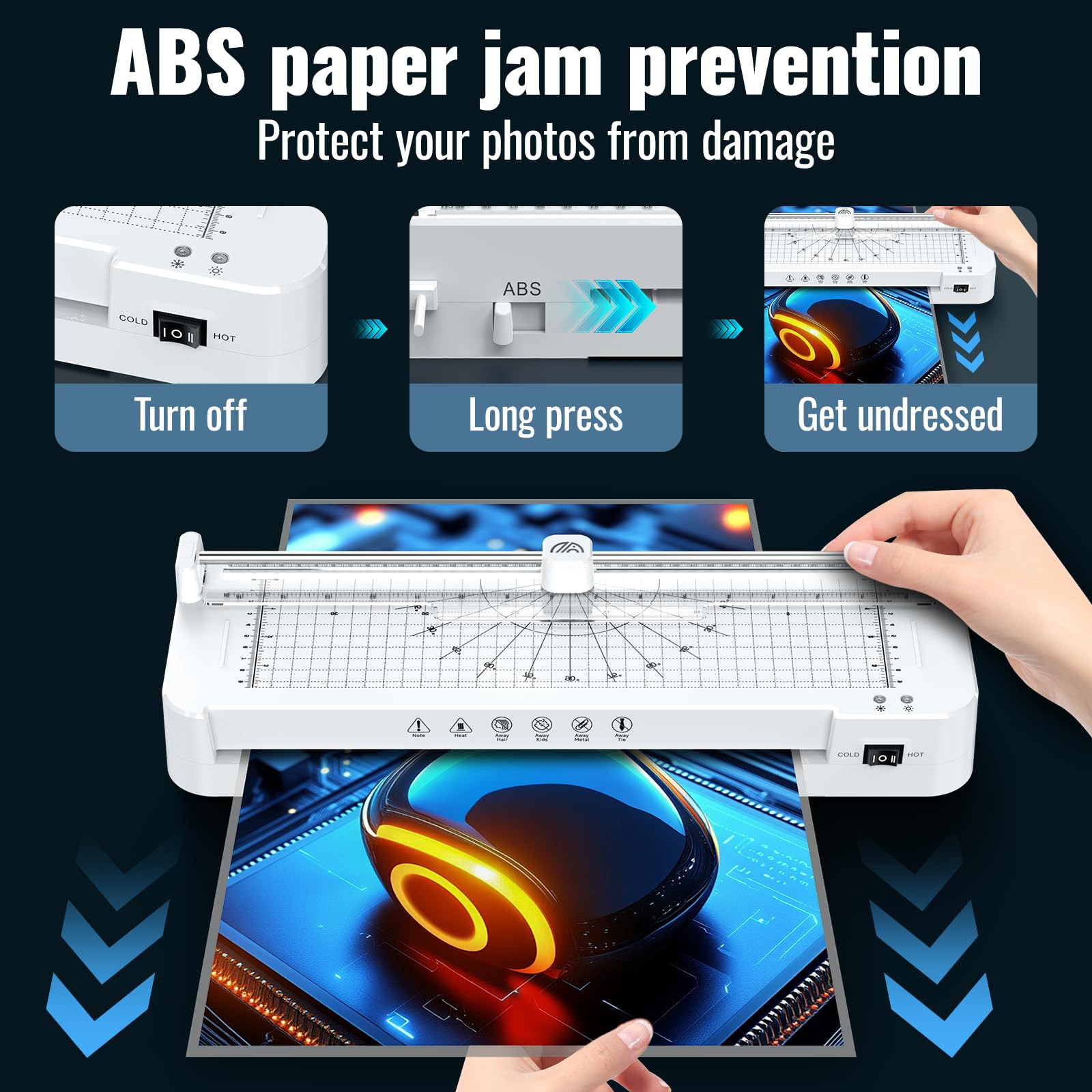 【Laminator Machine with 50pcs Laminating Sheets】This 13 in laminator comes with the most useful accessories: paper cutter, corner rounder, with 50 hot laminating pouches for longer use.(10 A3/10 A4/10 A5, 20 A6) 【Dual Roll System & Intelligent Protection】Laminator upgraded system ensures bubble- and wrinkle-free performance, with 1-2min preheating and 360mm/min speed, the machine gives a smooth lamination. Safety first, with an auto shut-off function,it lasts longer than ordinary laminator. 【Compatible With Most Pouches】This laminator machine features a 330mm/13-inch wide inlet, which is suitable to laminate A3/A4/A5/A6/A7 size pouches. It is compatible with 3mil-5mil/80-125mic laminating pouches. painting, menu, business letter, certificate, photo, label. 【ABS Paper Jam Prevention】Getting rid of paper jam issues with innovative ABS paper release lever, it eliminates your worries in 3 steps: turn off the laminator first, push and hold the ABS lever, pull the stuck pouch out. Furthermore, it boosts your work flow for high efficiency. 【Cold & Thermal Lamination Modes】Hot mode is suitable for most documents. Cold mode is ideal to laminate heat-sensitive ink and paint to protect the color from fading or melting. 【2-Year】We provide a 2-year that allows you to request a product return or a refund for quality problems. If you have any problems or need any help, please contact us. We will get back to you ASAP.