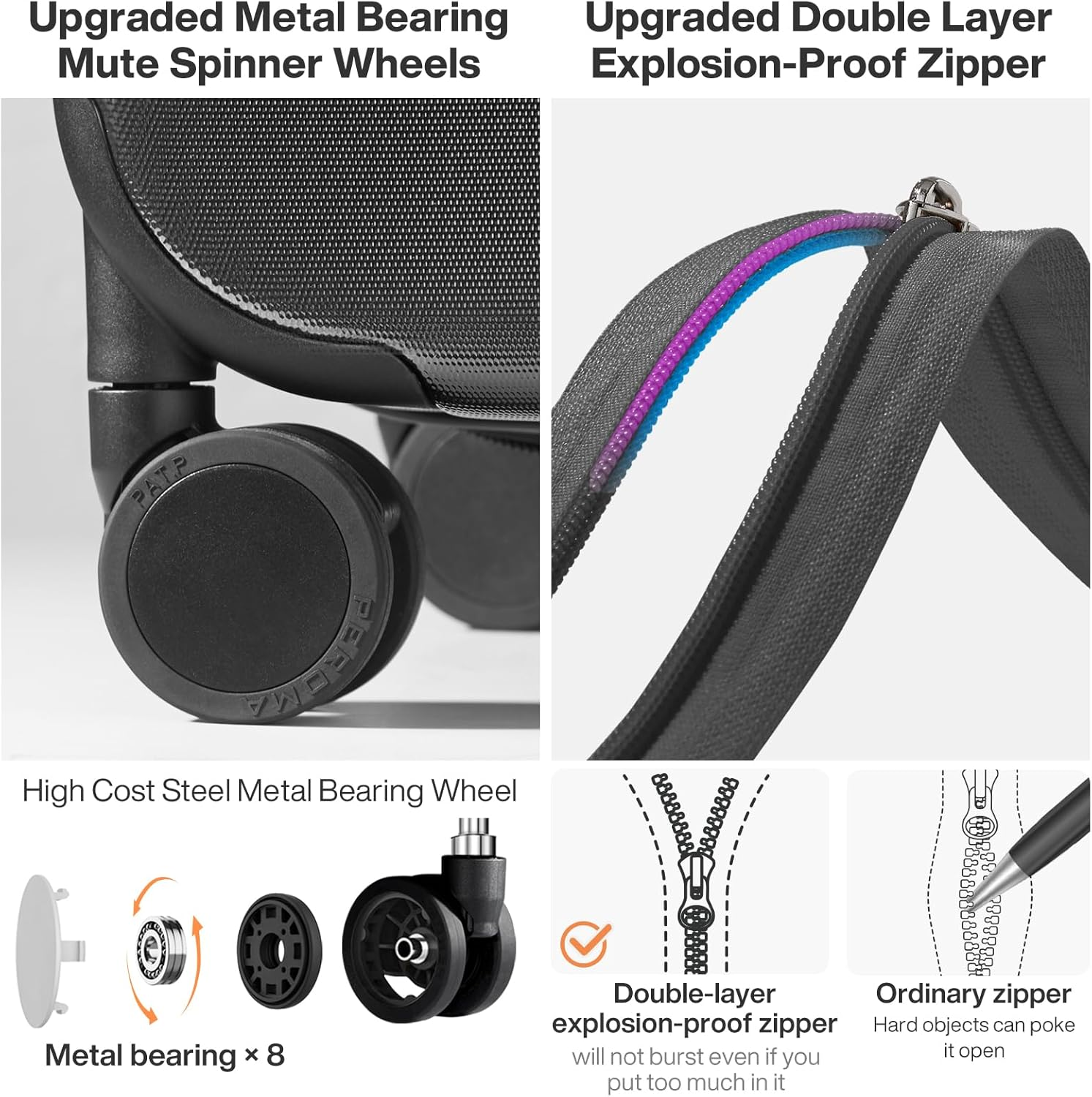 This carry-on luggage is a game-changer for frequent travelers! The upgraded metal-bearing spinner wheels glide effortlessly, and the double-layer explosion-proof zippers add extra security. The fine grid design gives it a sleek, neutral look, while the reinforced wheel seats ensure durability. Perfect size for underseat storage, making travel hassle-free. Highly recommend for both style and functionality!