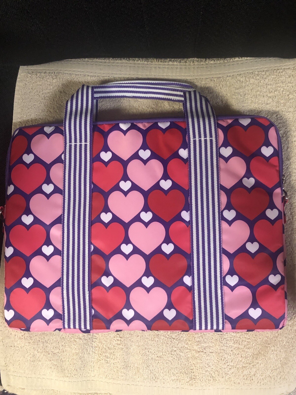 14” Laptop Bag (includes Shoulder Strap) (Great Condition) (Purple With Hearts). Has adjustable shoulder strap