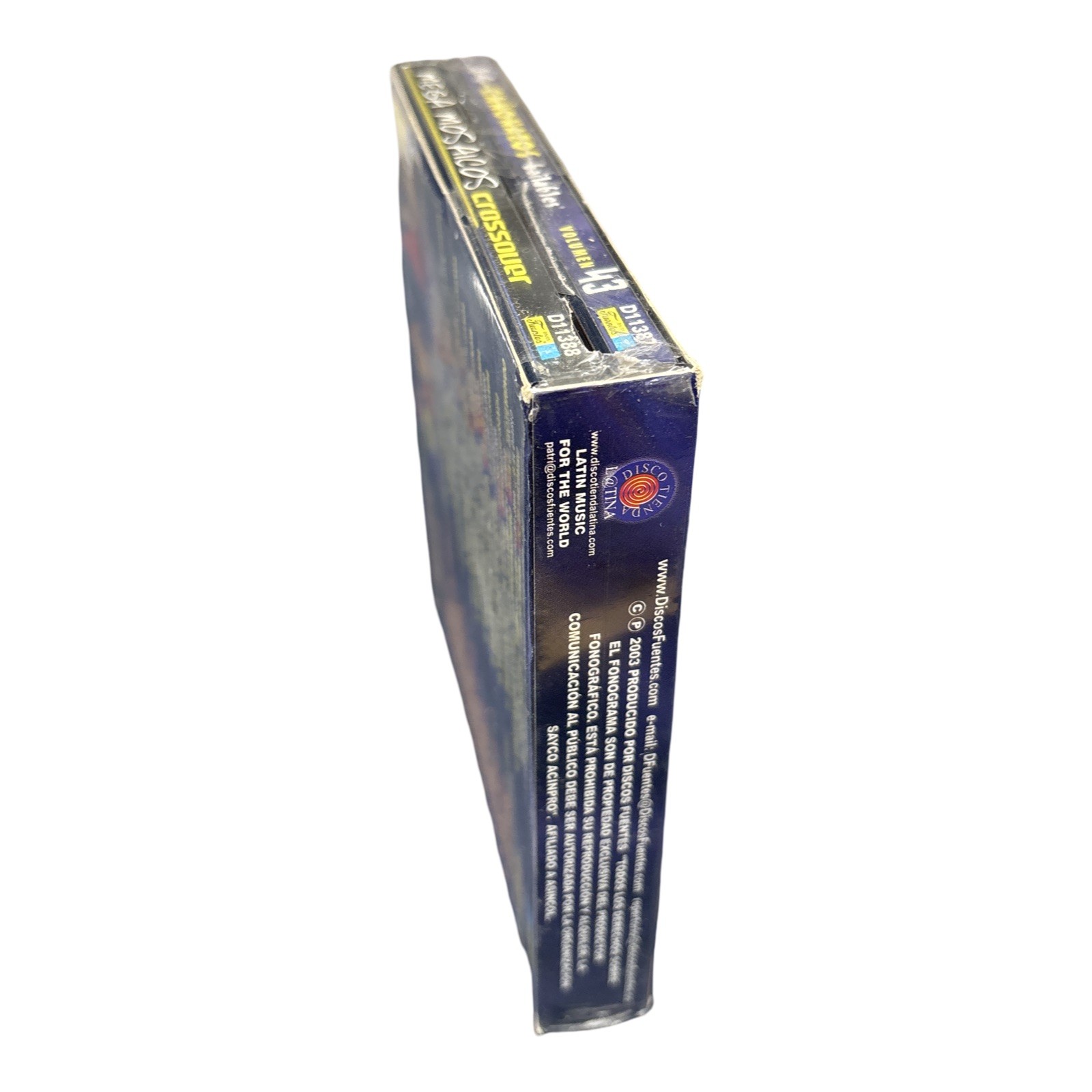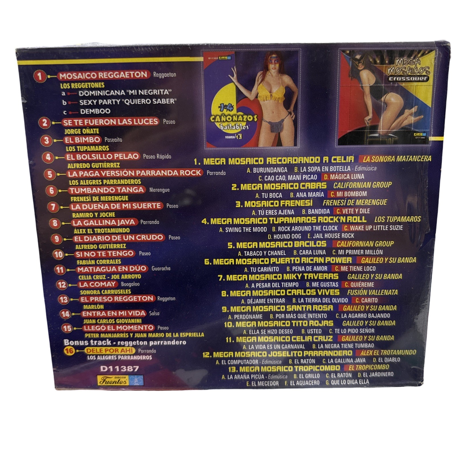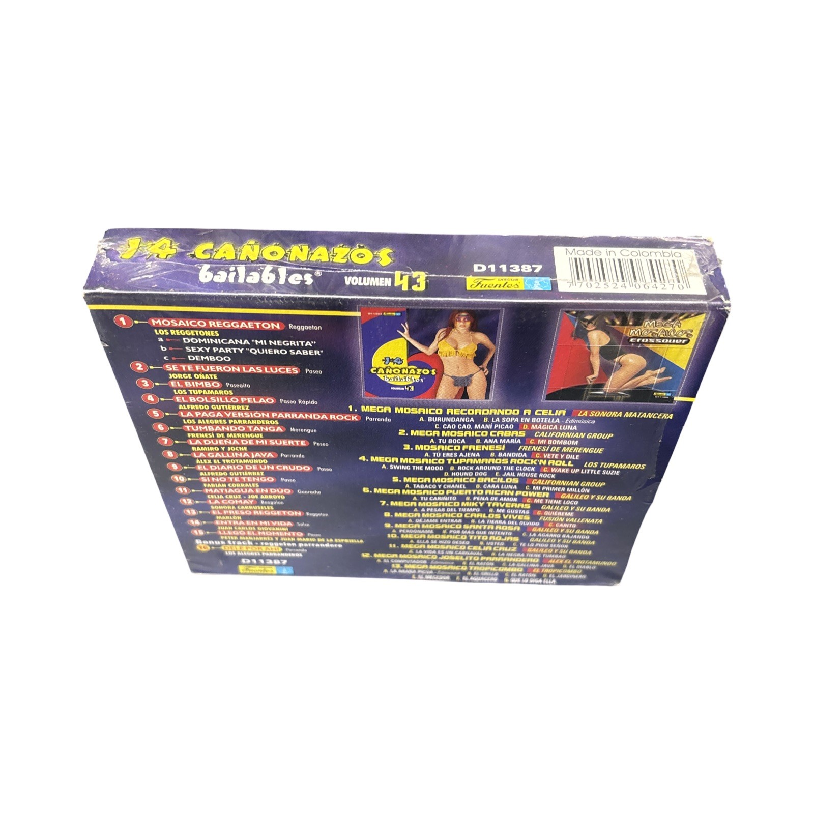 The product is a CD titled "14 Canonazos Bailables Vol.43" by various artists such as Jorge Onate, Los Tupamaros, Alfredo Gutierrez, and Sonora Carruseles. Released by Discos Fuentes, this CD features a mix of Vallenato and Salsa/Merenge genres, making it a compilation of greatest hits. The CD also includes a bonus CD of Mega Mosaicos Crossover, offering a diverse selection of music for fans of these popular Latin music styles.