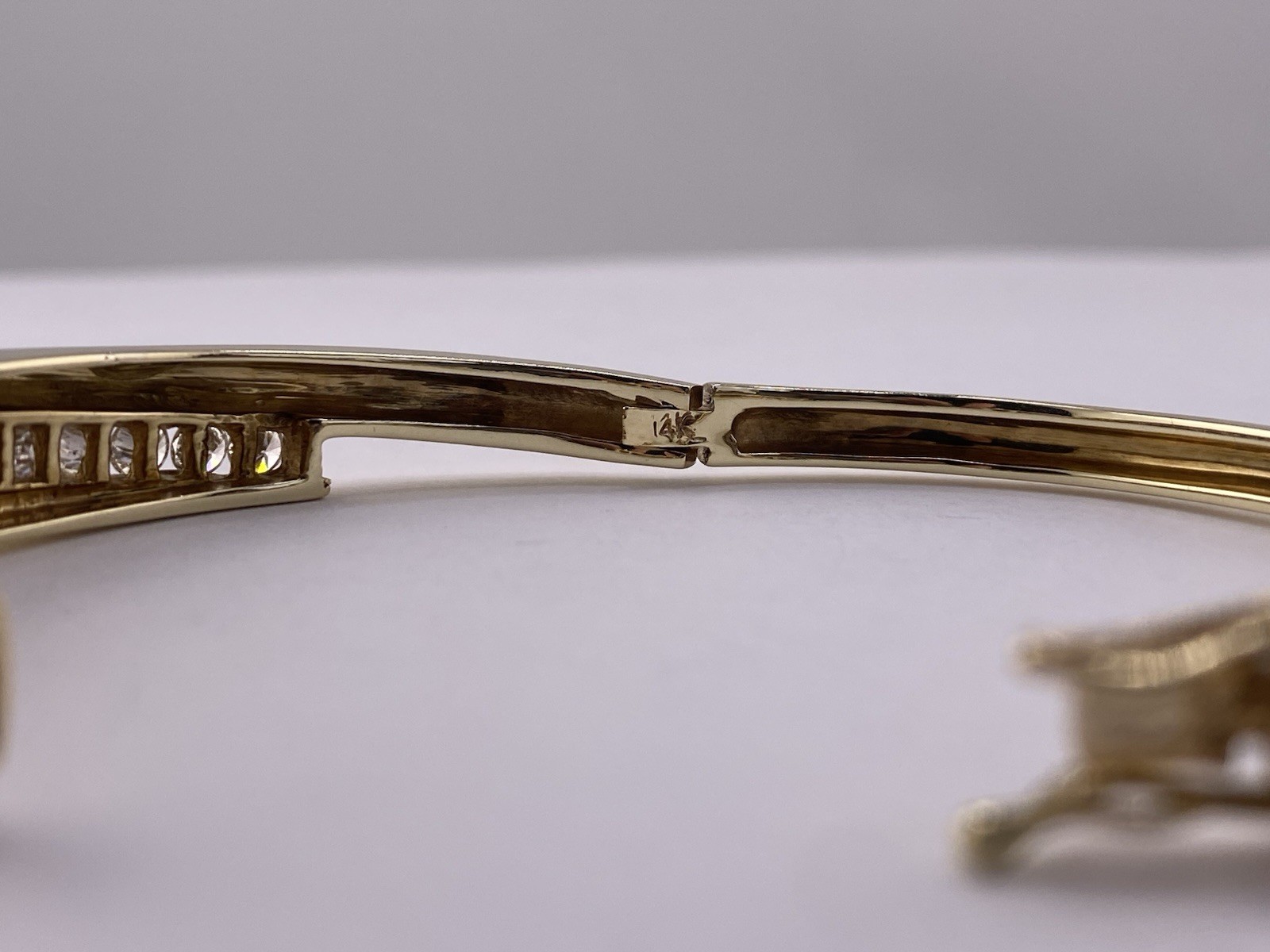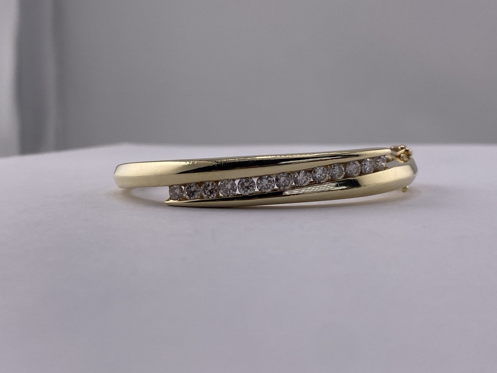 This 14K gold bangle bracelet is the perfect addition to your jewelry collection. With 13 dazzling diamonds weighing a total of 2.07 carats, this bracelet is sure to catch the eye of anyone who sees it. The diamonds are of excellent cut grade, I1-I2 clarity grade, and I-K color grade, making them sparkle and shine brightly. The bangle is made of high-quality yellow gold with a purity of 14k, ensuring durability and long-lasting wear. Measuring 6.5 inches in length, this bracelet is perfect for any occasion and will go well with any outfit. The brand of this bracelet is 14K, making it a valuable and exquisite piece of fine jewelry. 14K Gold Length 6.5 Weight 31.75 Primary stone: Diamond Stones Shape: Round brilliant cut Stone’s Dimensions: 3.40-3.50 mm Total primary stones carat weight: 2.07 ctw Primary stones color grade: I-K Primary stones Clarity Grade: I1-I2 Please note that the bracelet is preloved, minor scratches on gold.